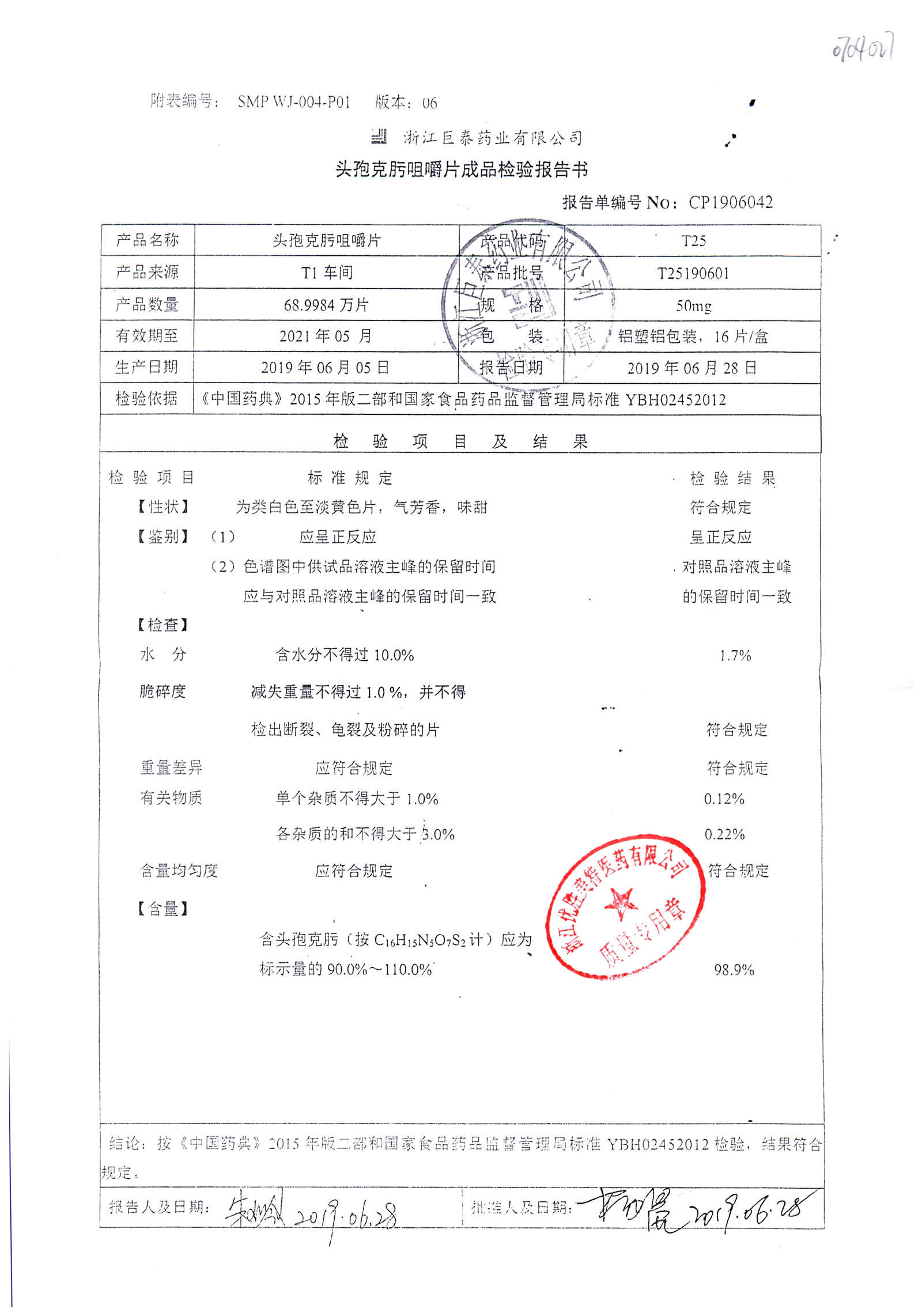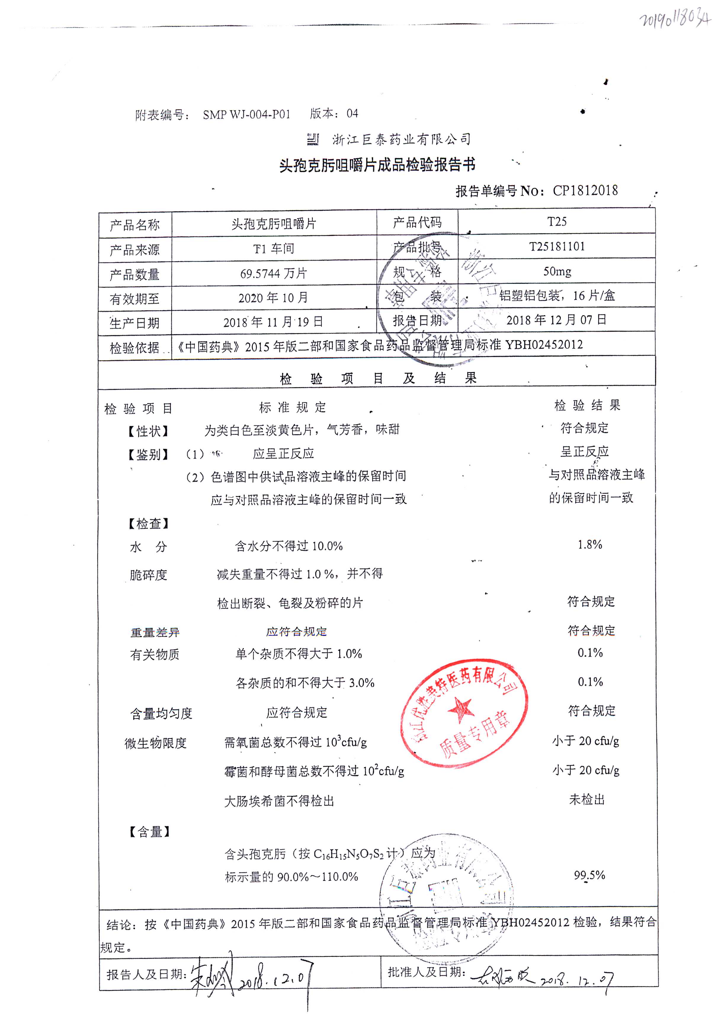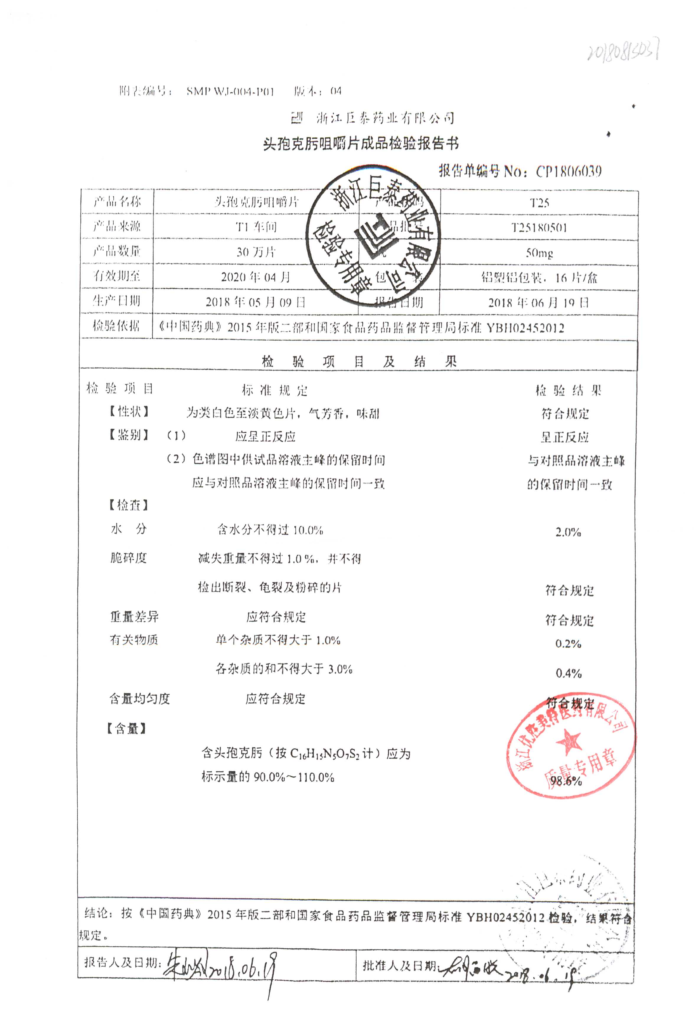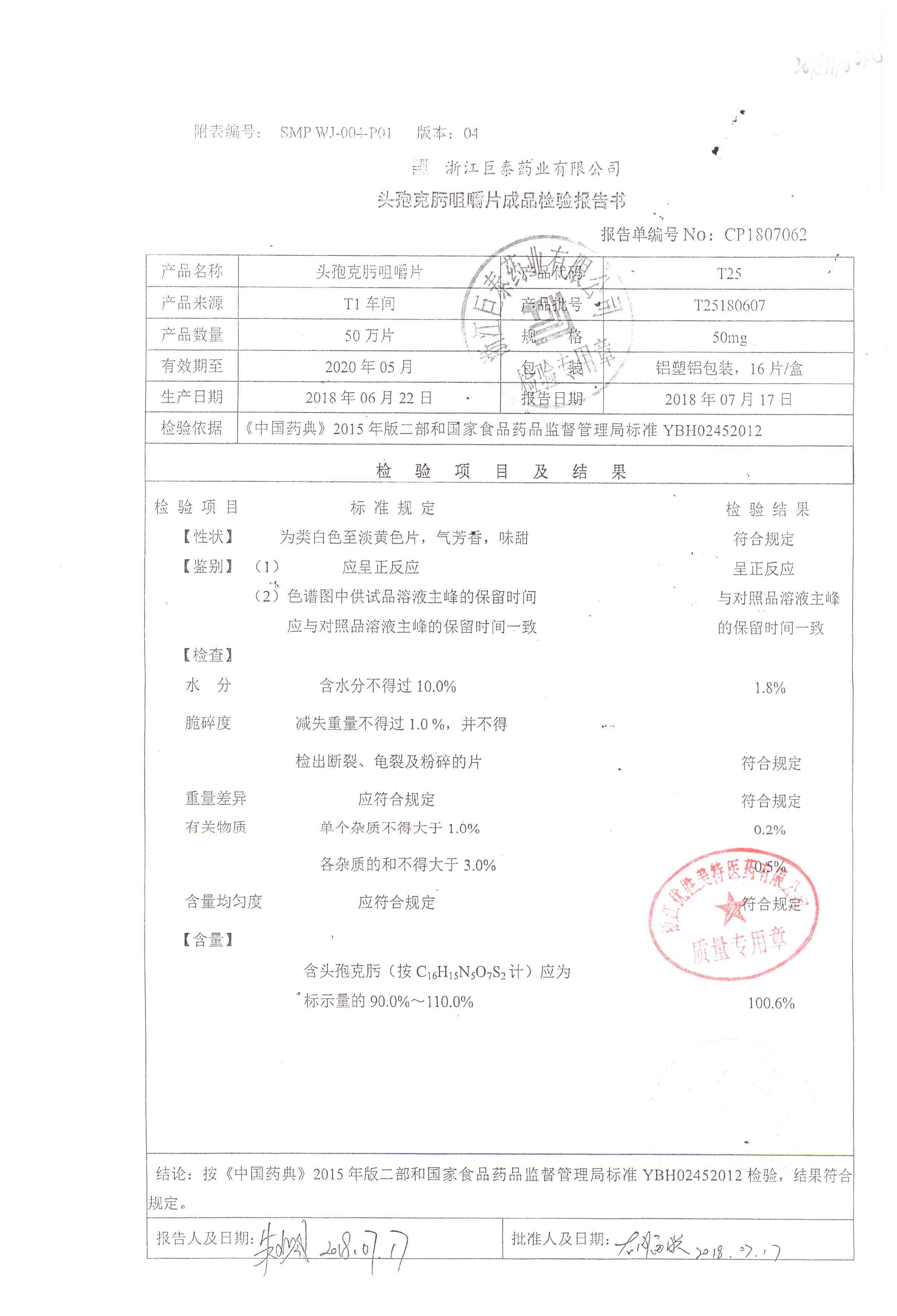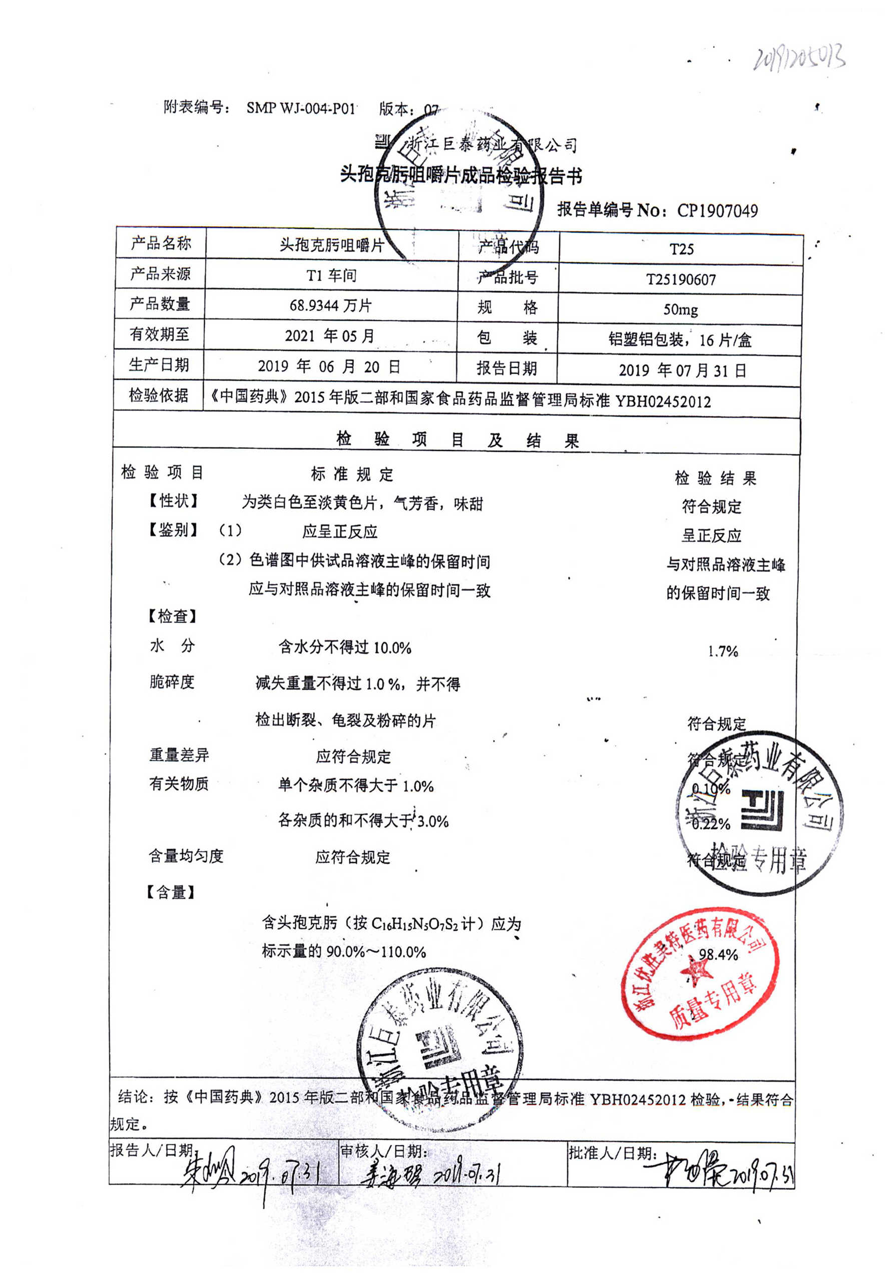 頭孢克肟咀嚼片 | 50mg*16s | T25190601 | 查看詳情 |