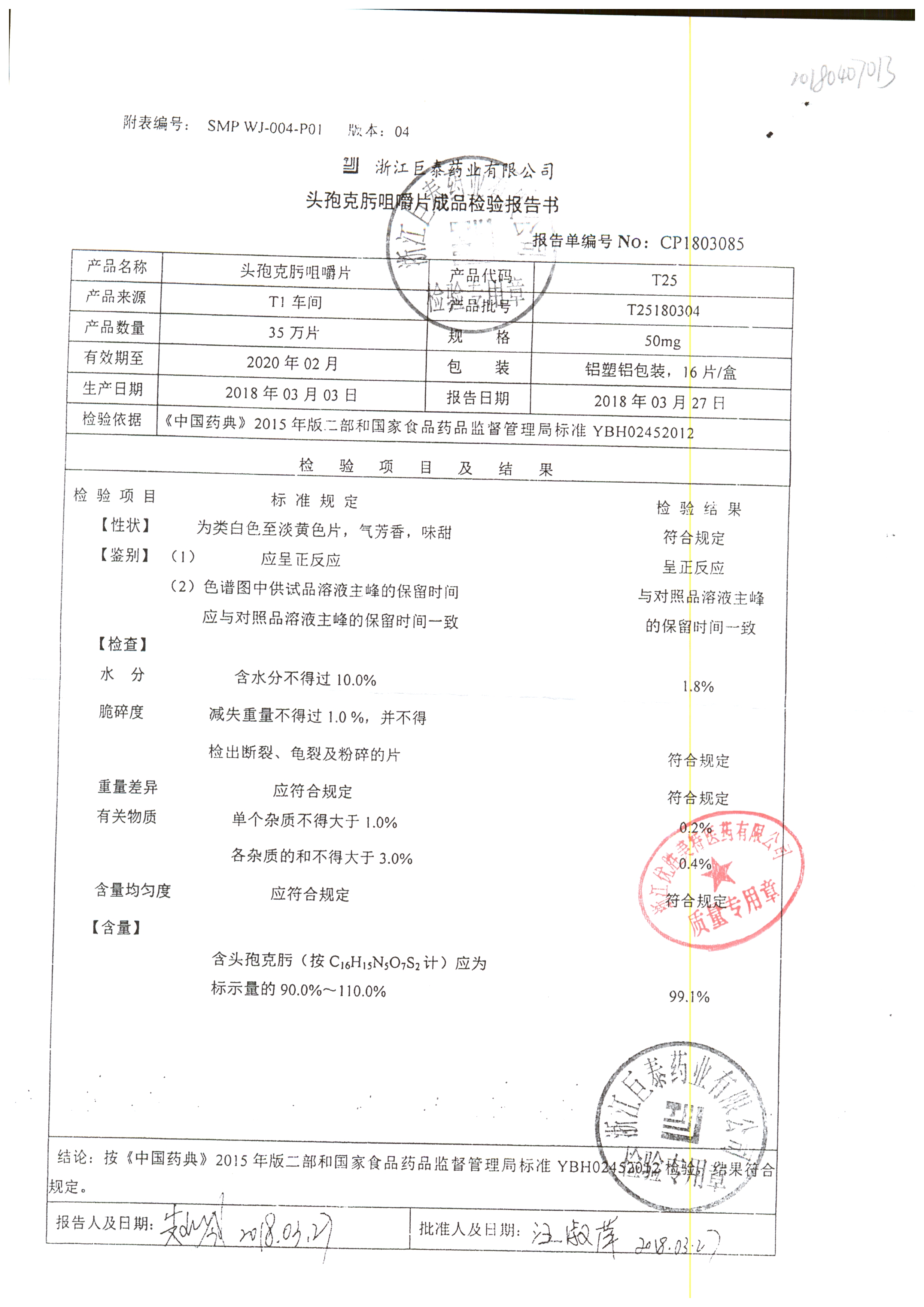 頭孢克肟咀嚼片 | 50mg*16s | T25180607 | 查看詳情 |