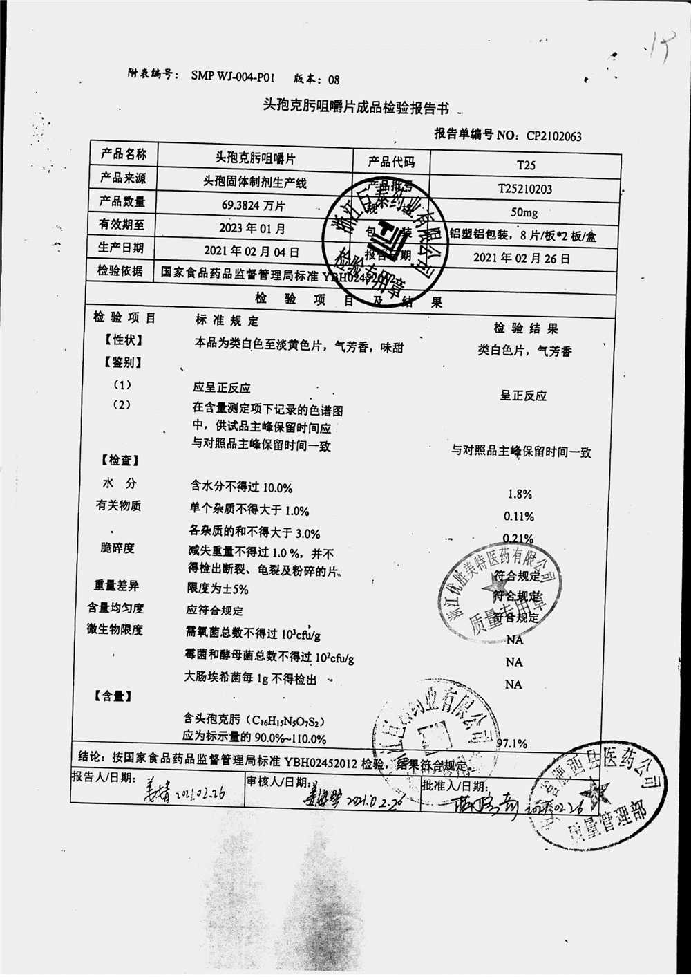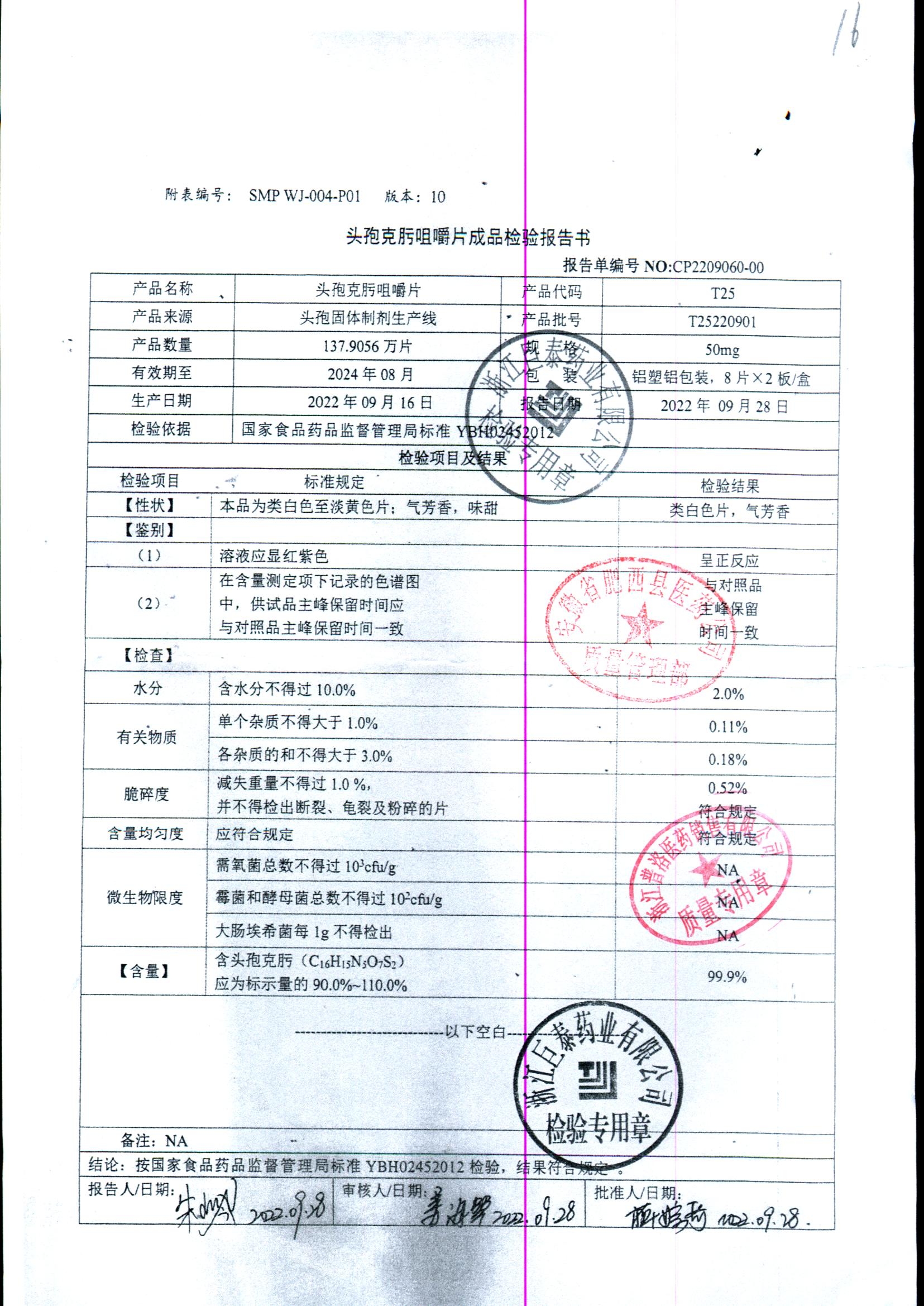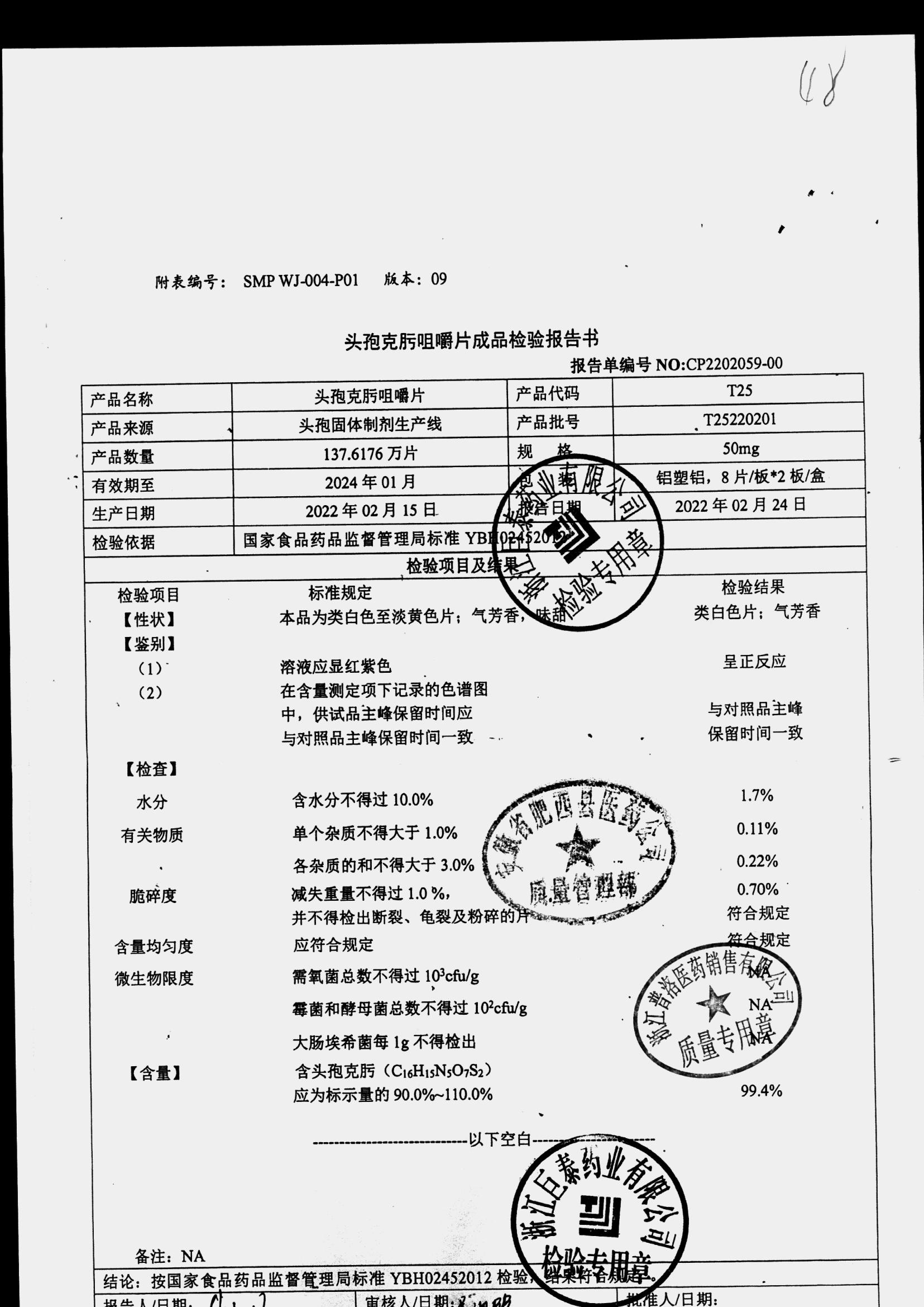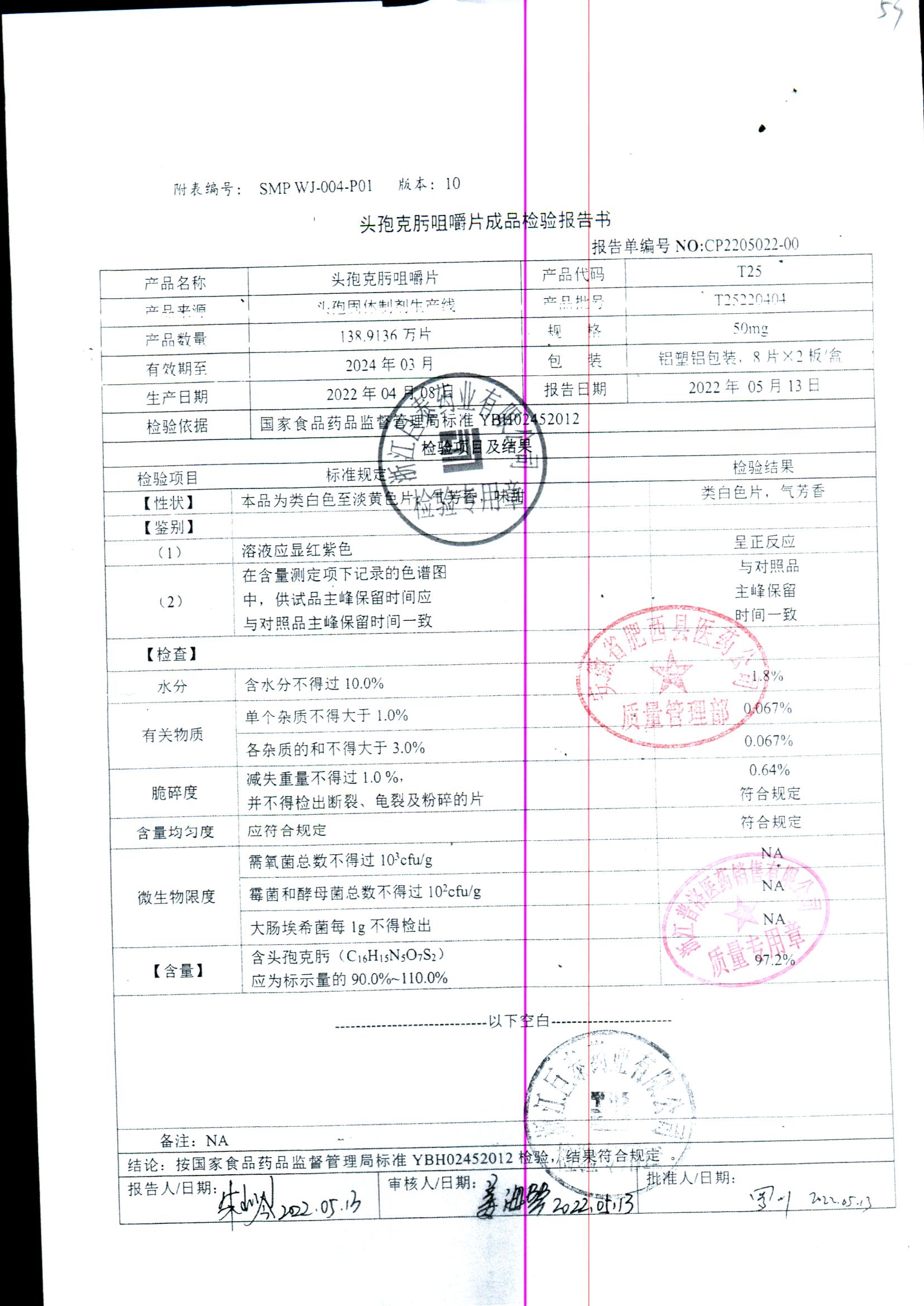 頭孢克肟咀嚼片 | 50mg*16s | T25210203 | 查看詳情 |