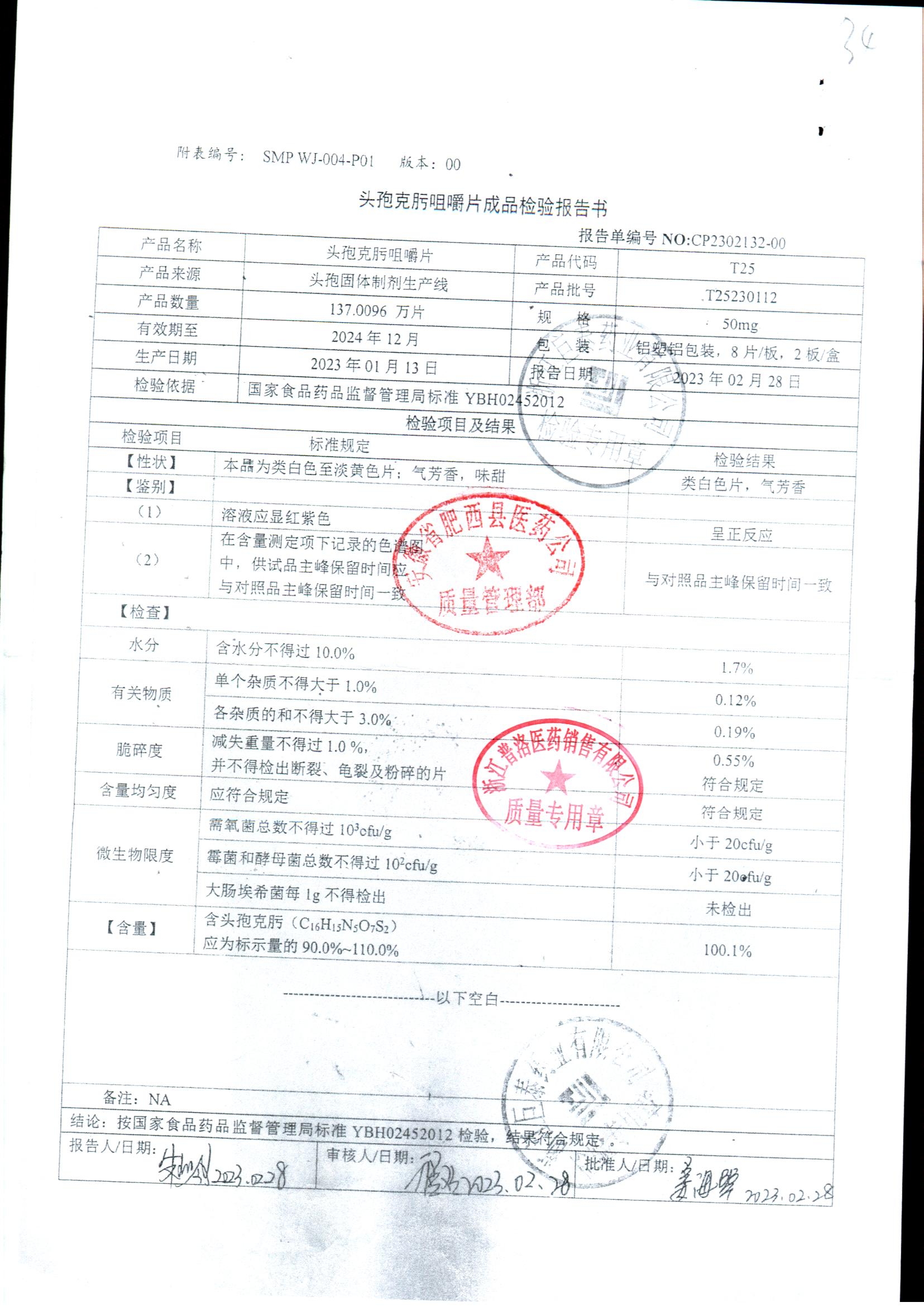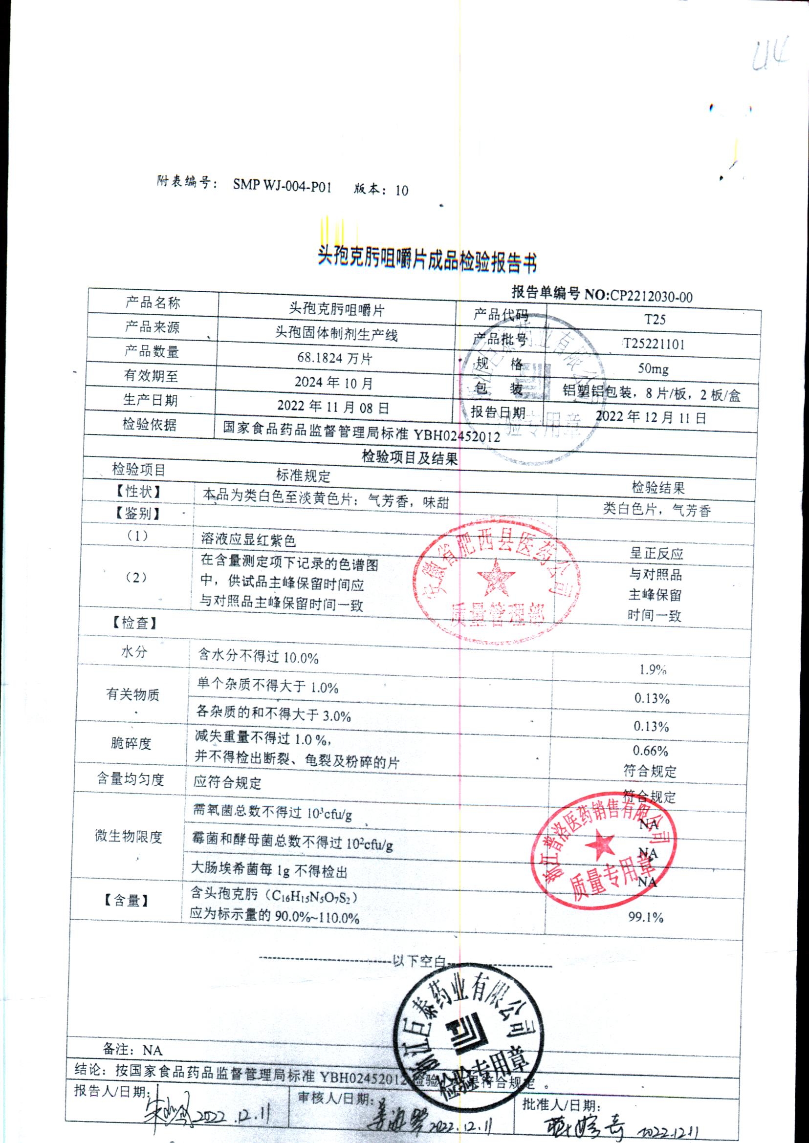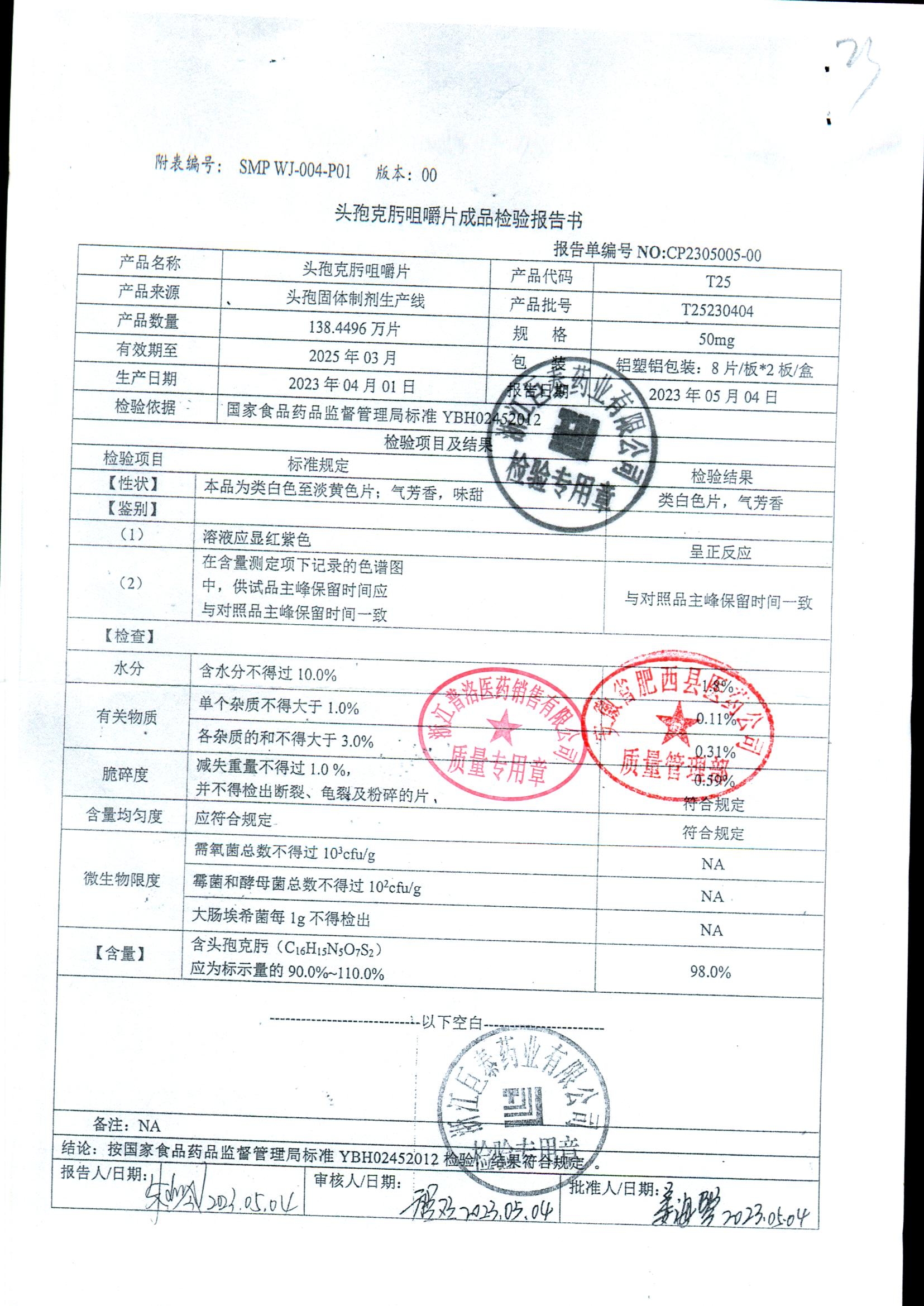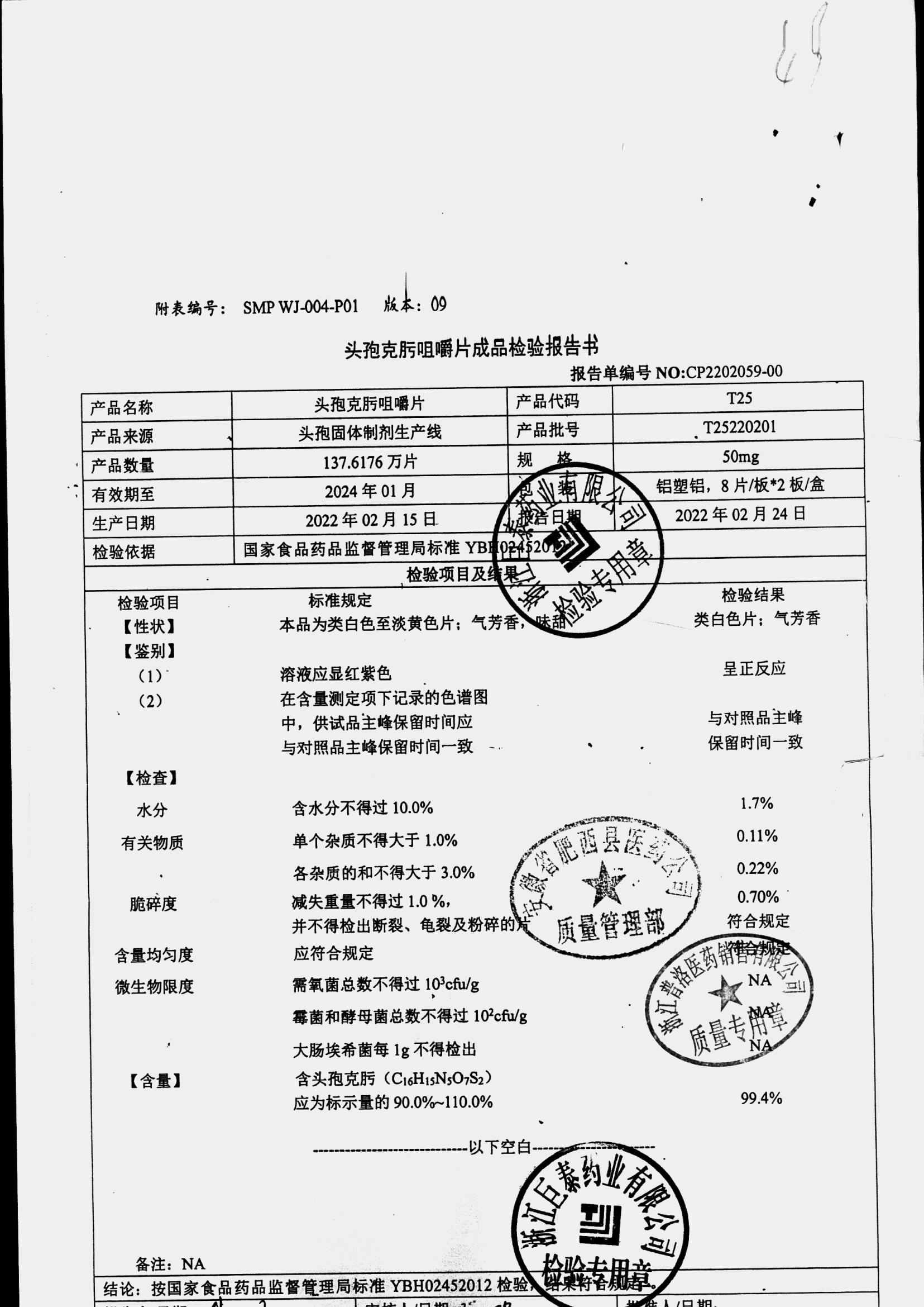 頭孢克肟咀嚼片 | 50mg*16s | T25210203 | 查看詳情 |