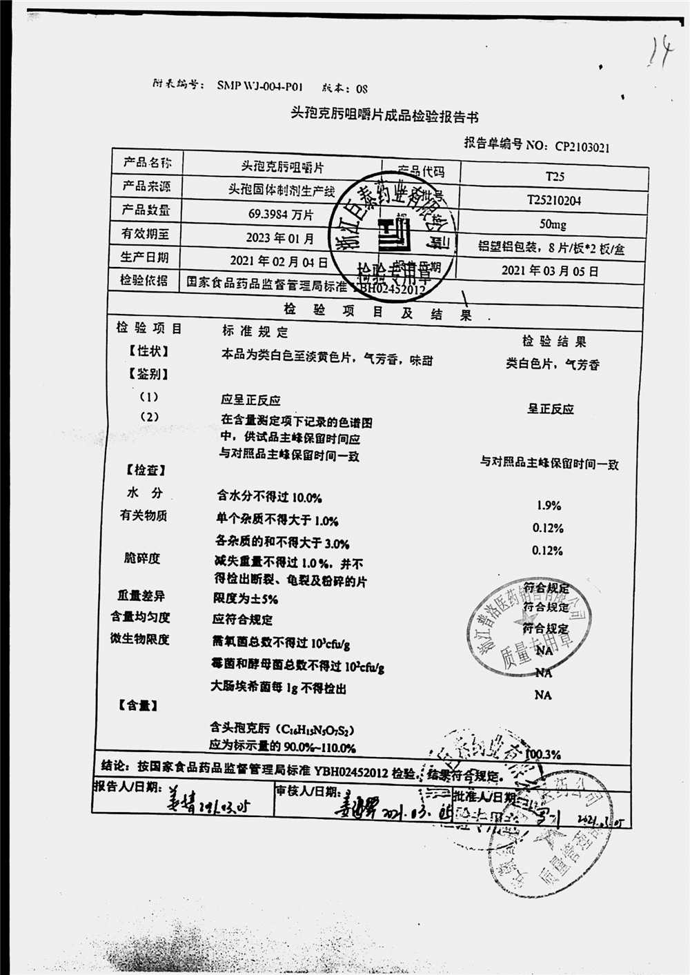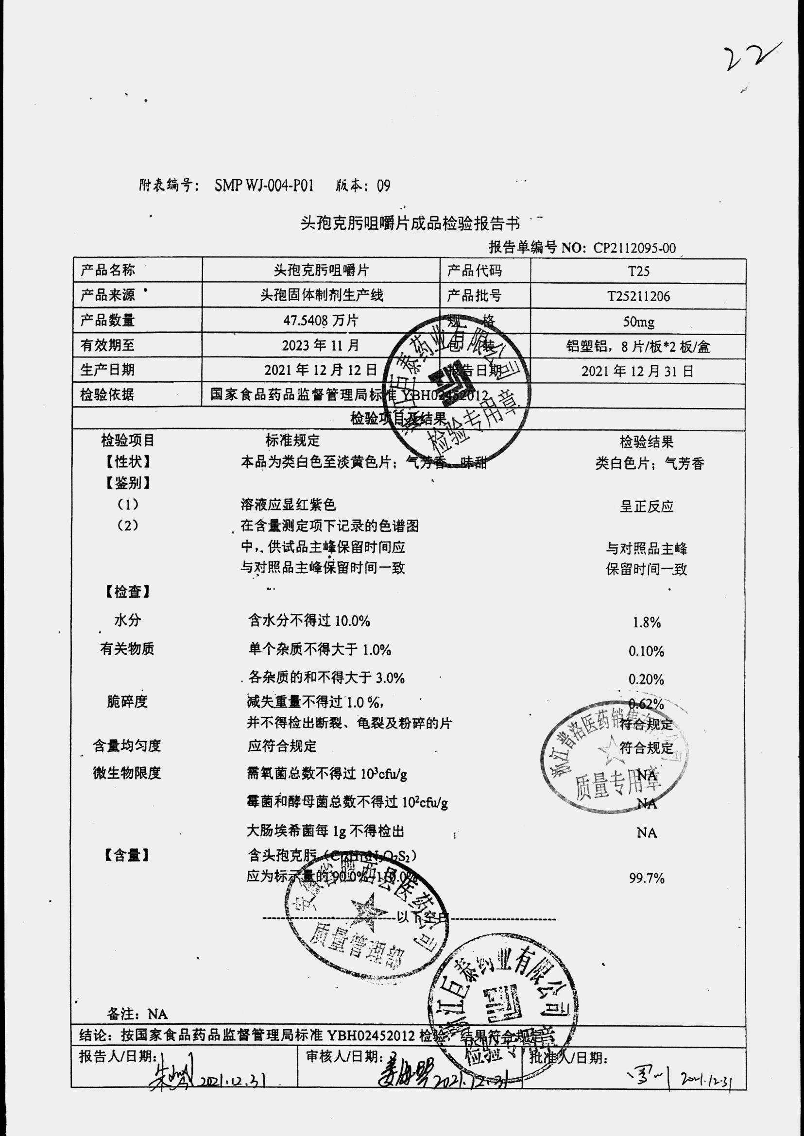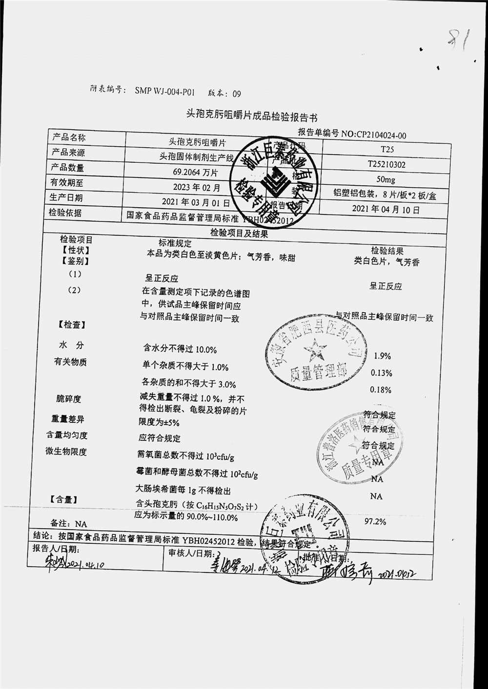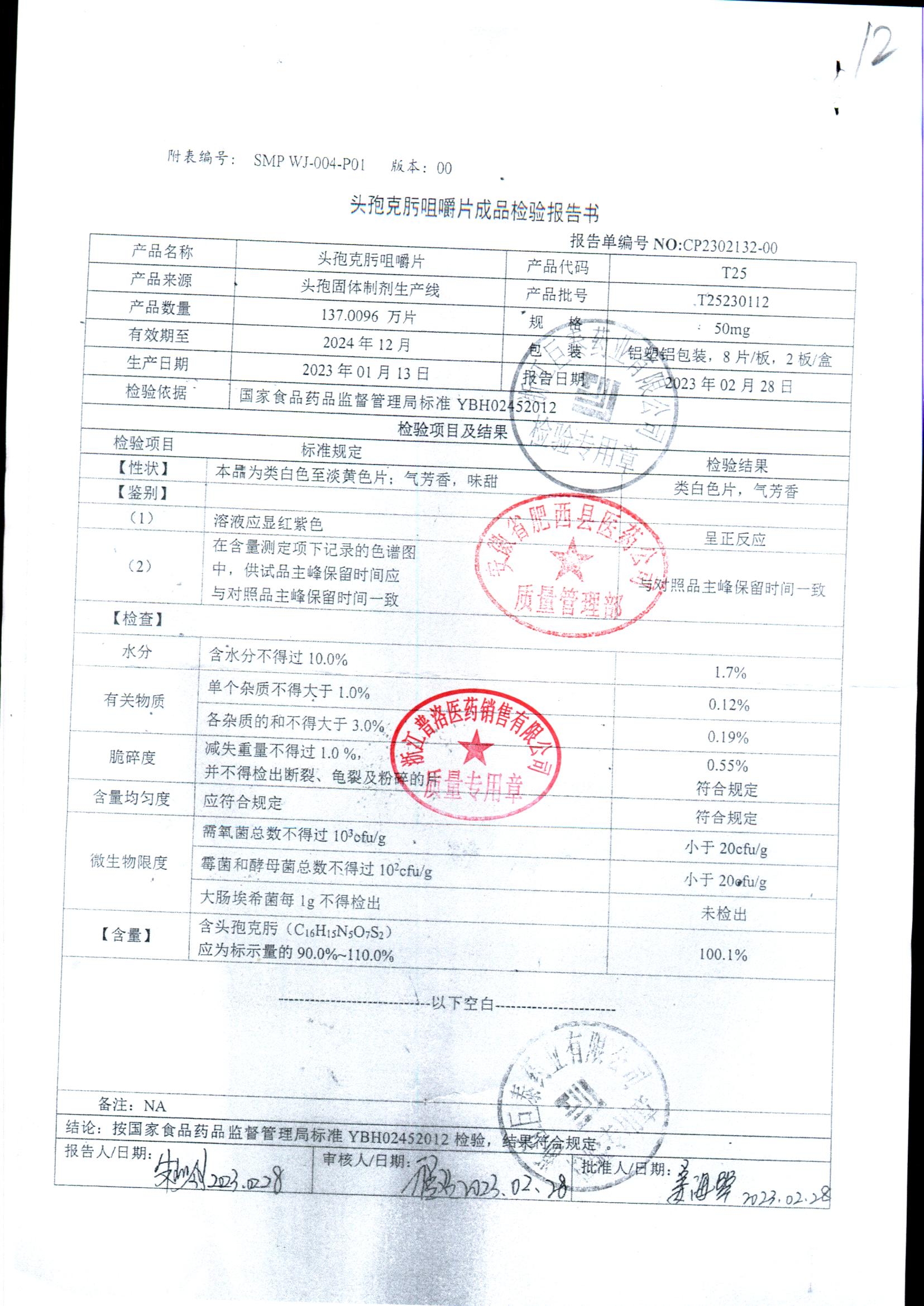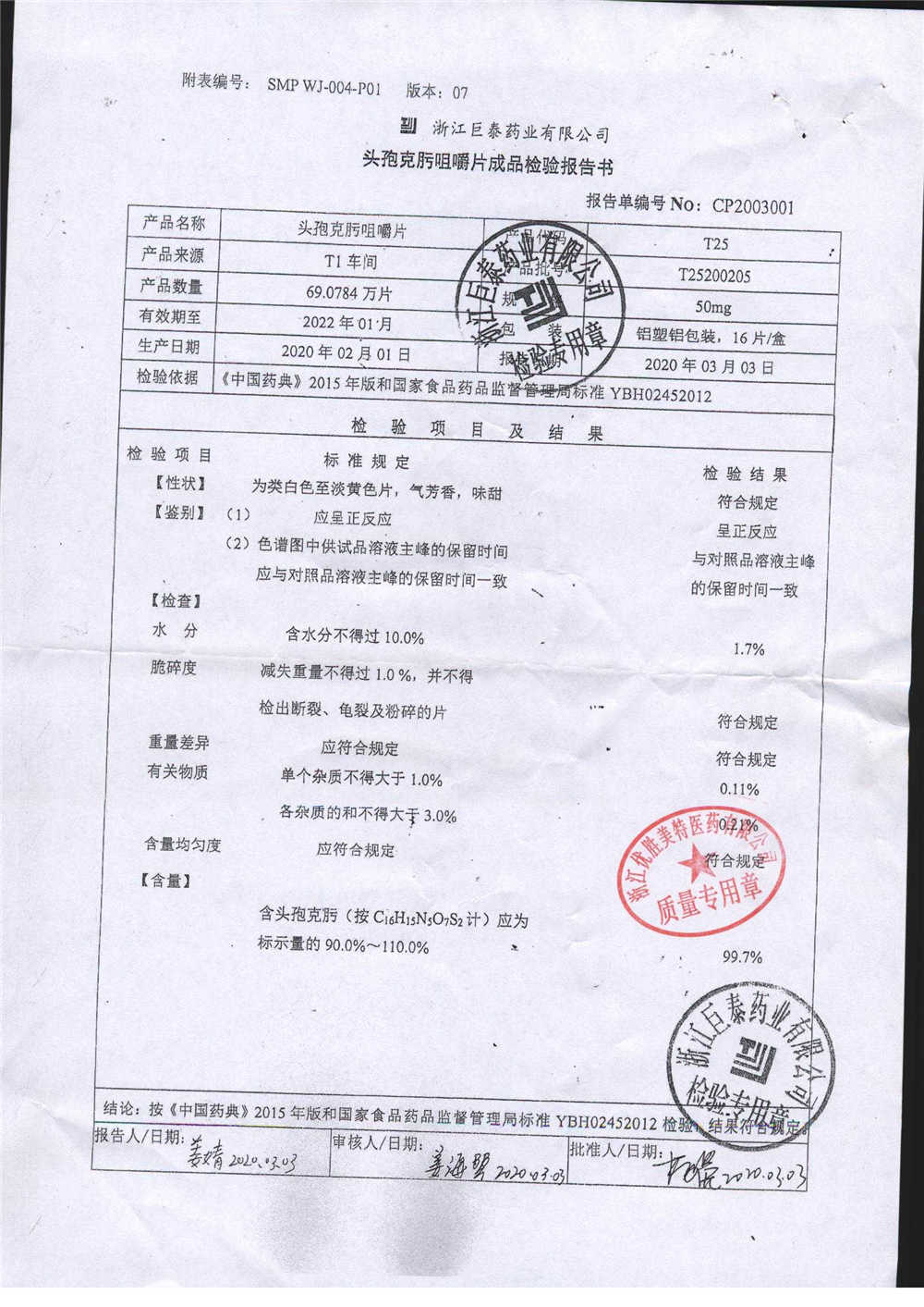 頭孢克肟咀嚼片 | 50mg*16s | T25210203 | 查看詳情 |