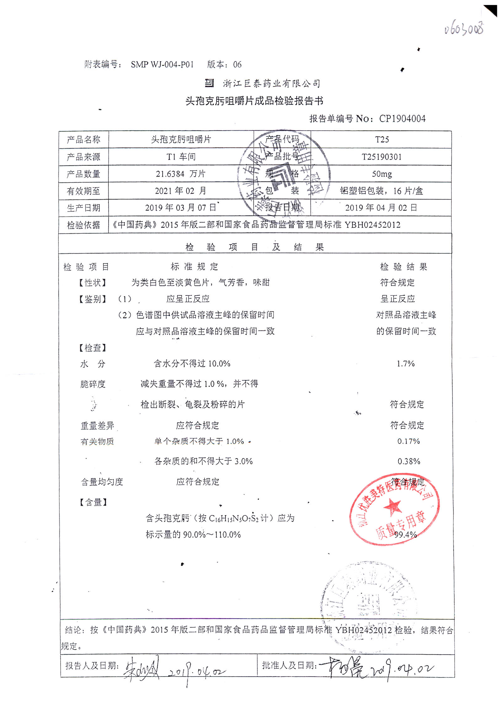 頭孢克肟咀嚼片 | 50mg*16s | T25190301 | 查看詳情 |