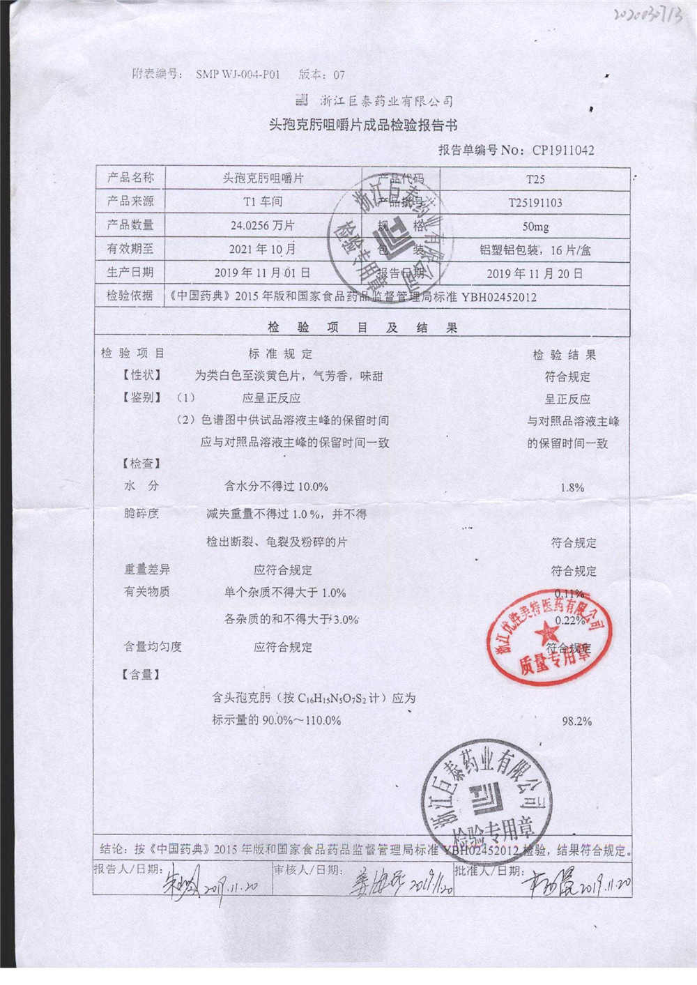 頭孢克肟咀嚼片 | 50mg*16s | T25191103 | 查看詳情 |