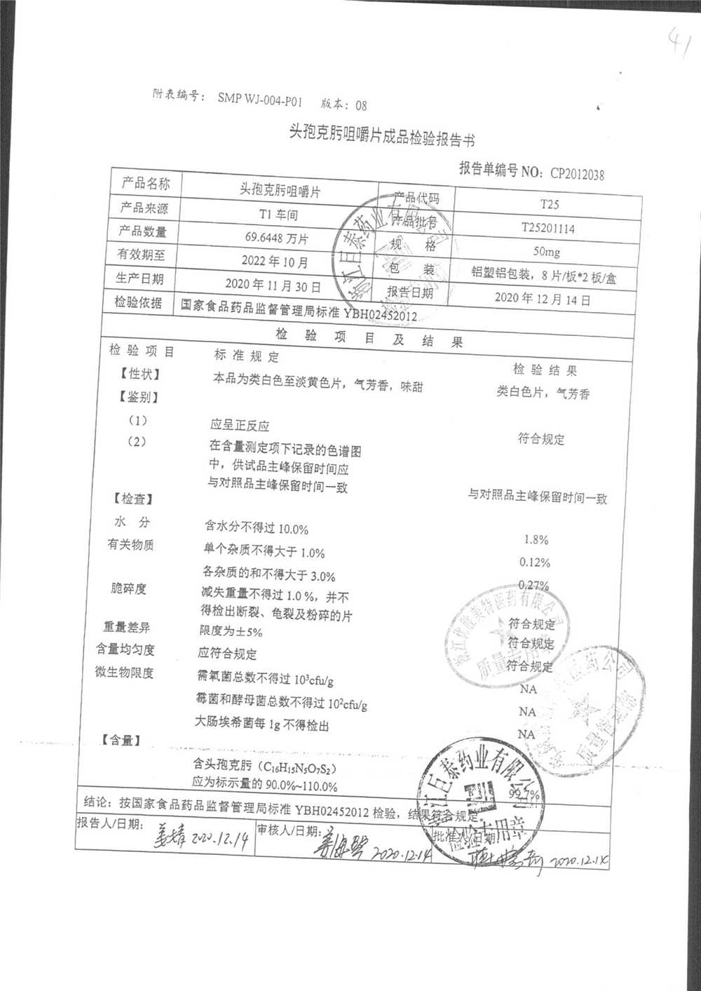 頭孢克肟咀嚼片 | 50mg*16s | T25201114 | 查看詳情 |