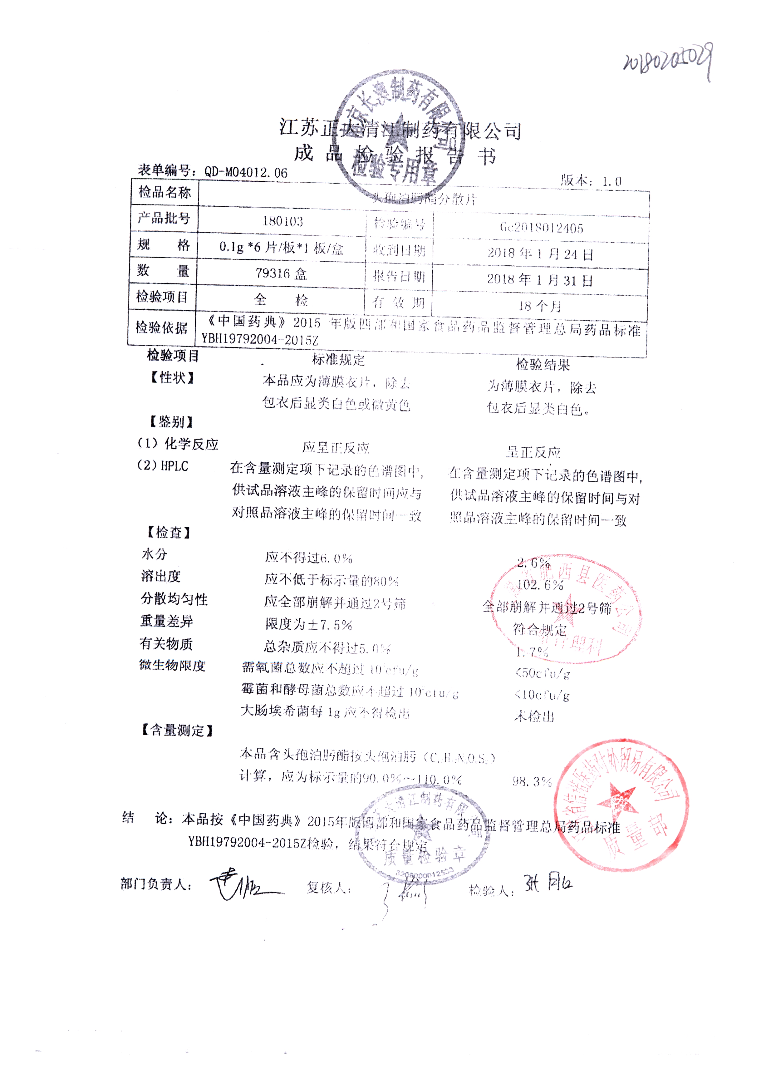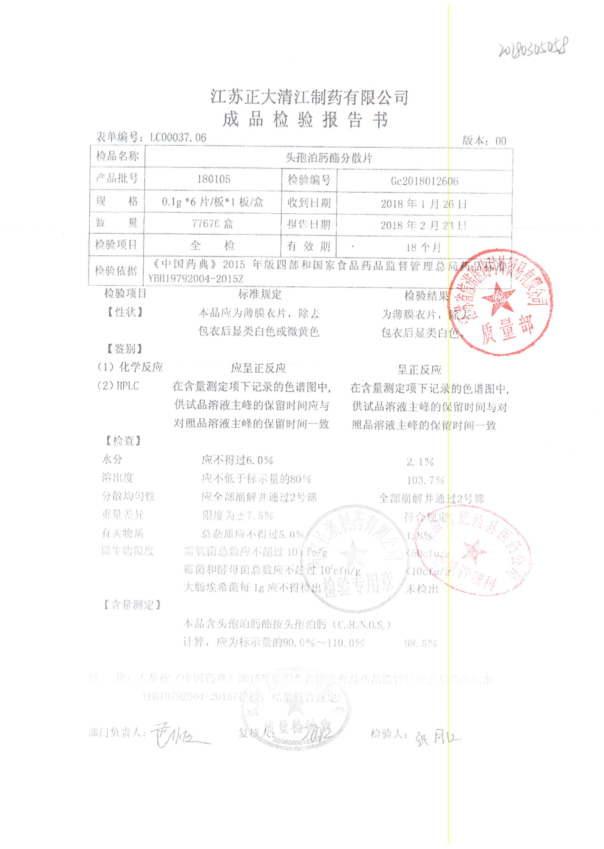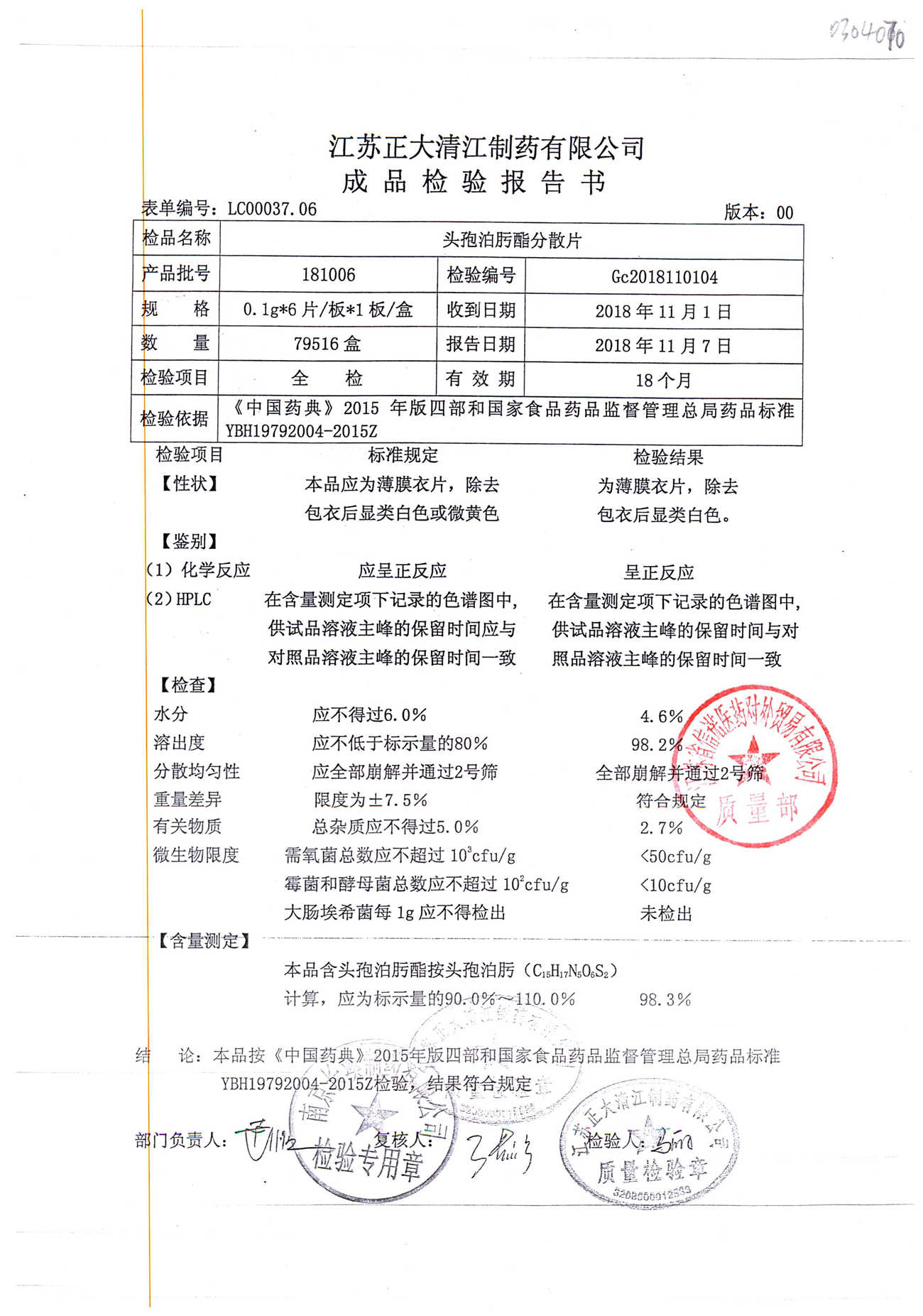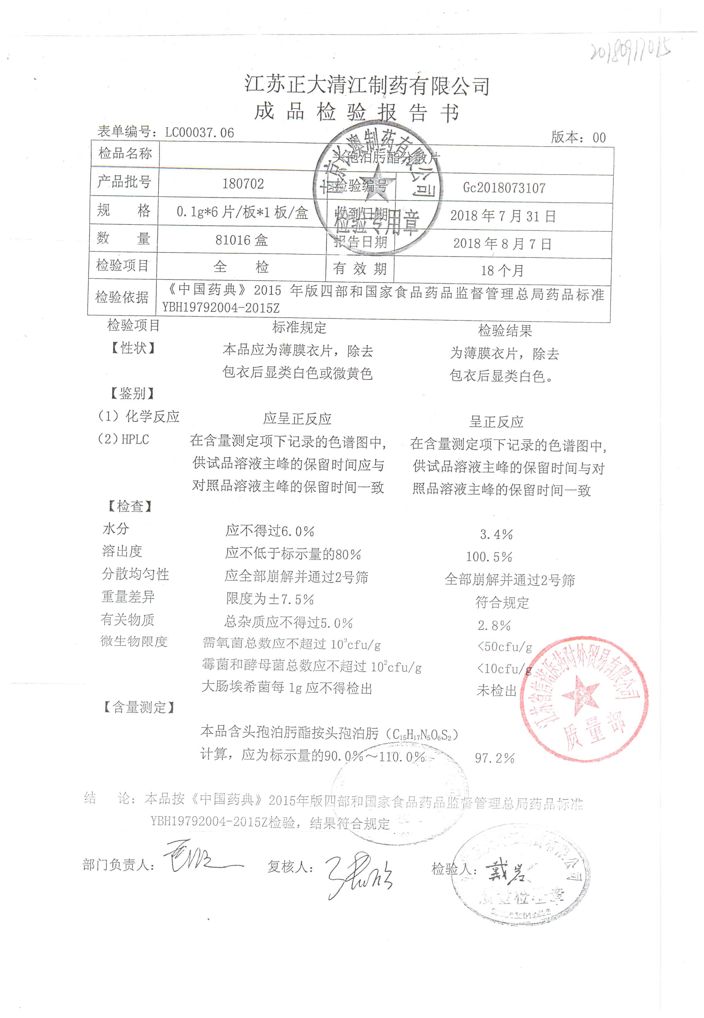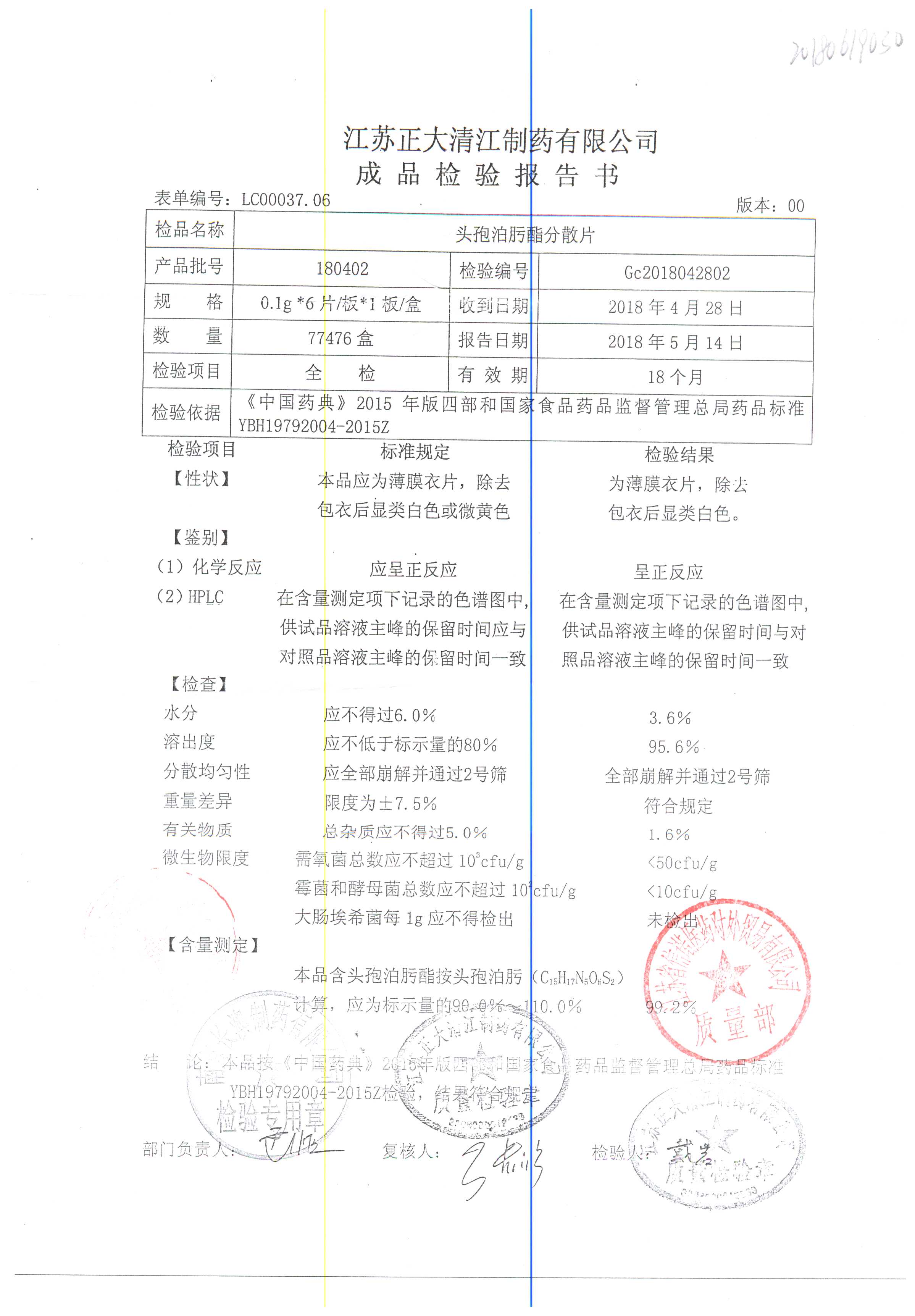 頭孢泊肟酯分散片 | 0.1g*6s | 190804 | 查看詳情 |