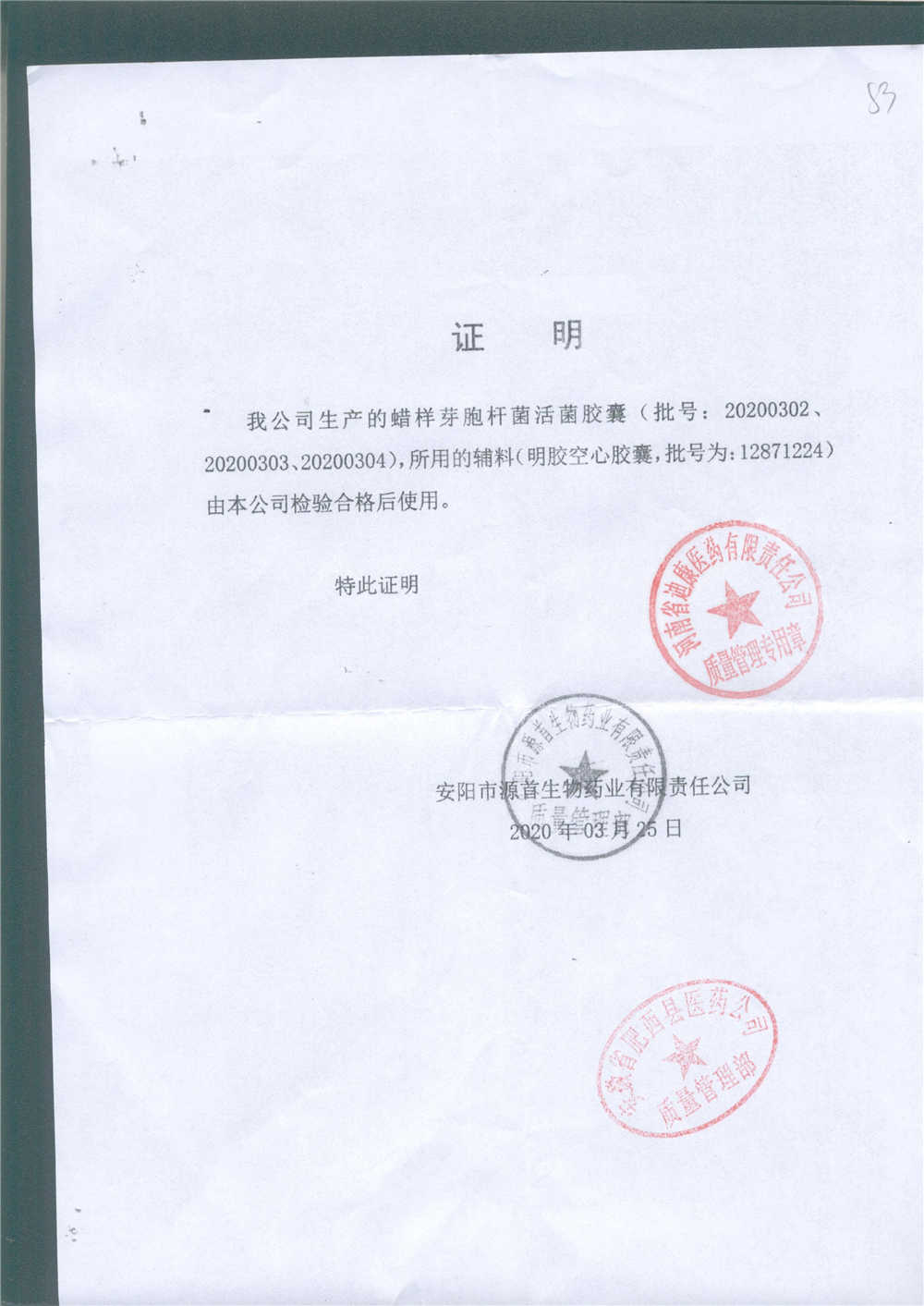 蠟樣芽孢桿菌活菌膠囊(源首) | 0.25g | 20200303(3/3) | 查看詳情 |