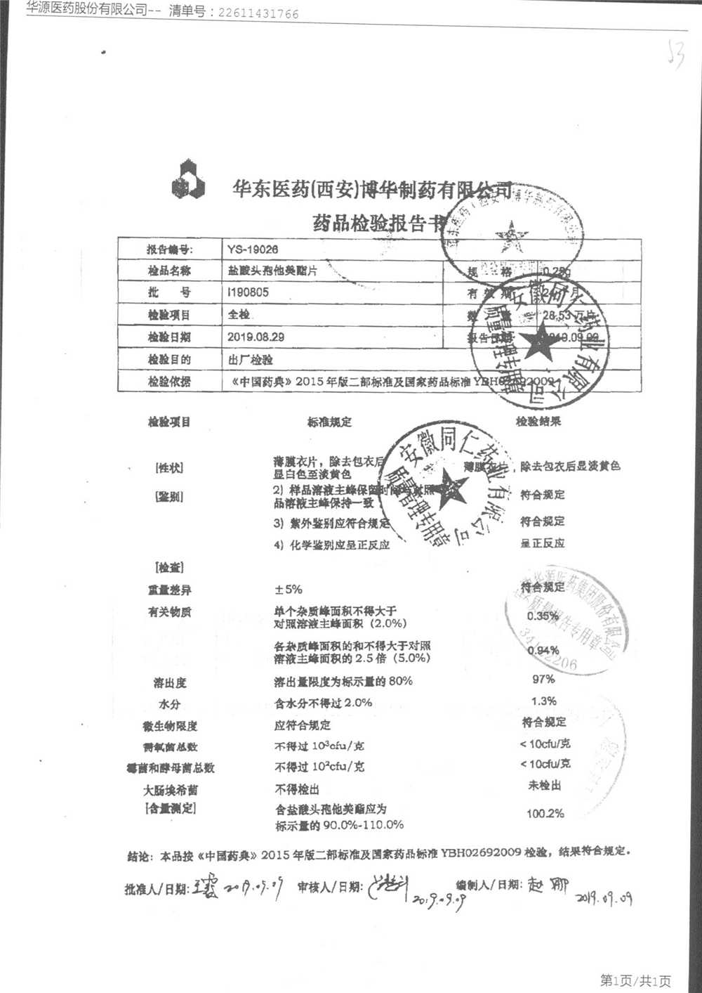 鹽酸頭孢他美酯片 | 0.25g | I190601 | 查看詳情 |