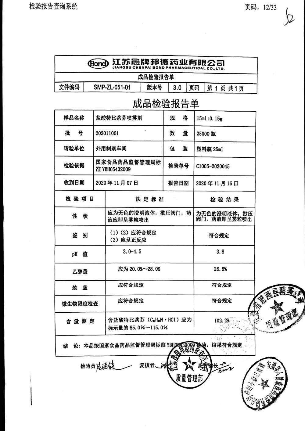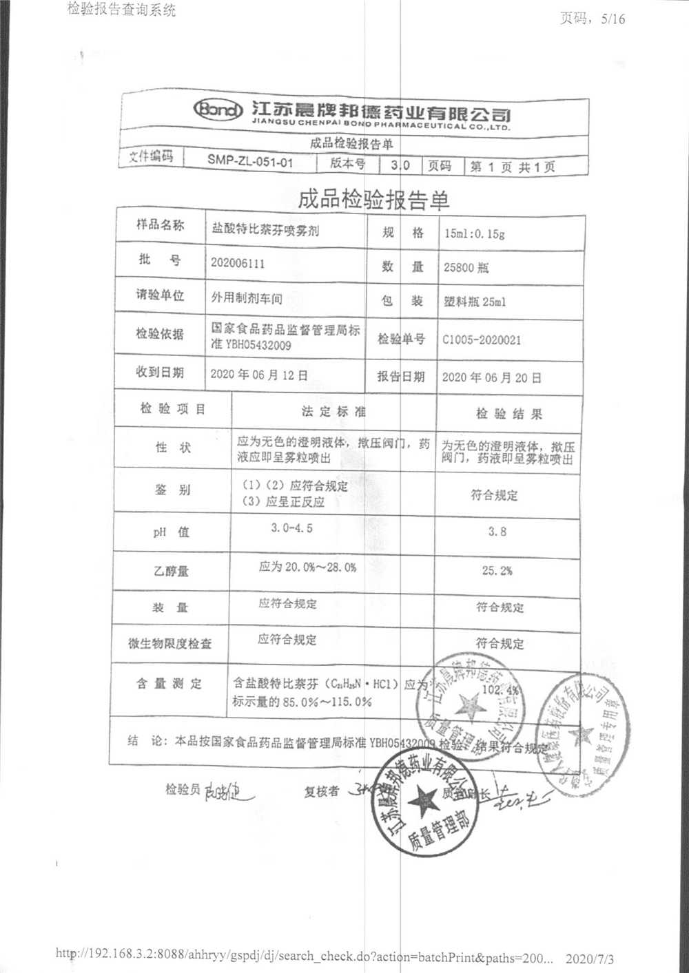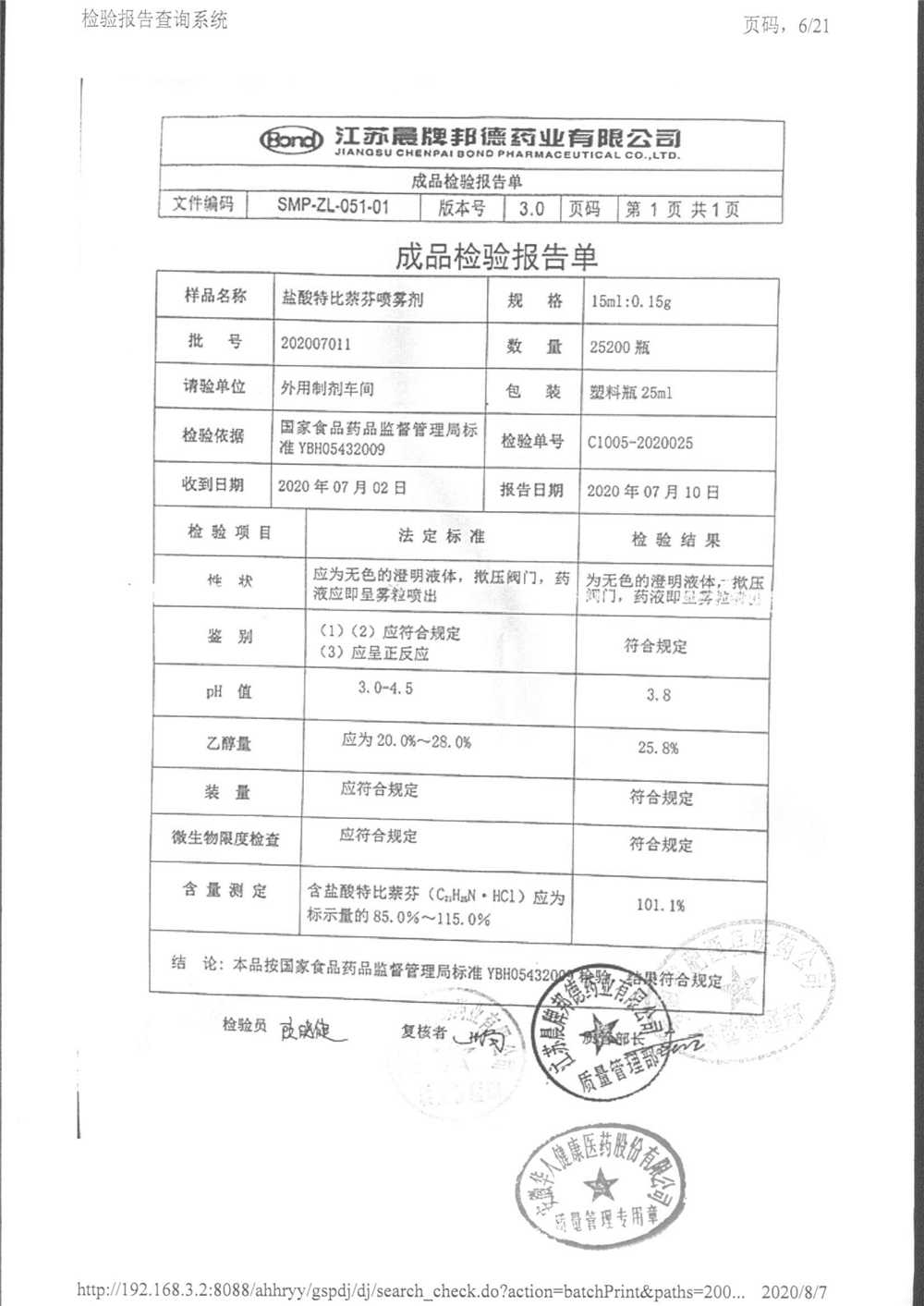 鹽酸特比萘芬噴霧劑 | 15ml:0.15g | 202011071 | 查看詳情 |