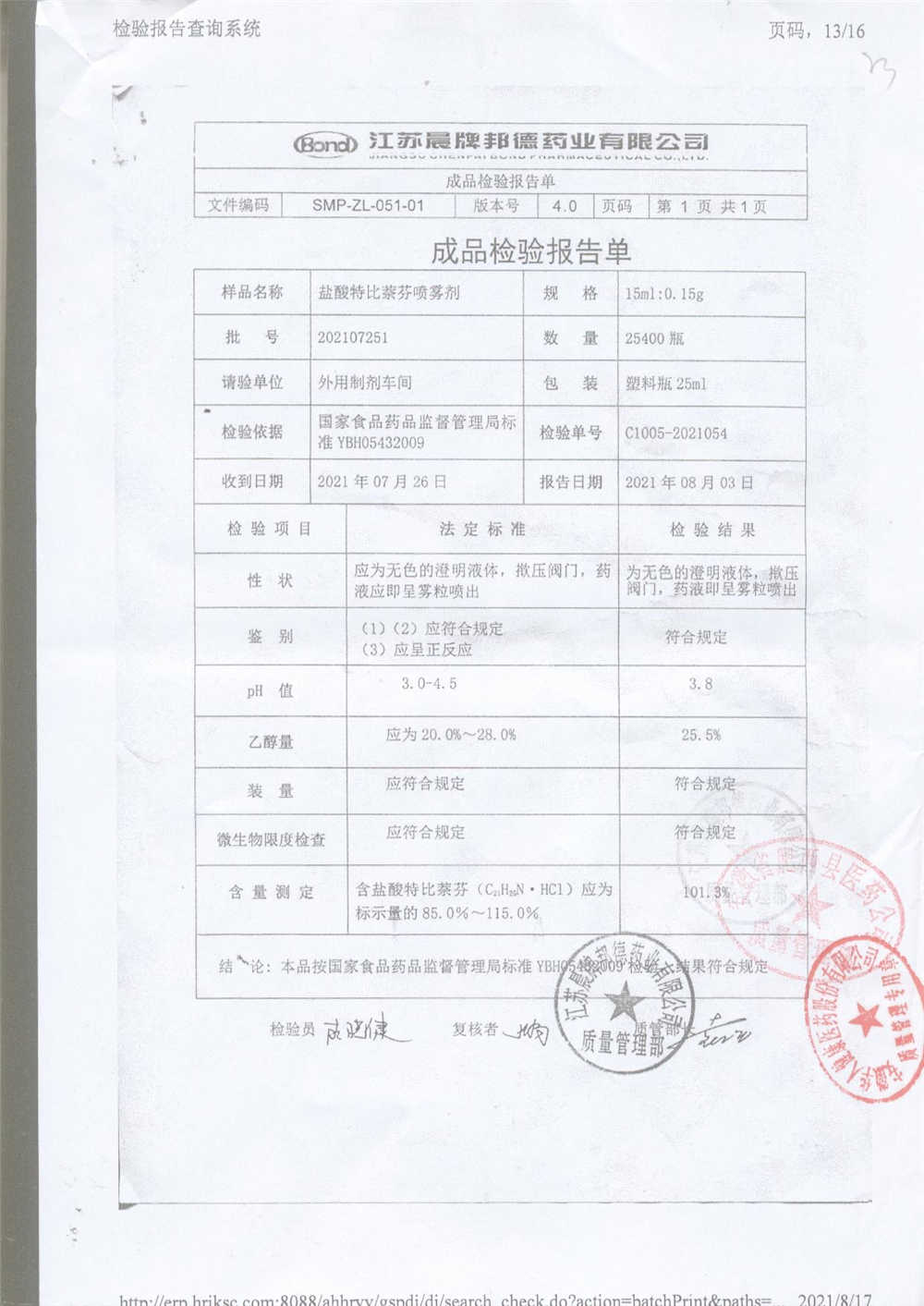 鹽酸特比萘芬噴霧劑 | 15ml:0.15g | 202107251 | 查看詳情 |