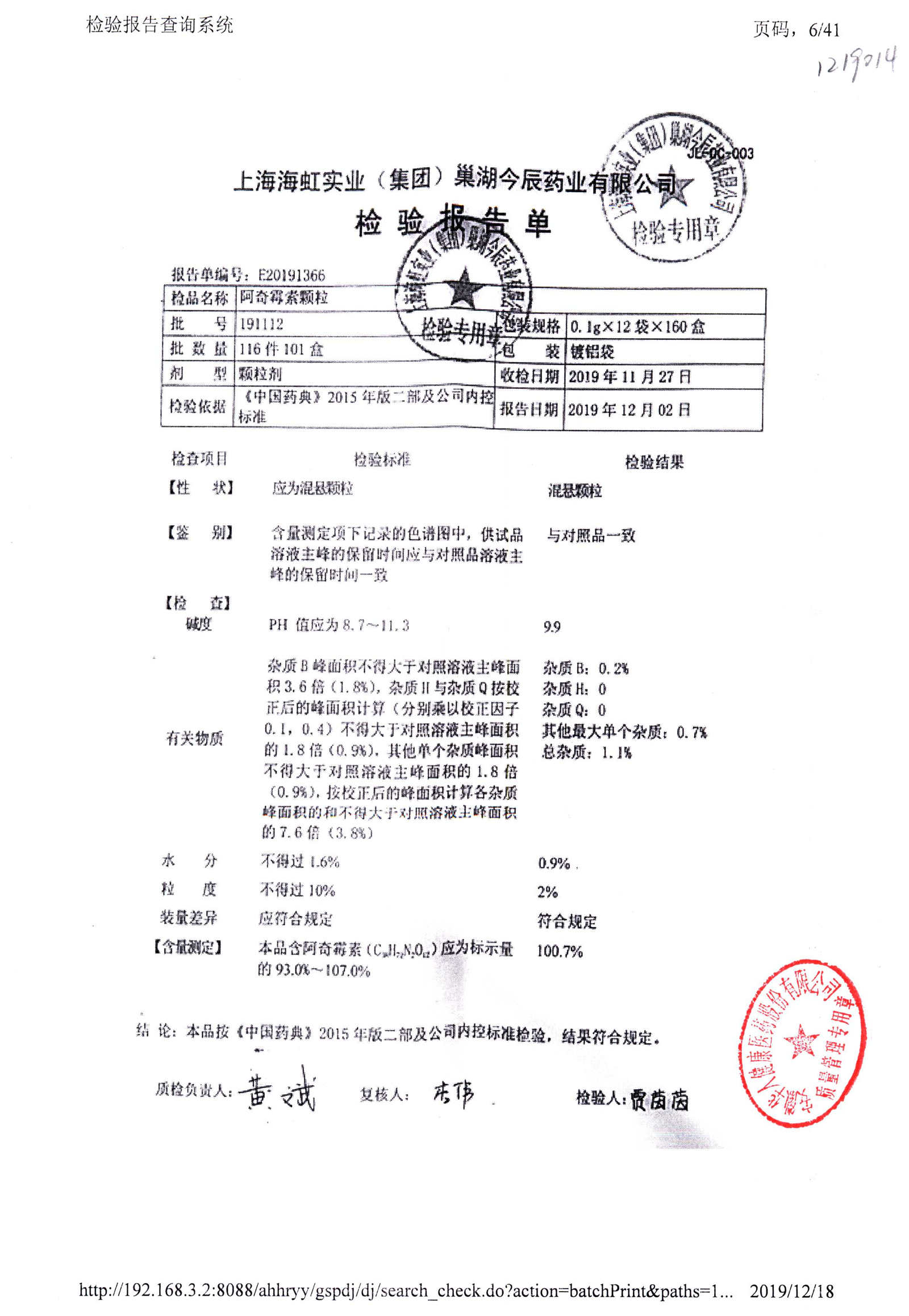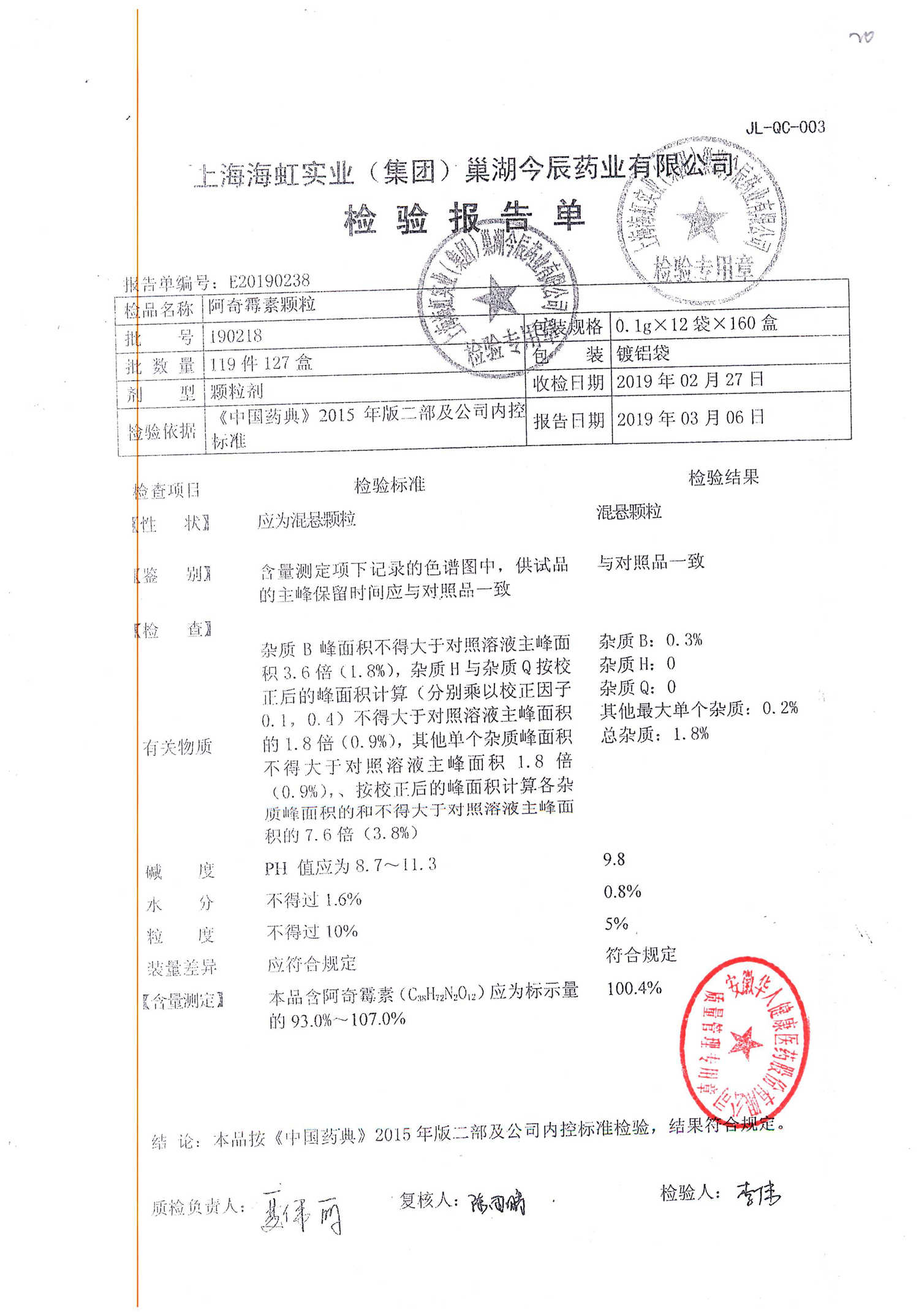 阿奇霉素顆粒 | 0.1g-12袋 | 190218 | 查看詳情 |