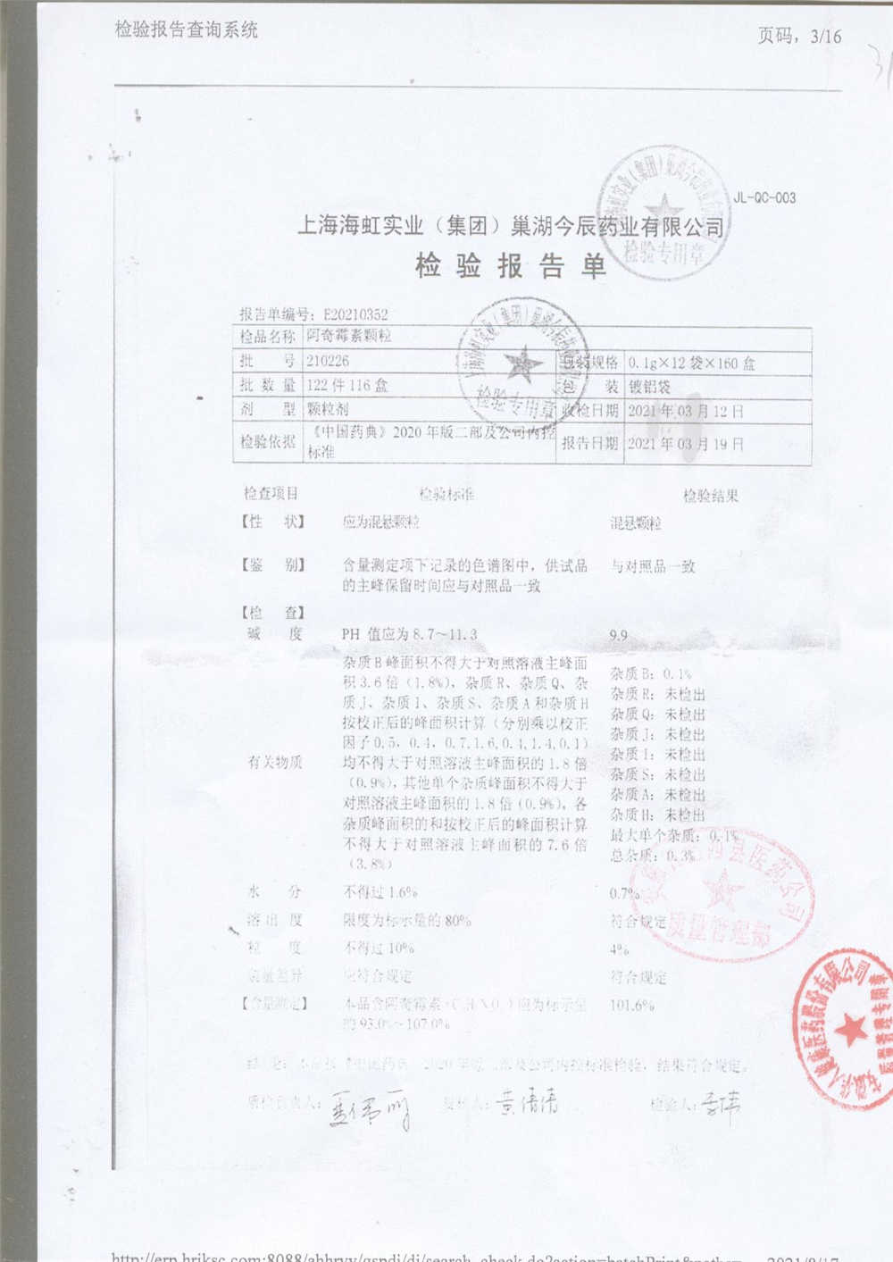 阿奇霉素顆粒 | 0.1g-12袋 | 210226 | 查看詳情 |