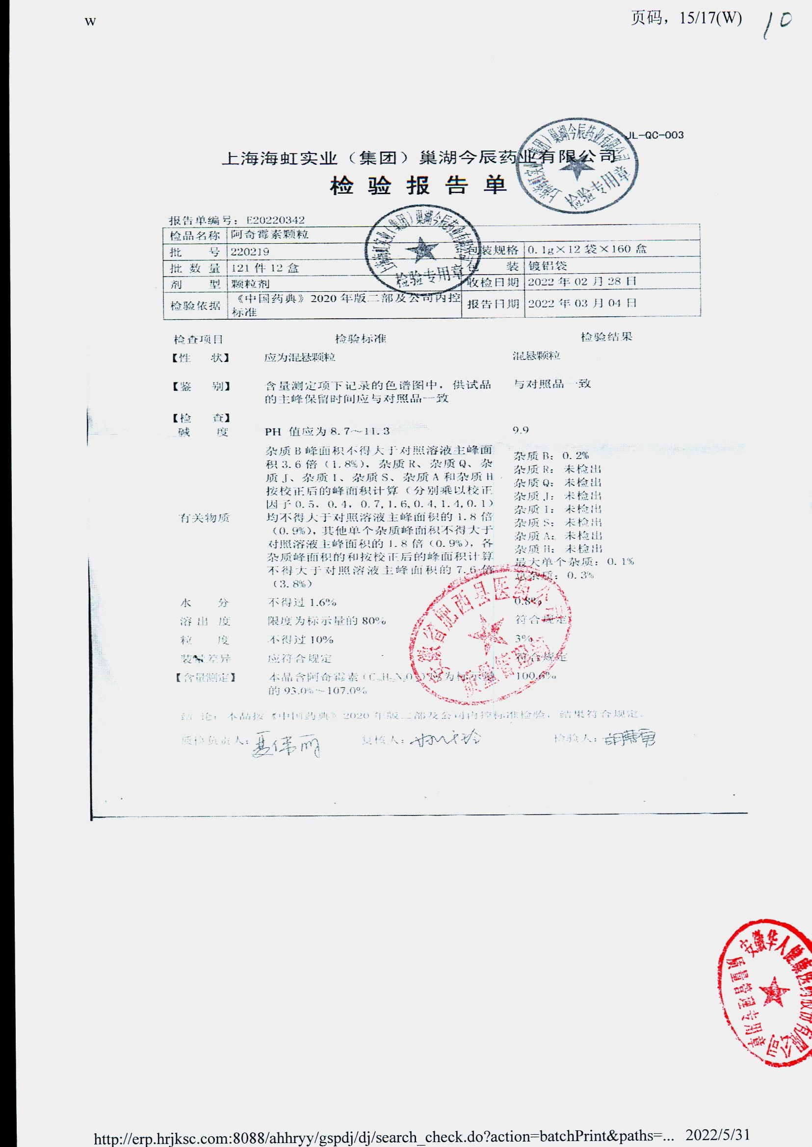 阿奇霉素顆粒 | 0.1g-12袋 | 220427 | 查看詳情 |