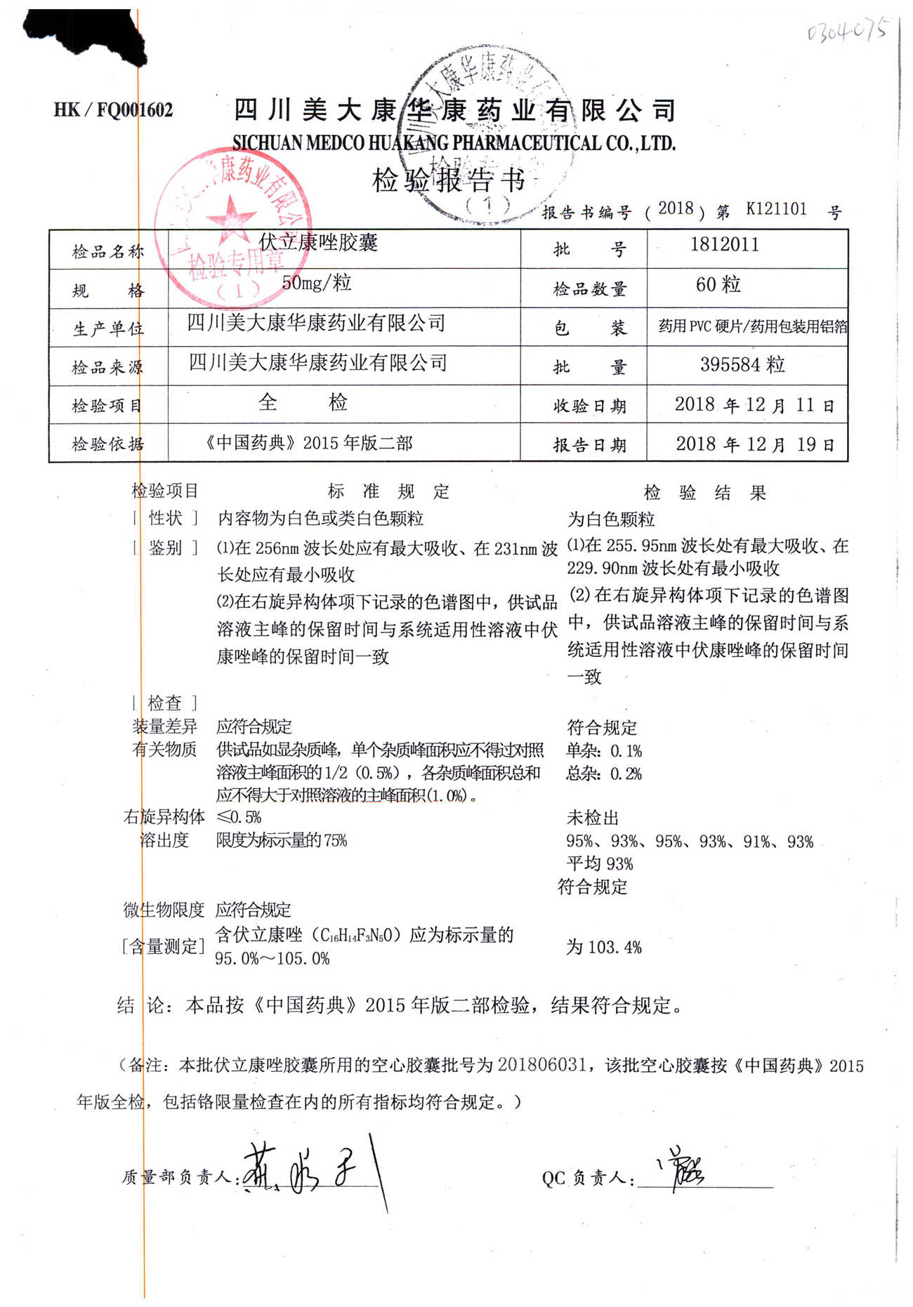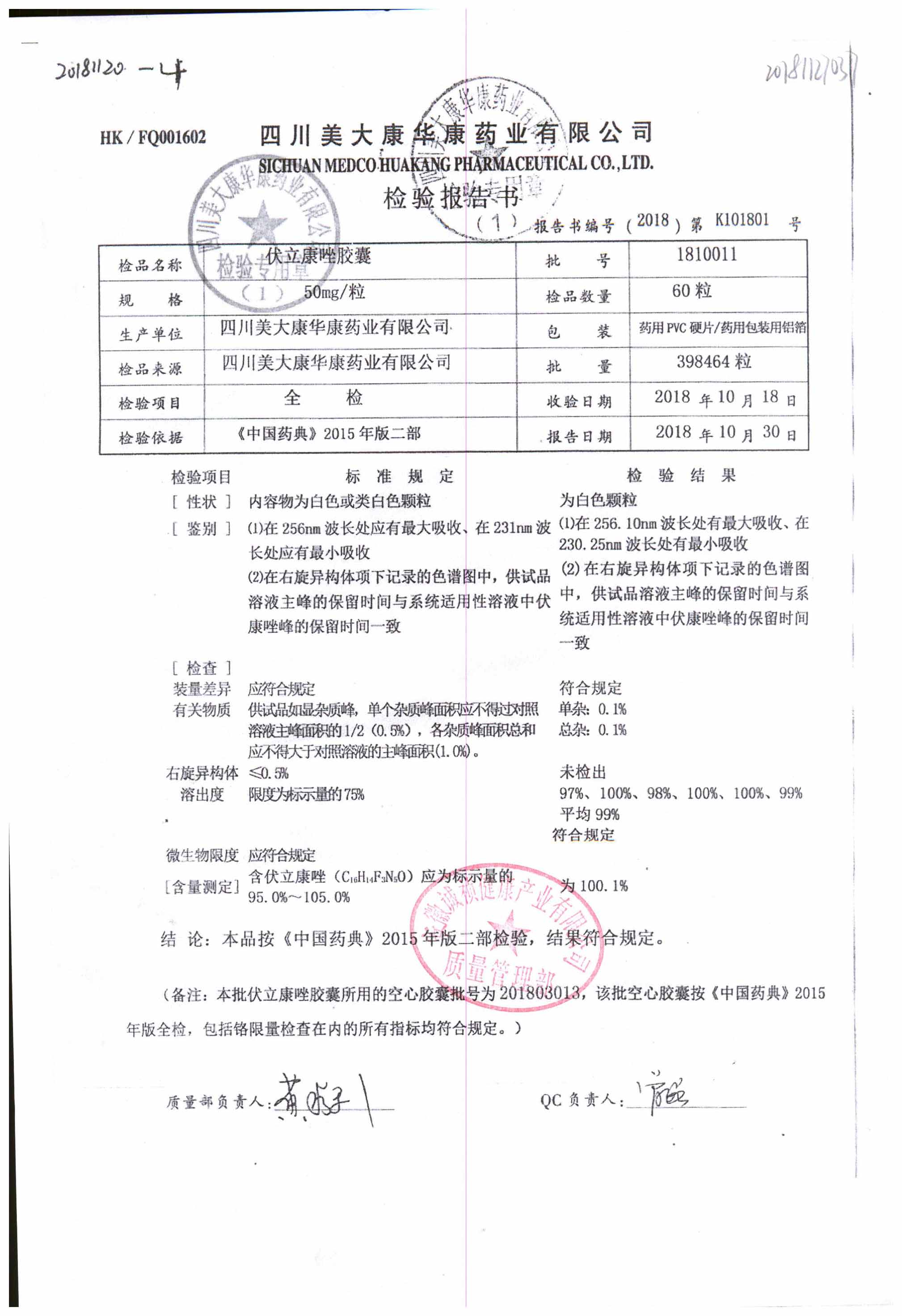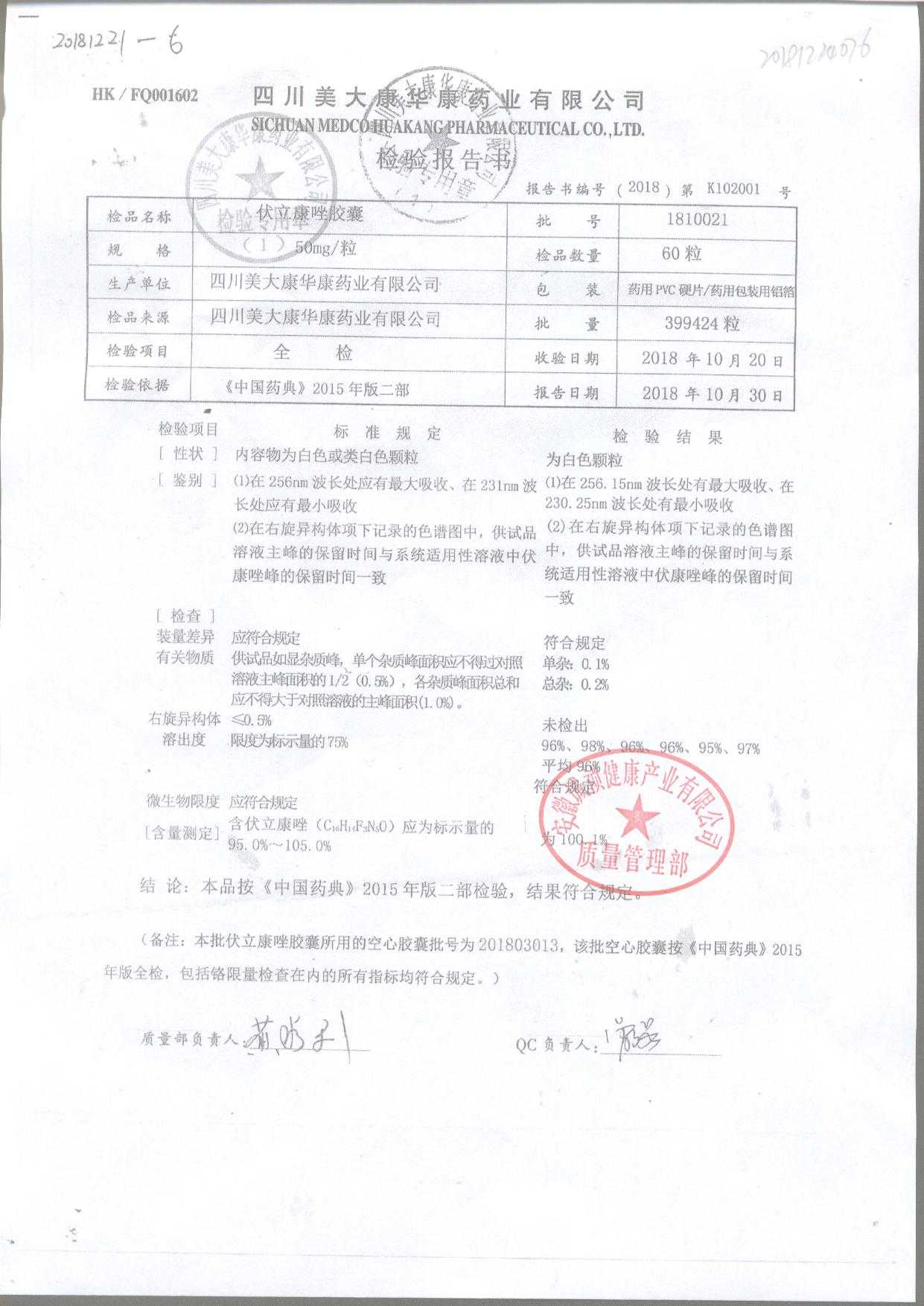 伏立康唑膠囊 | 50mg | 1812011 | 查看詳情 |