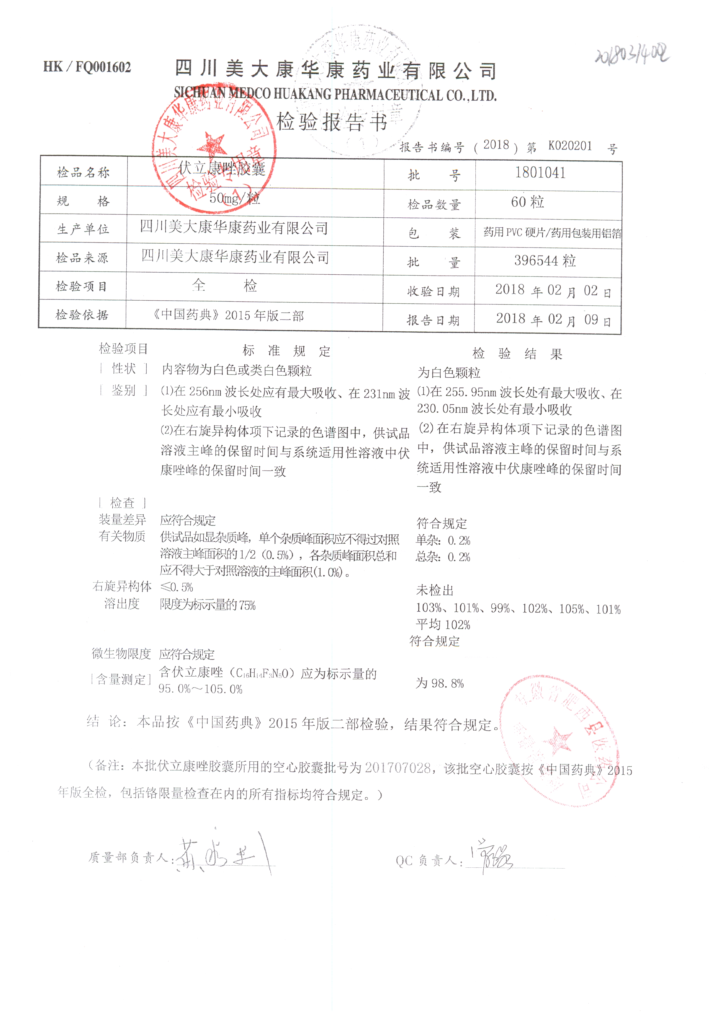 伏立康唑膠囊 | 50mg | 1801041 | 查看詳情 |