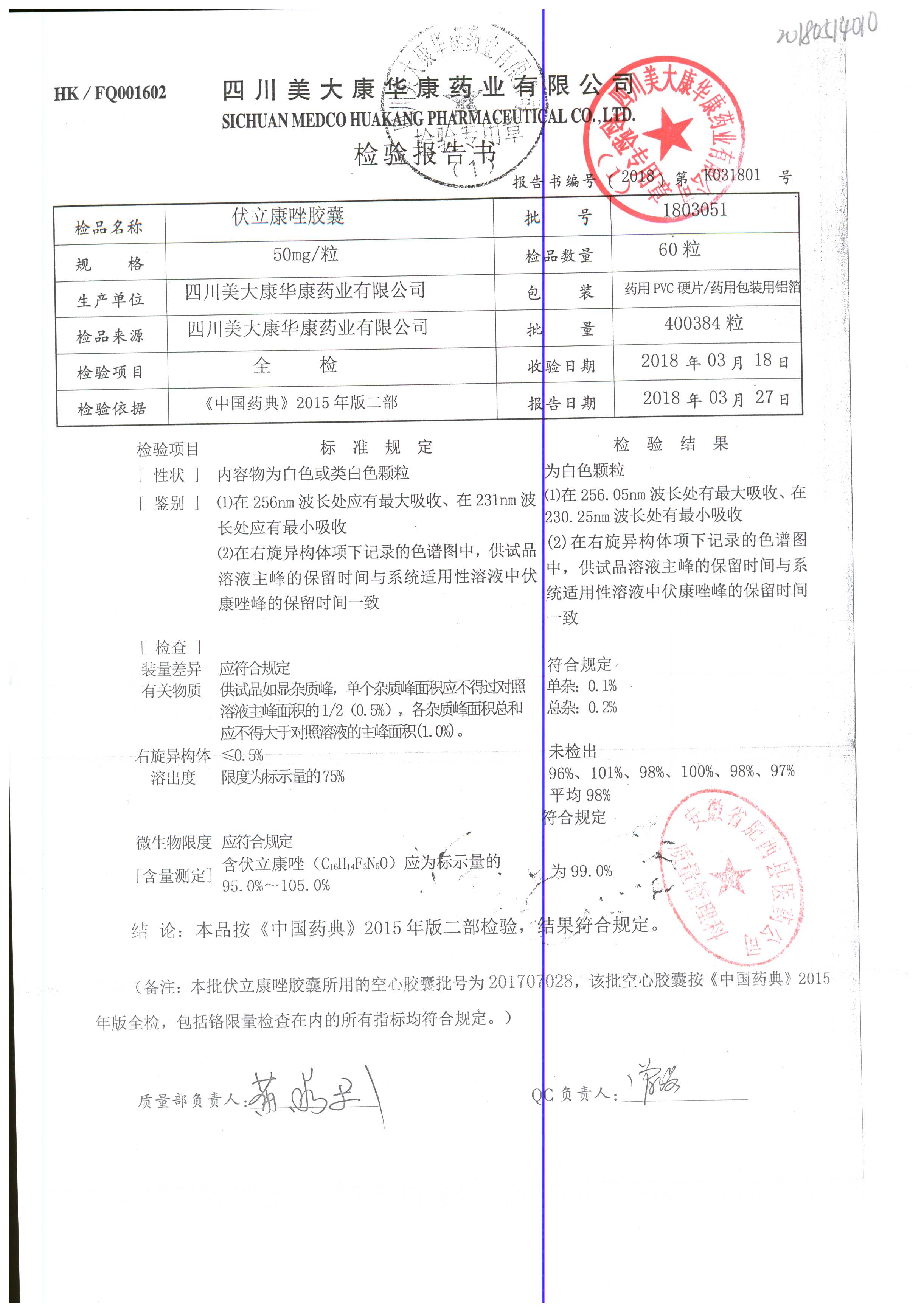 伏立康唑膠囊 | 50mg | 1803051 | 查看詳情 |