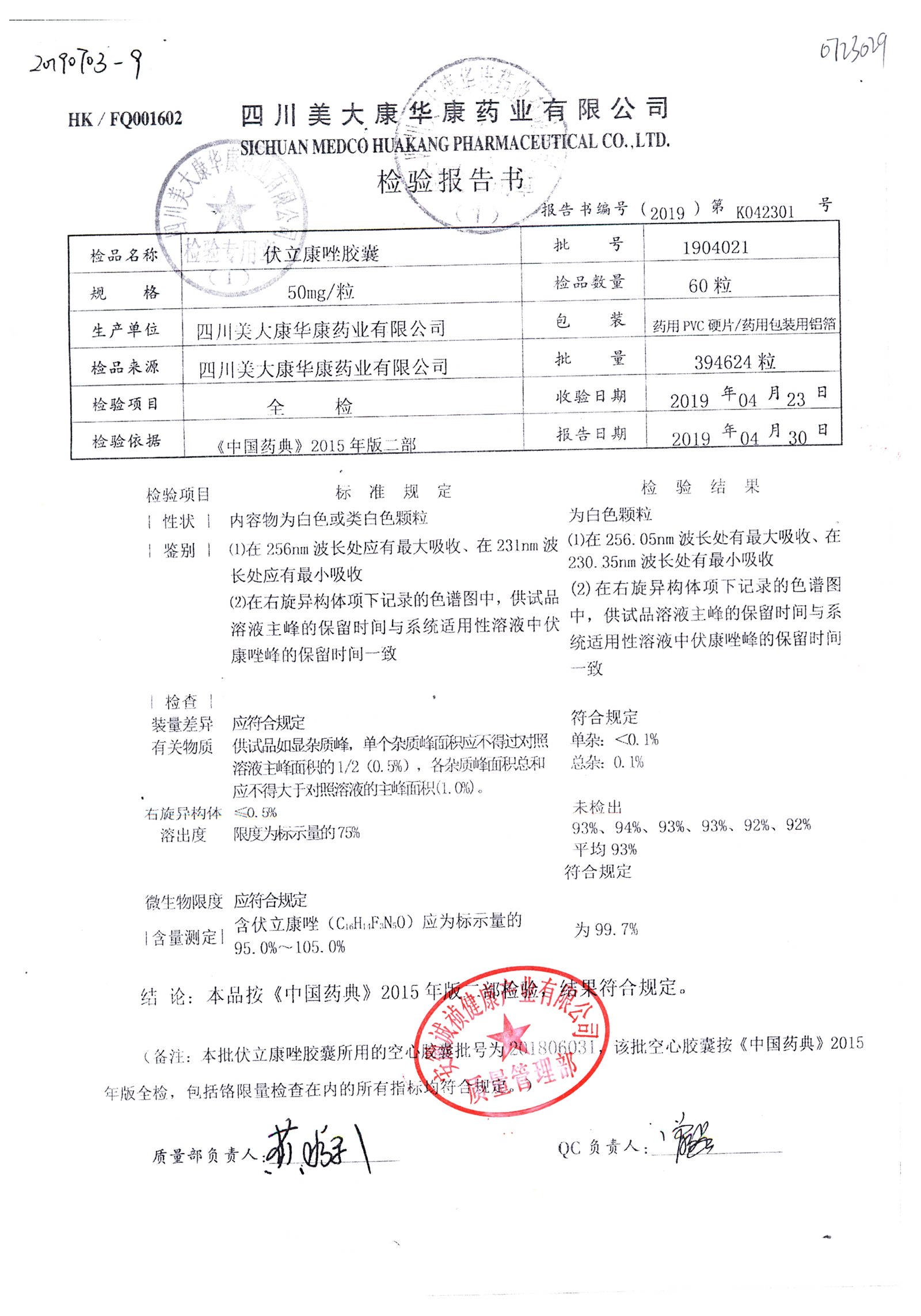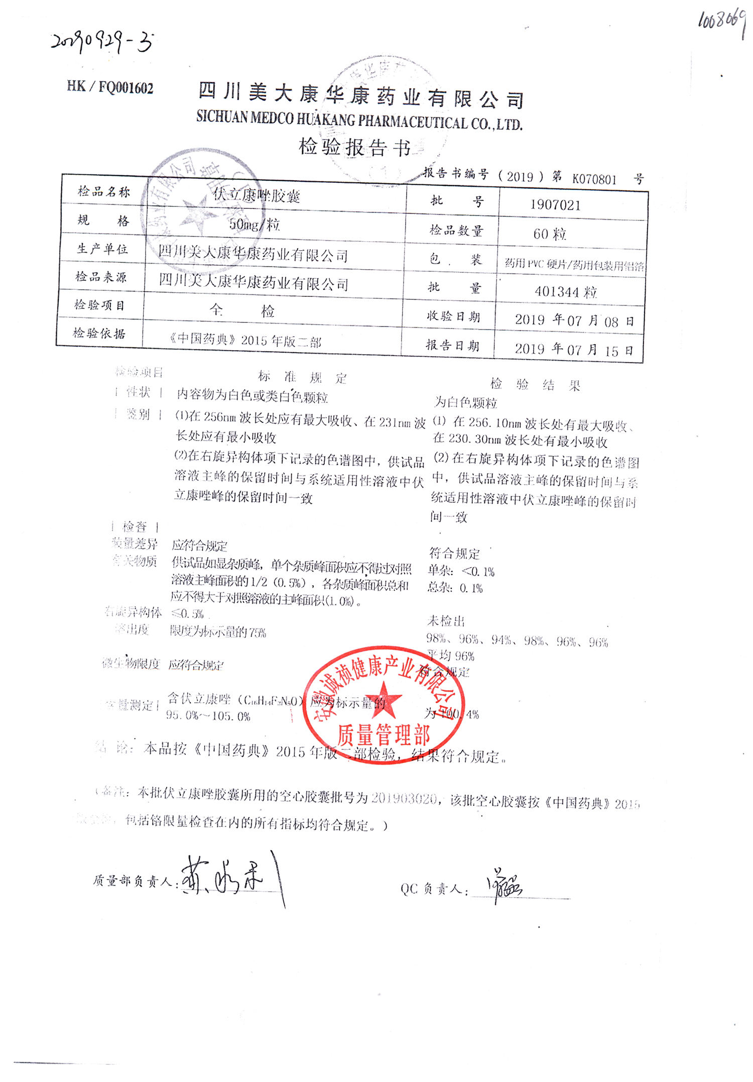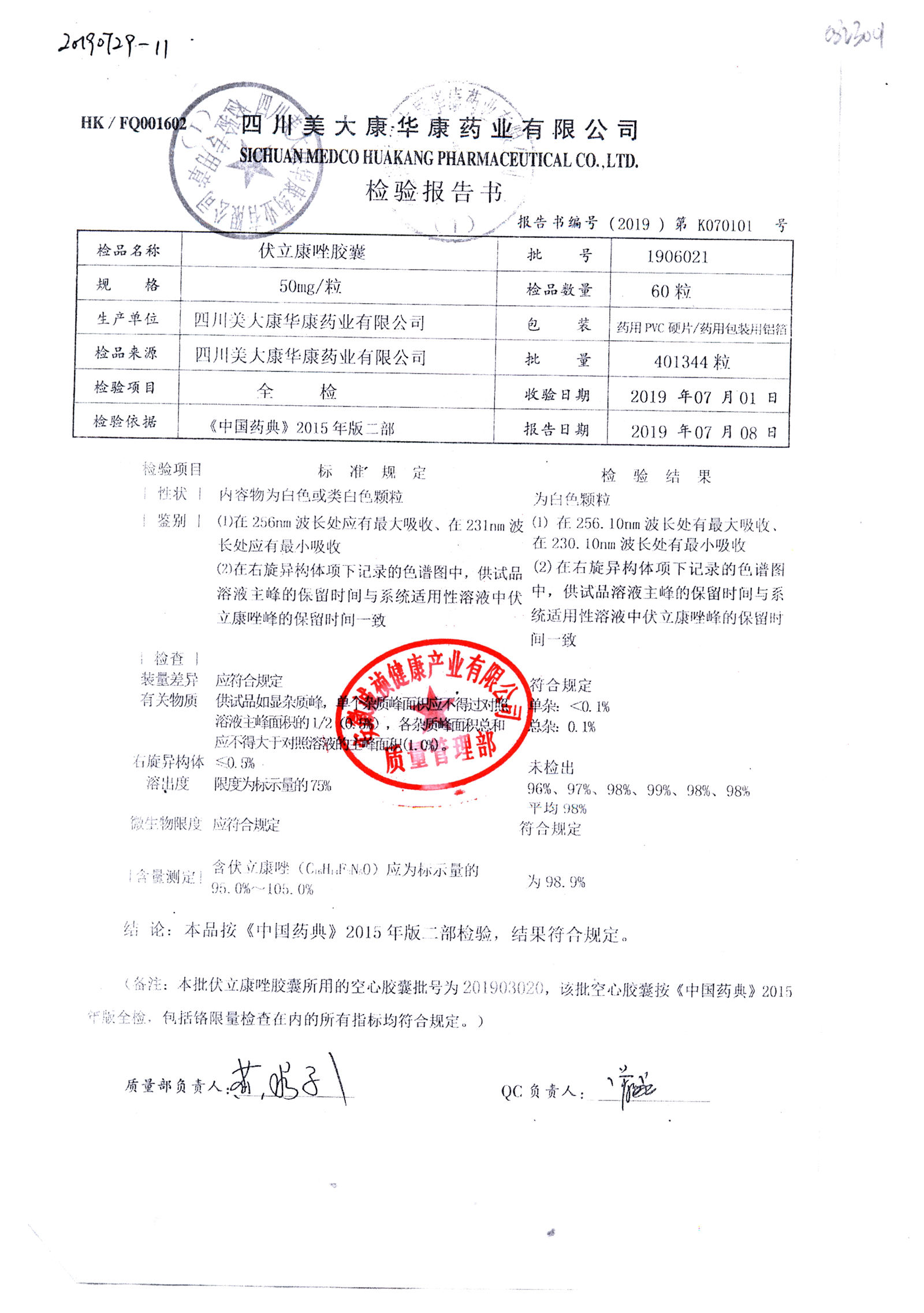 伏立康唑膠囊 | 50mg | 1906021 | 查看詳情 |