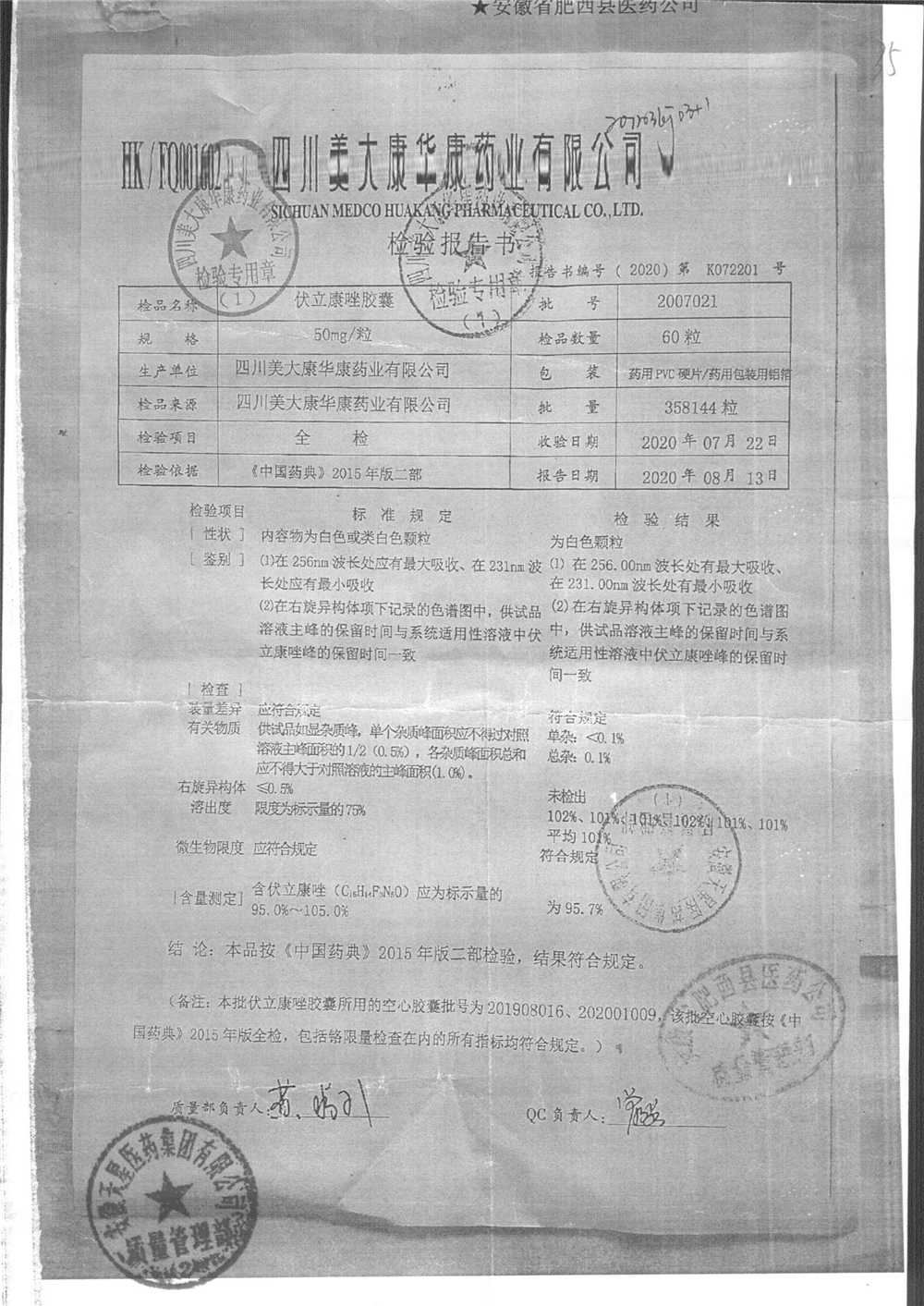 伏立康唑膠囊 | 50mg | 2007021 | 查看詳情 |