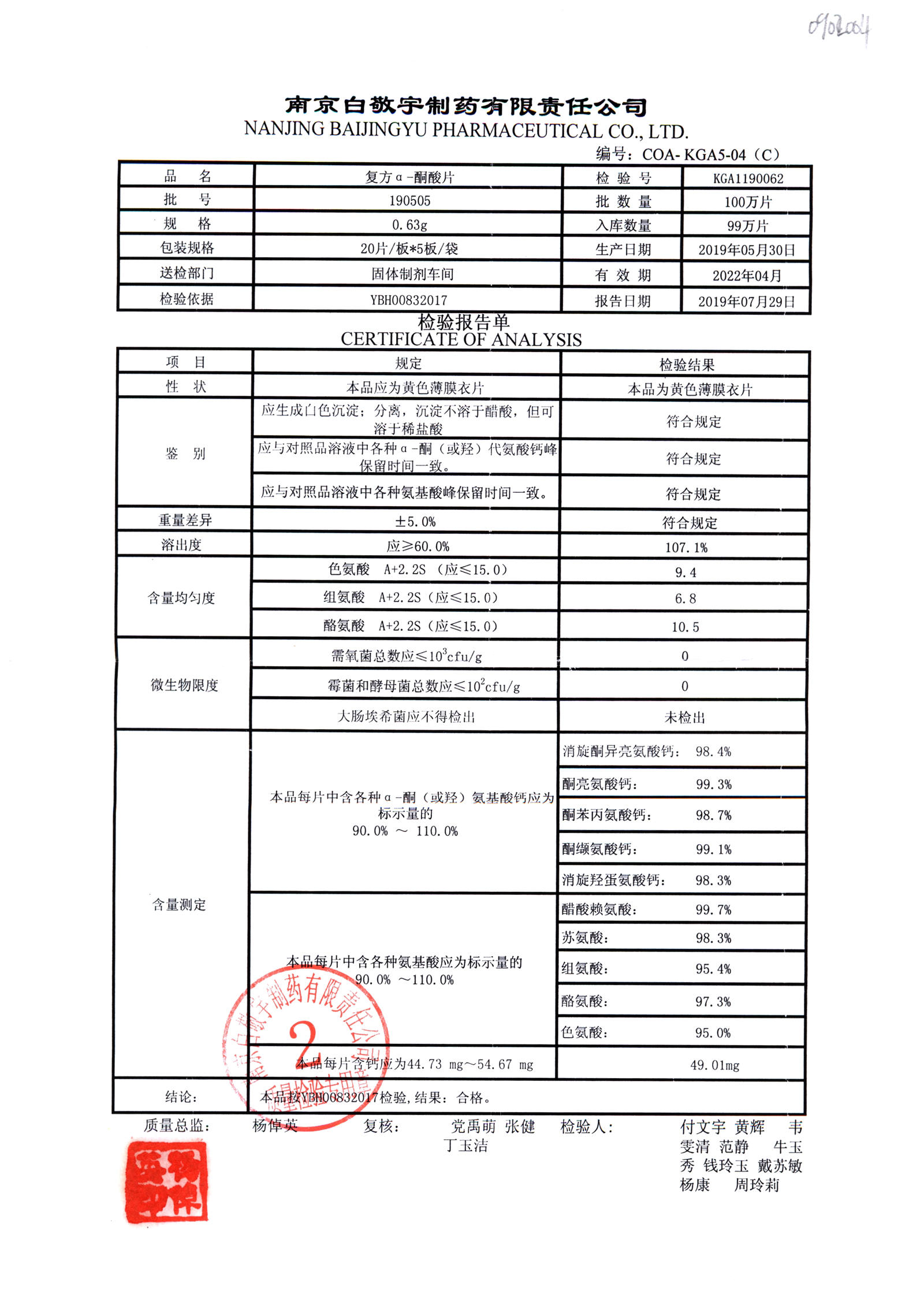 復(fù)方a-酮酸片 | 0.63g*20s*5板 | 190505 | 查看詳情 |