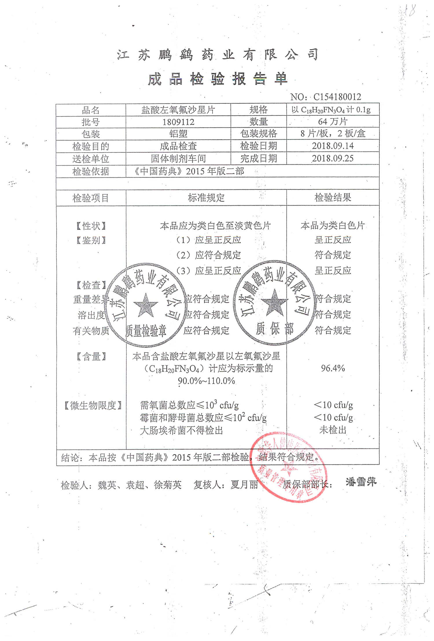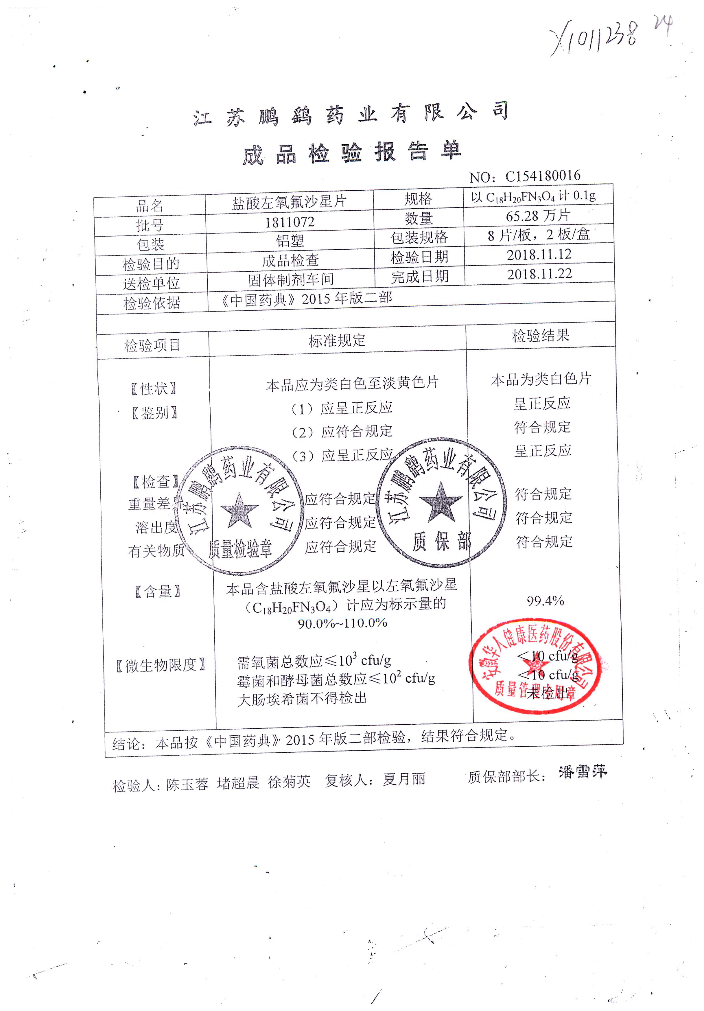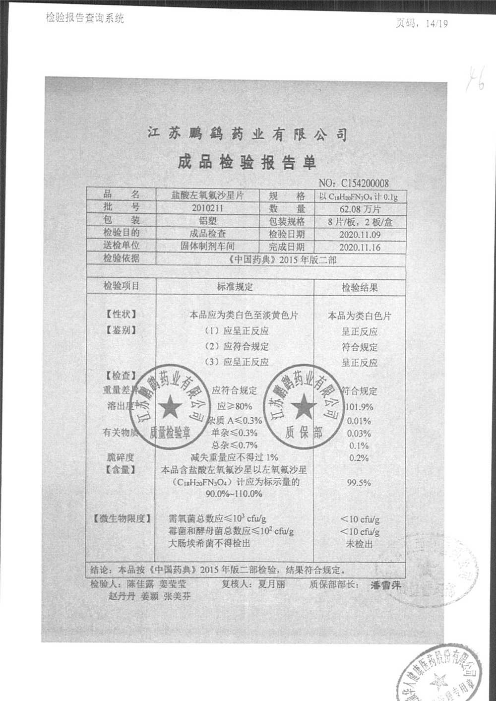 鹽酸左氧氟沙星片 | 16s | 2012071 | 查看詳情 |