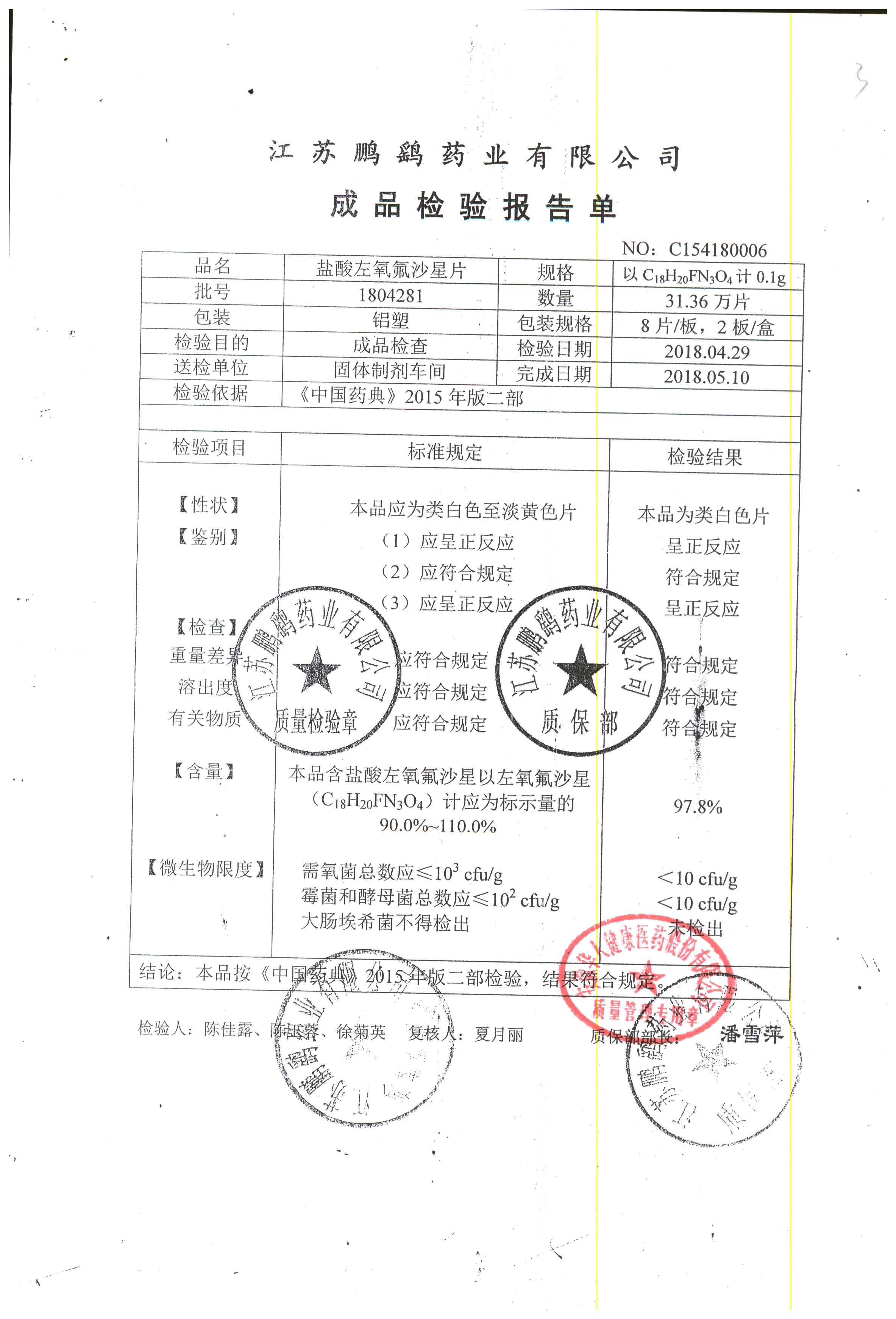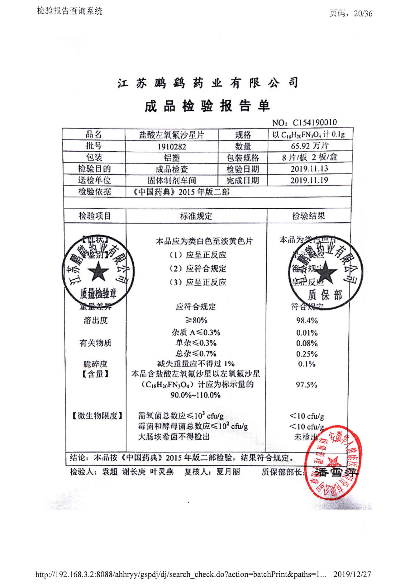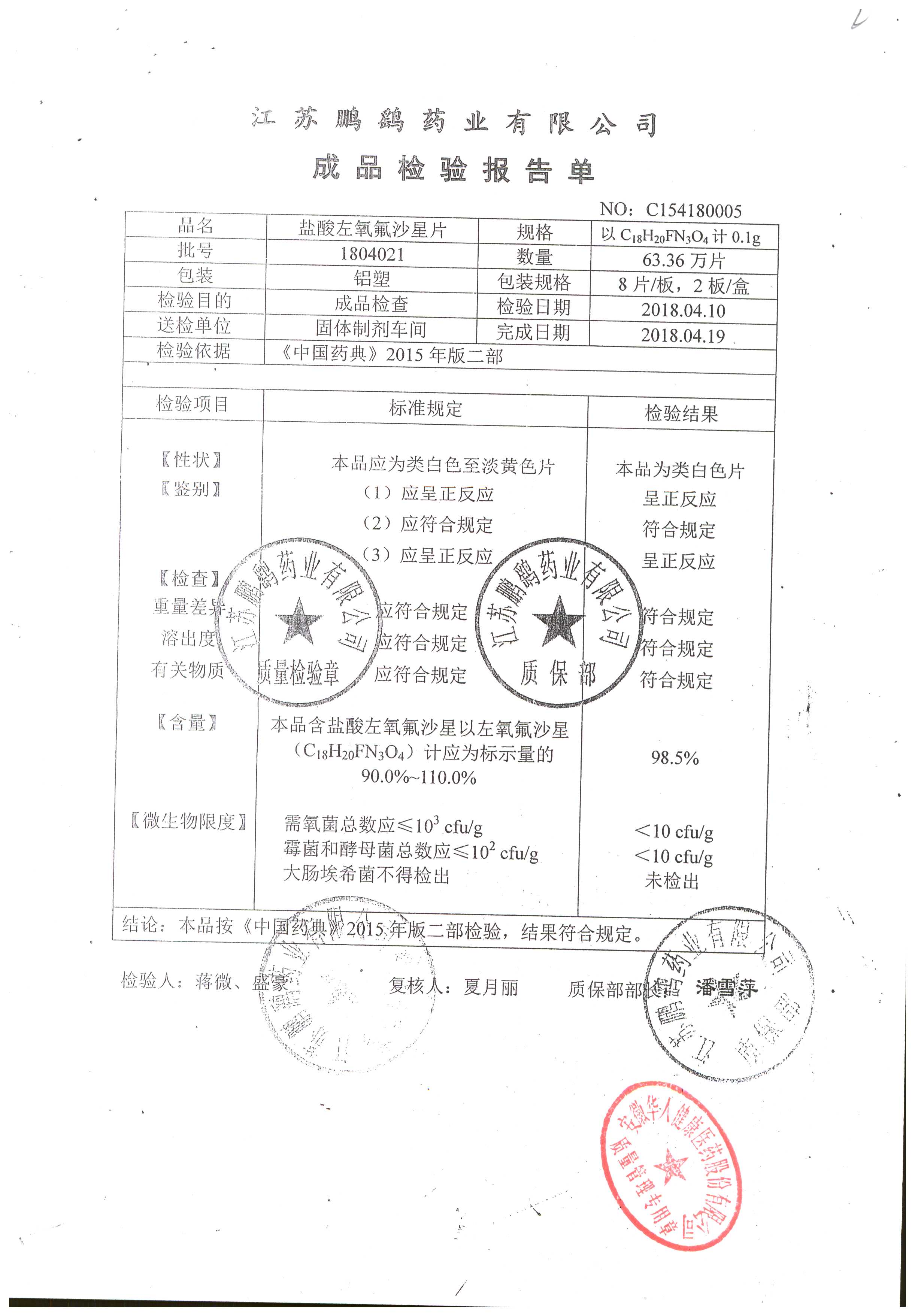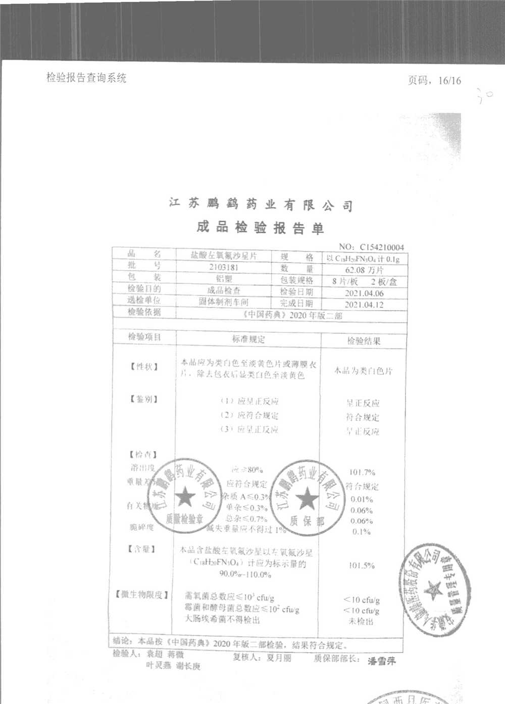 鹽酸左氧氟沙星片 | 16s | 2004021 | 查看詳情 |
