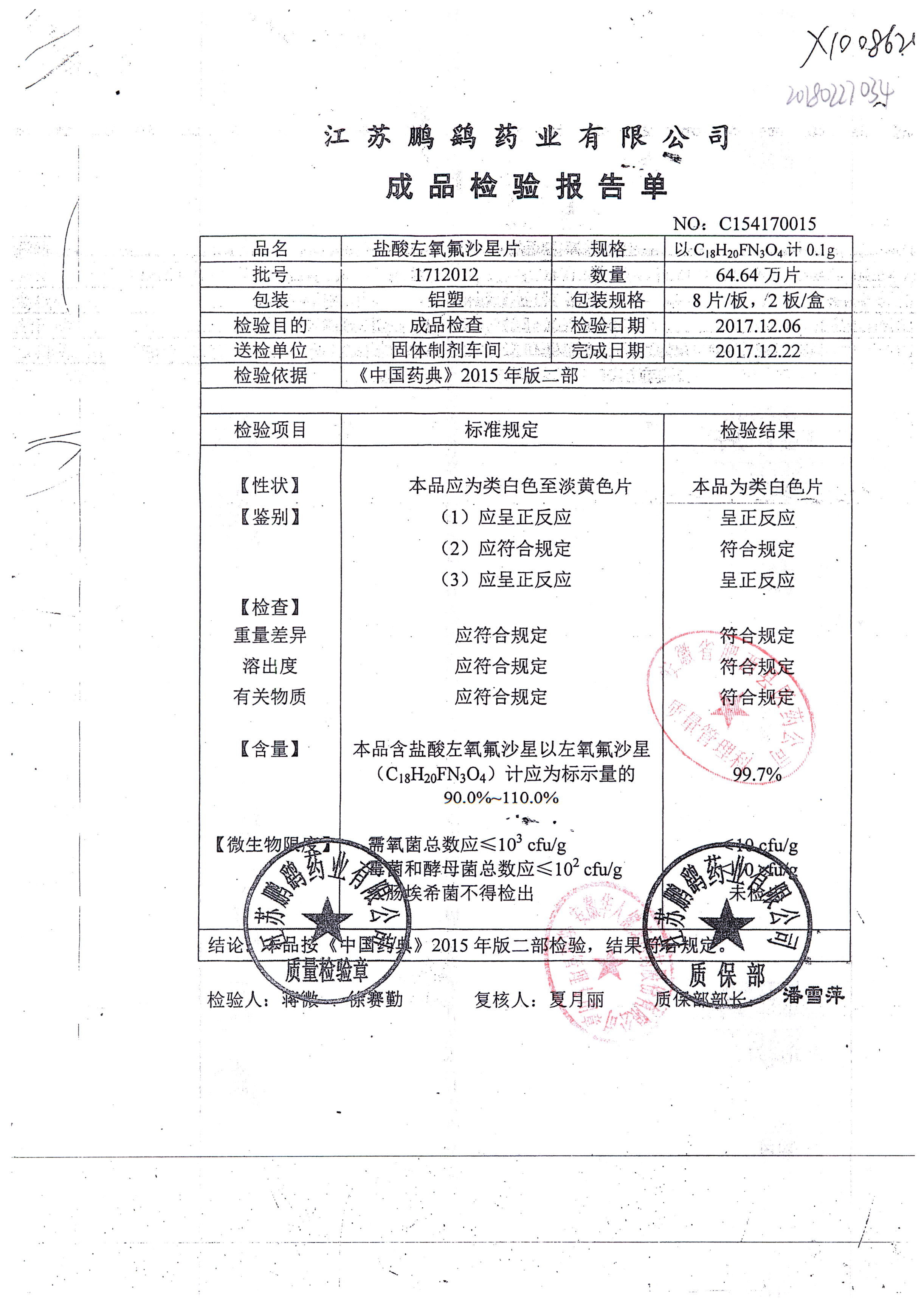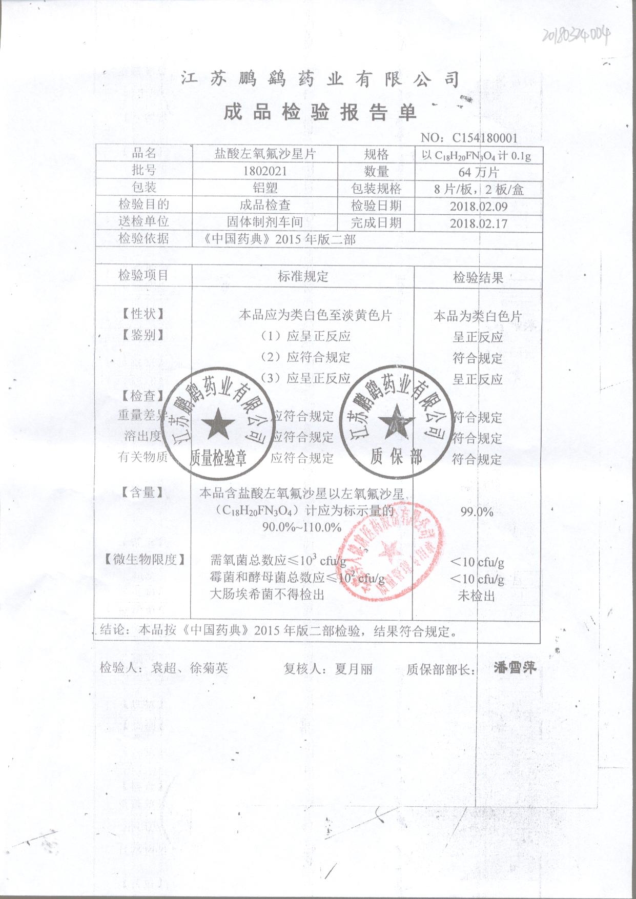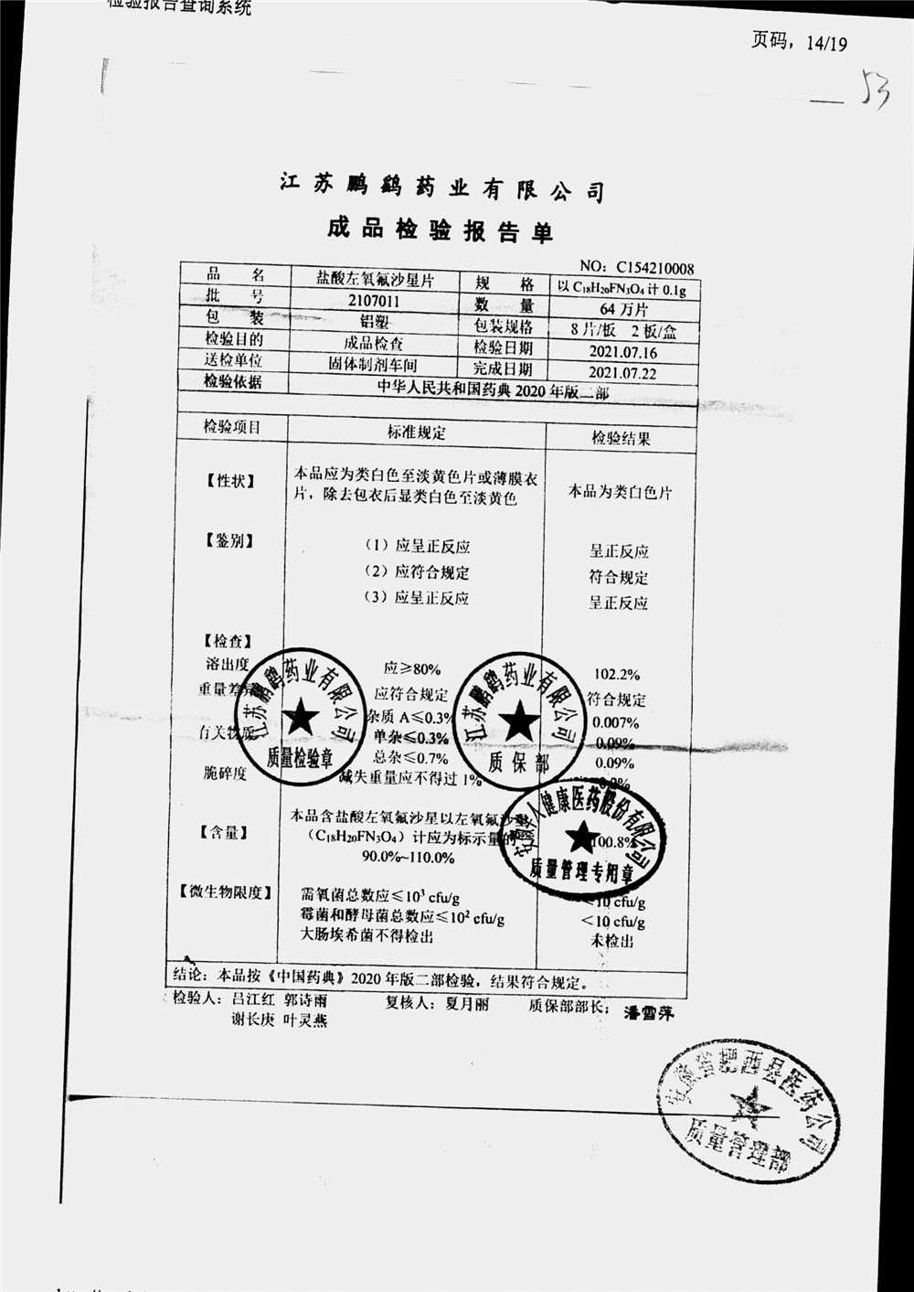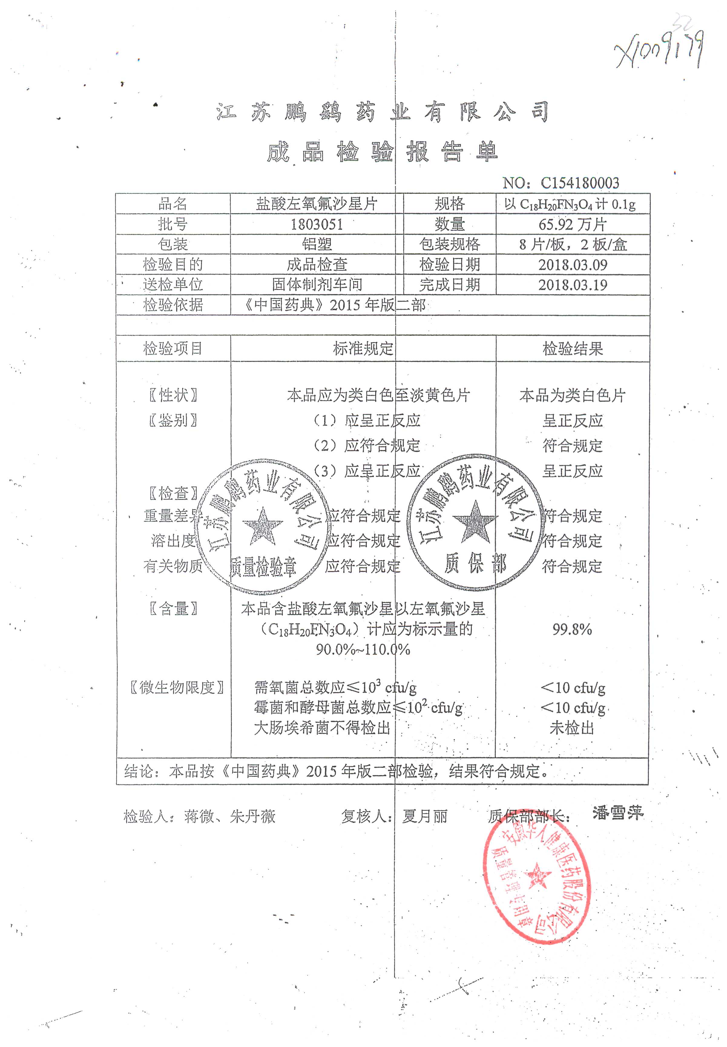 鹽酸左氧氟沙星片 | 16s | 2004021 | 查看詳情 |