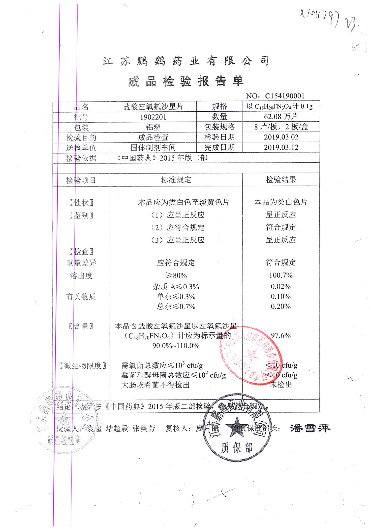 鹽酸左氧氟沙星片 | 16s | 1902201 | 查看詳情 |