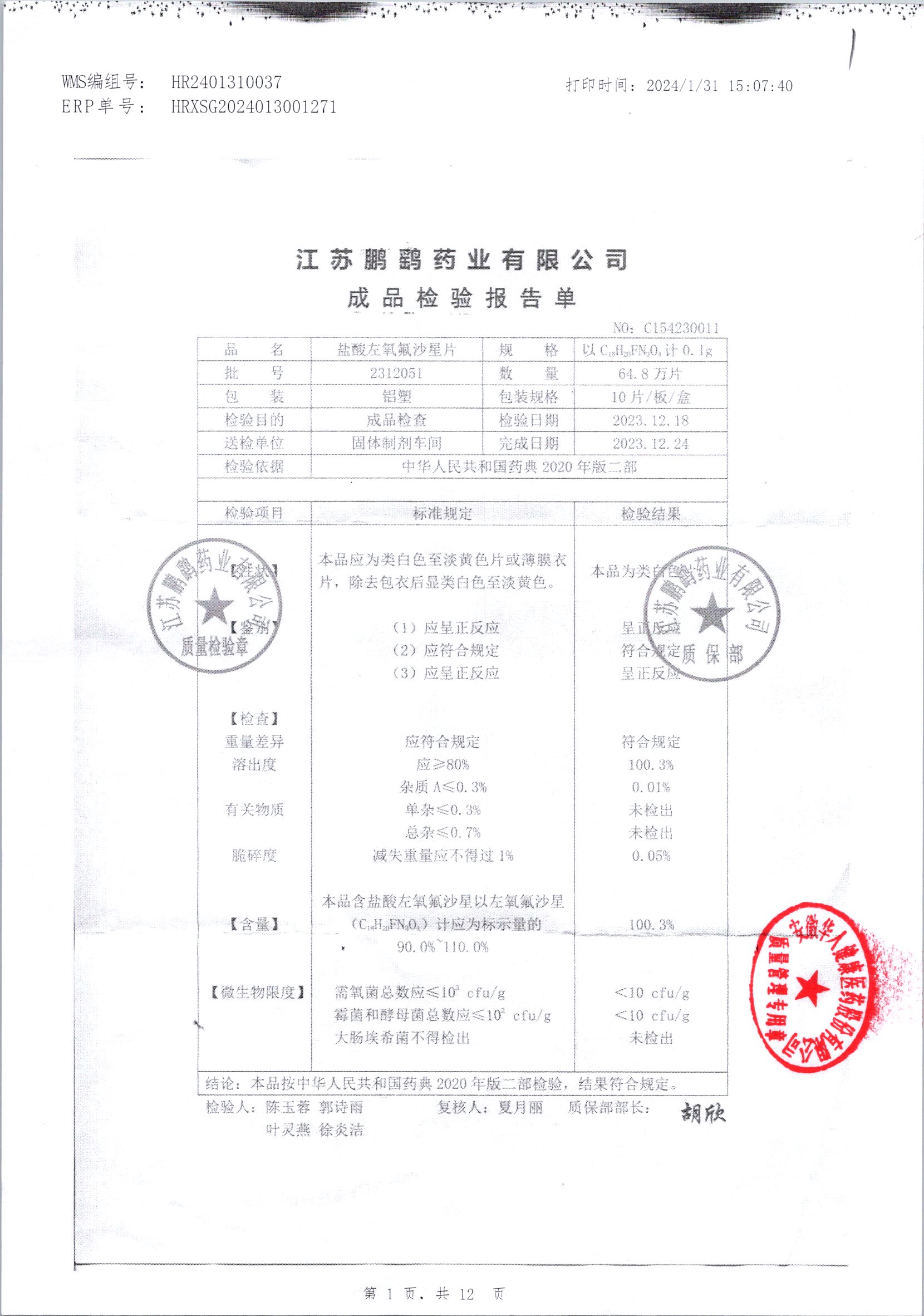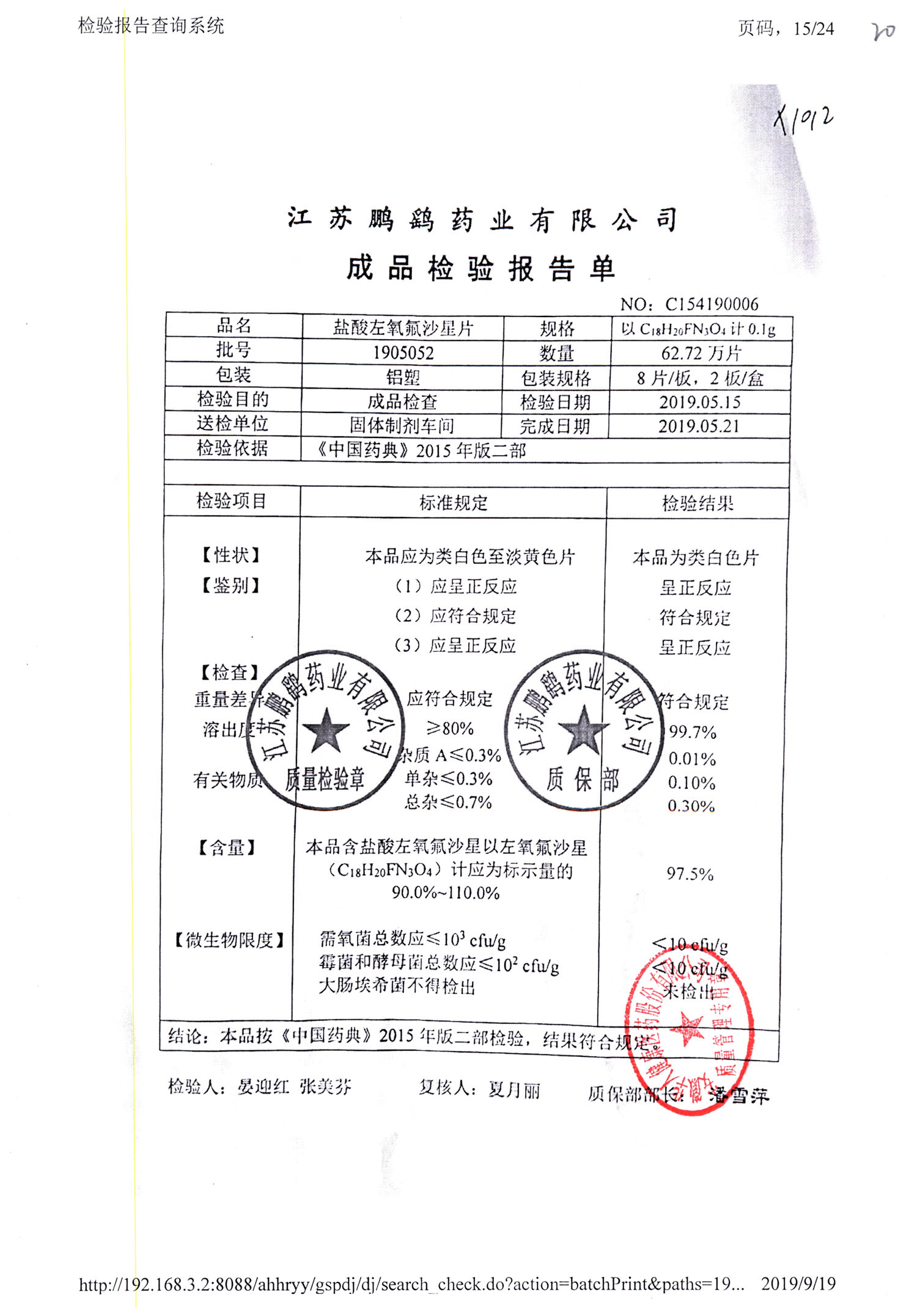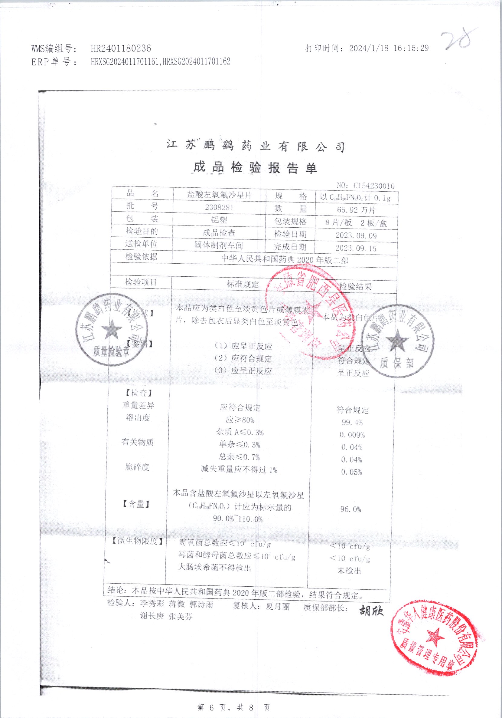鹽酸左氧氟沙星片 | 16s | 2312051 | 查看詳情 |