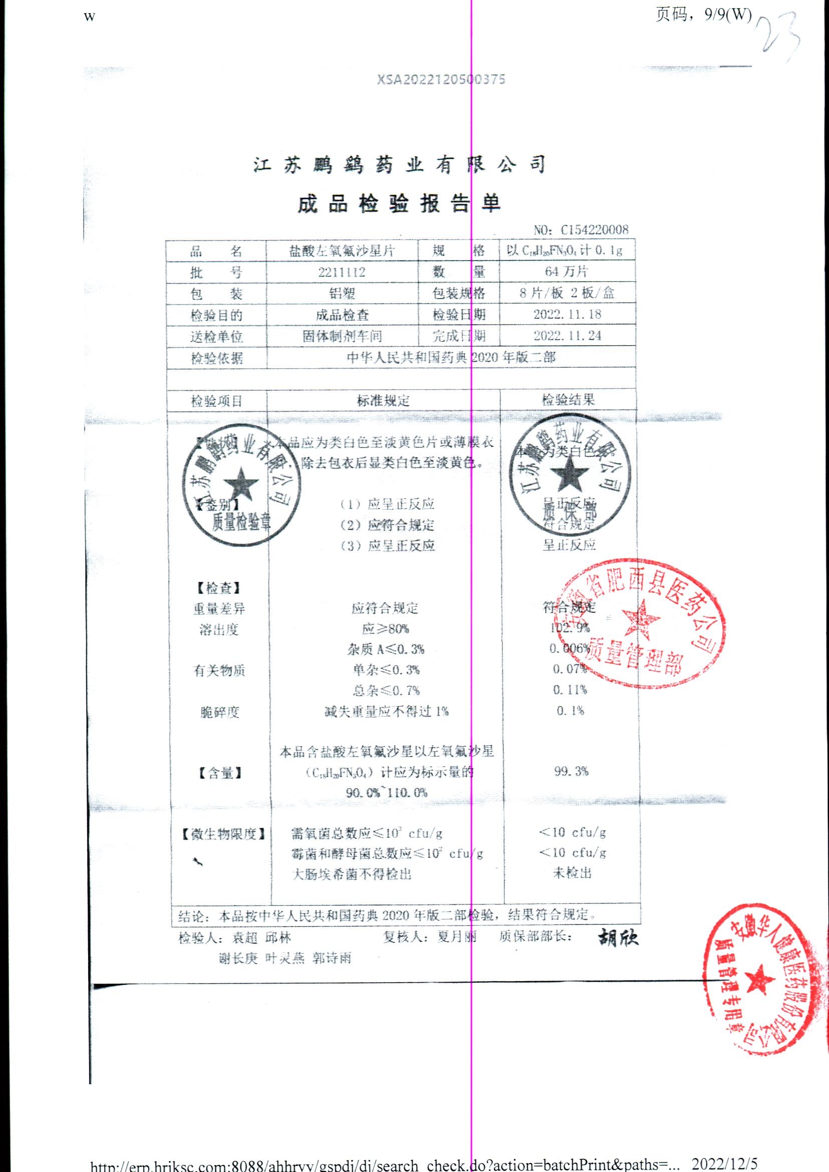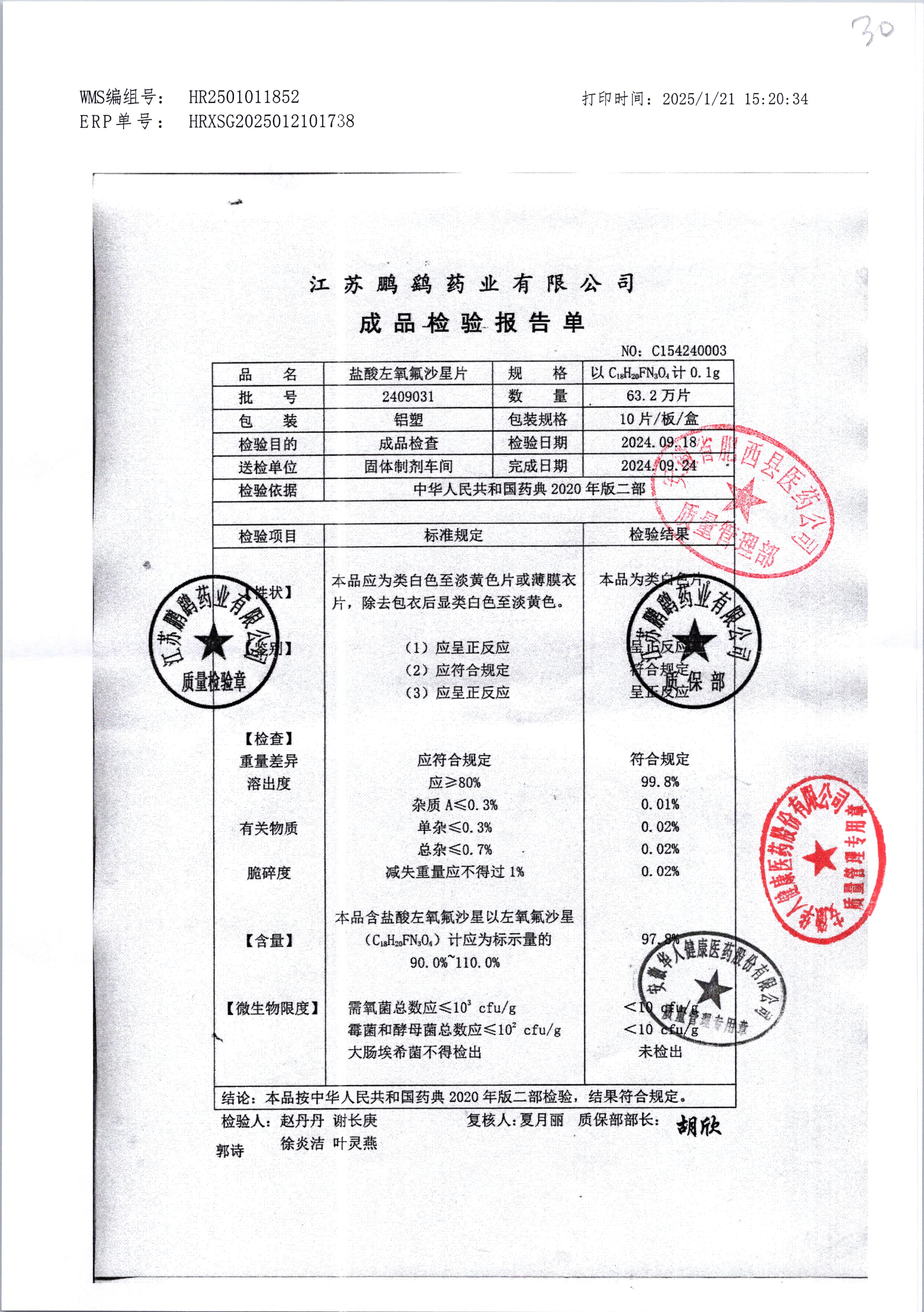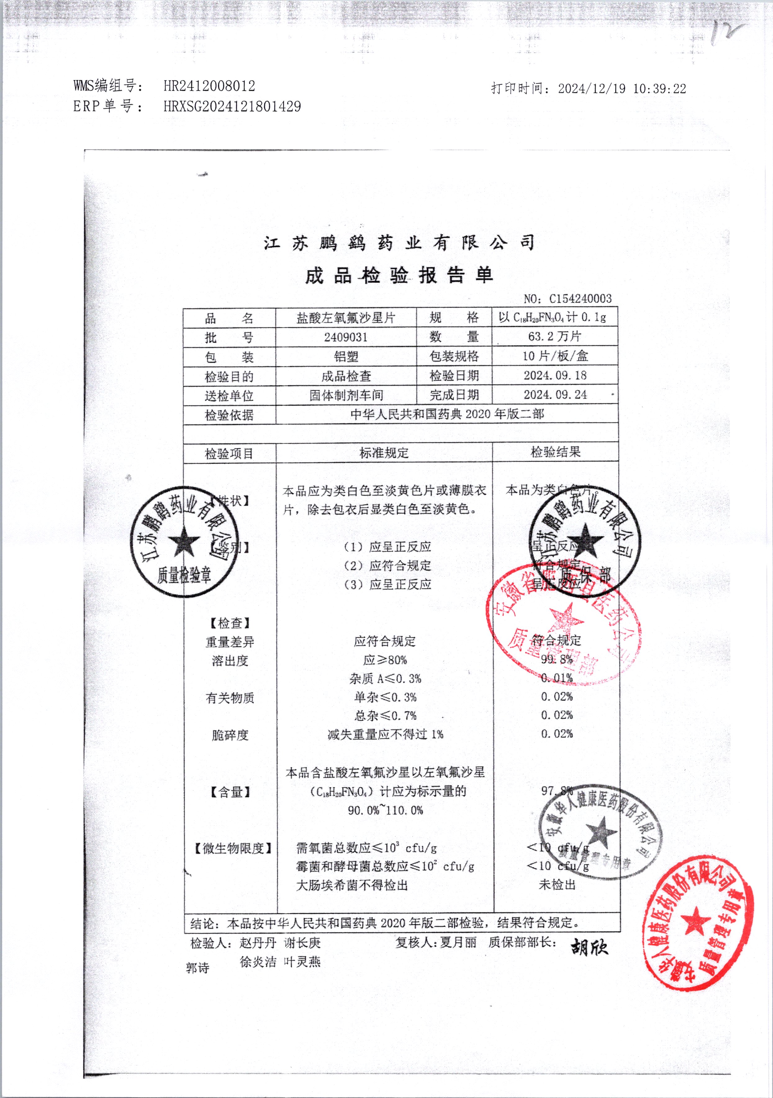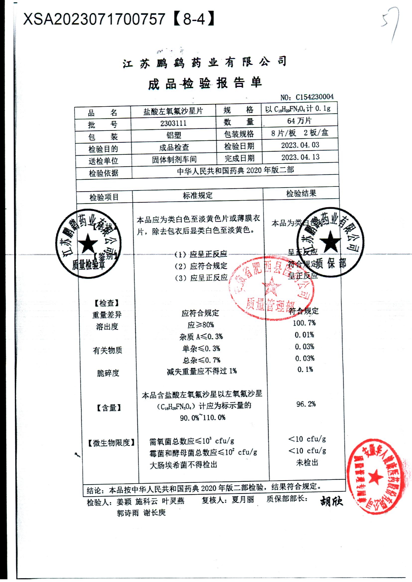 鹽酸左氧氟沙星片 | 16s | 2312051 | 查看詳情 |