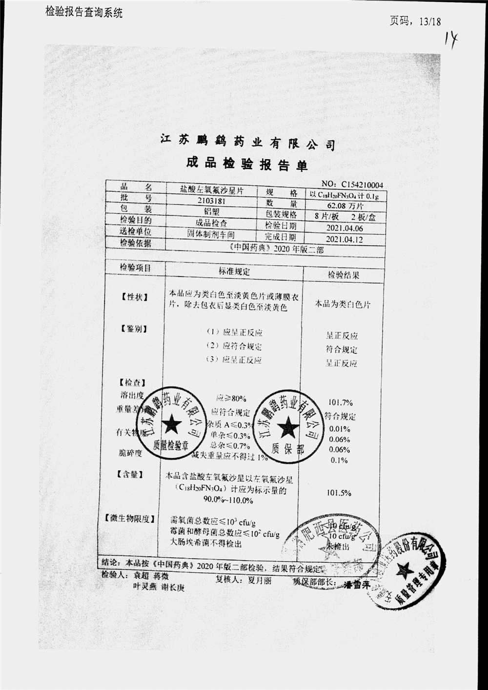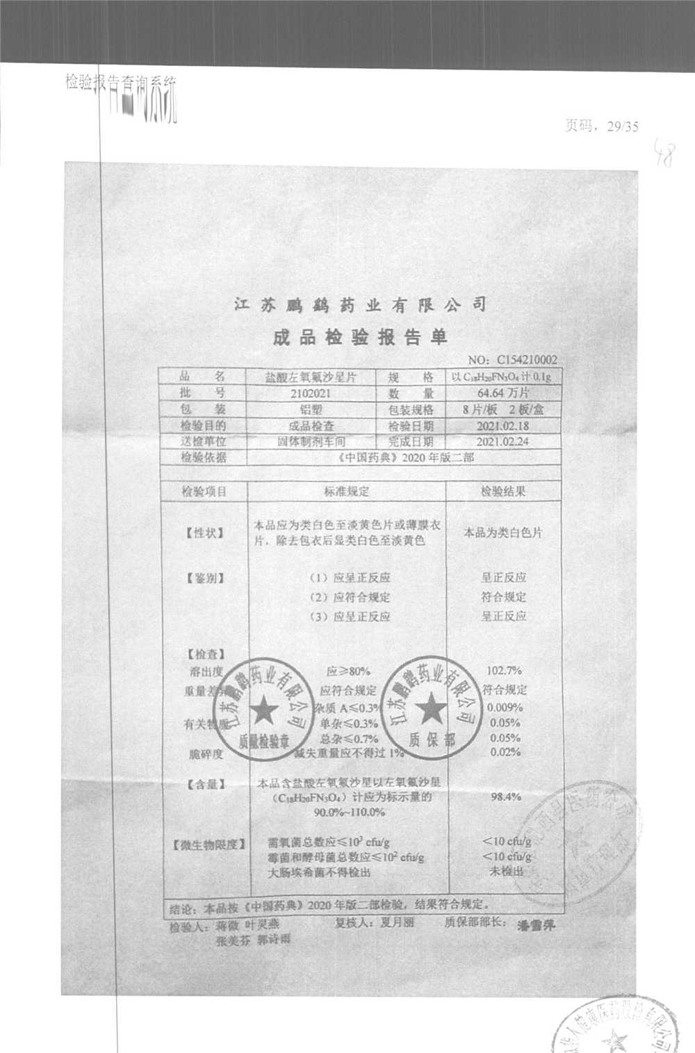 鹽酸左氧氟沙星片 | 16s | 2102021 | 查看詳情 |