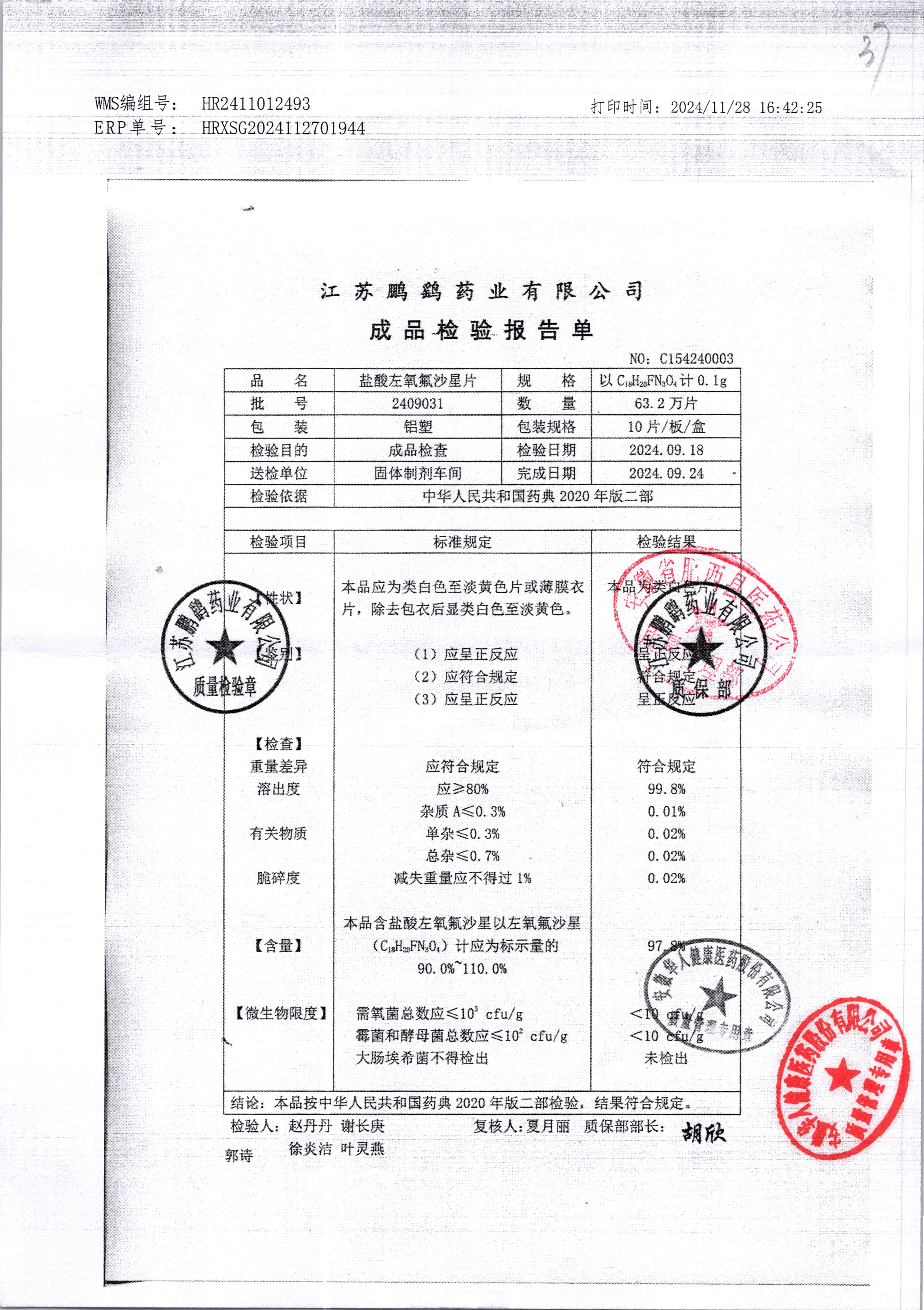 鹽酸左氧氟沙星片 | 16s | 2412131 | 查看詳情 |
