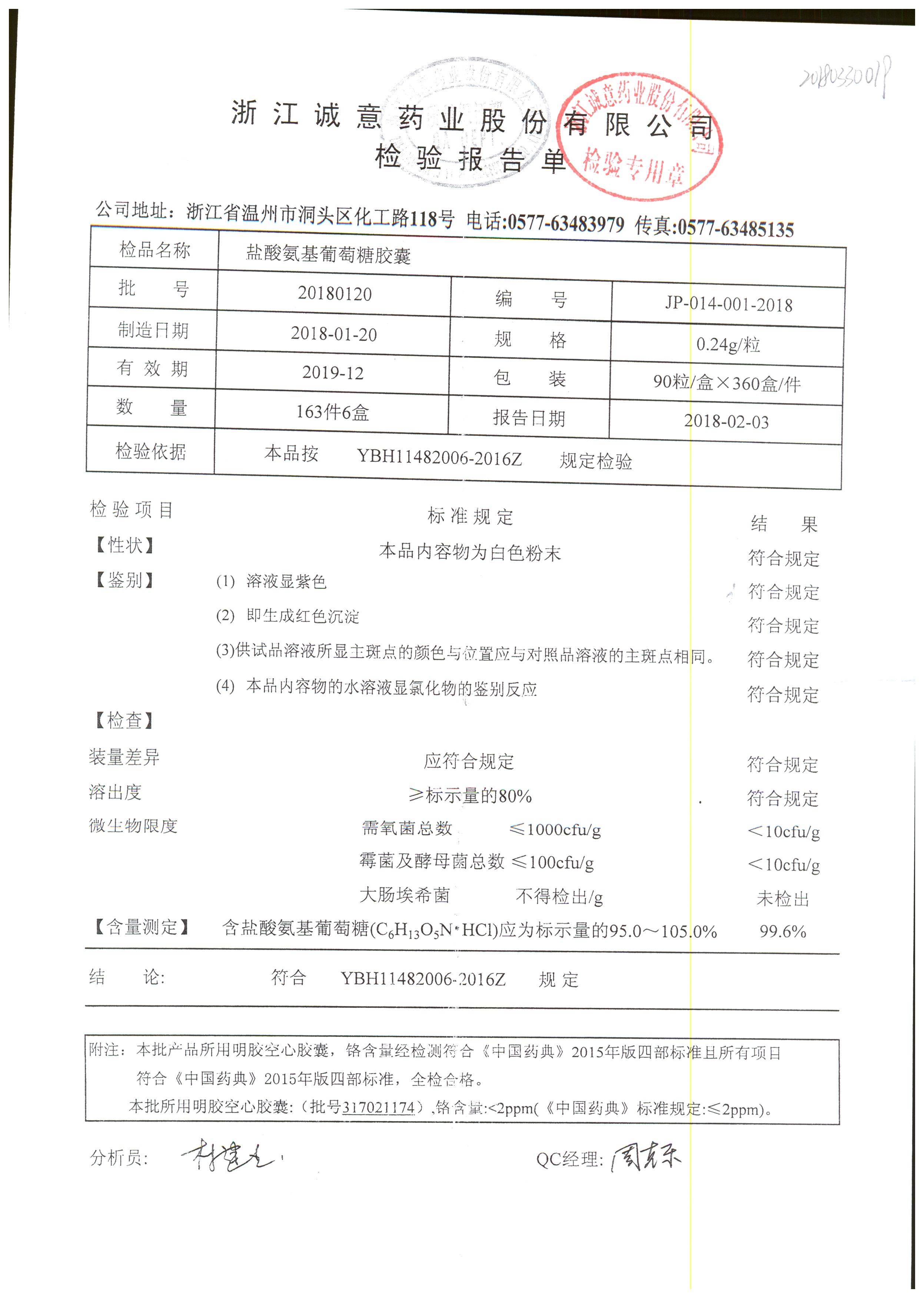 鹽酸氨基葡萄糖膠囊 | 0.24g*90s | 20180120 | 查看詳情 |