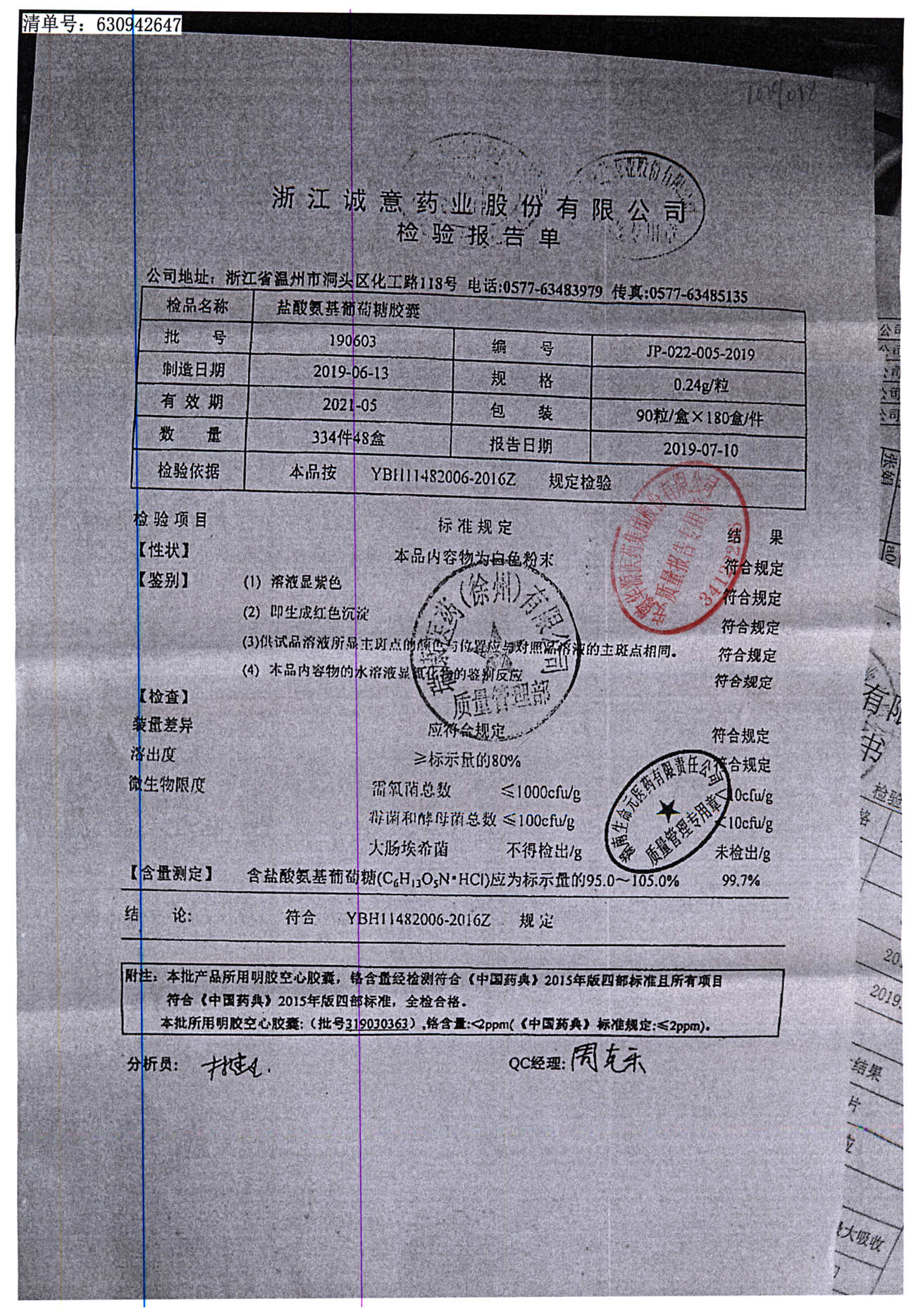 鹽酸氨基葡萄糖膠囊 | 0.24g*90s | 190603 | 查看詳情 |