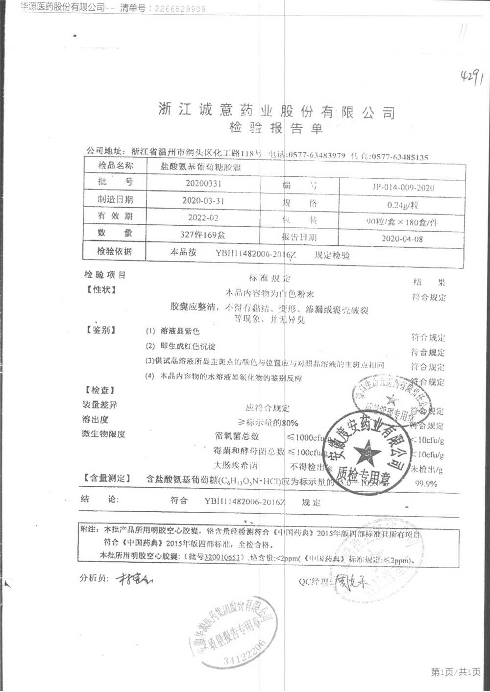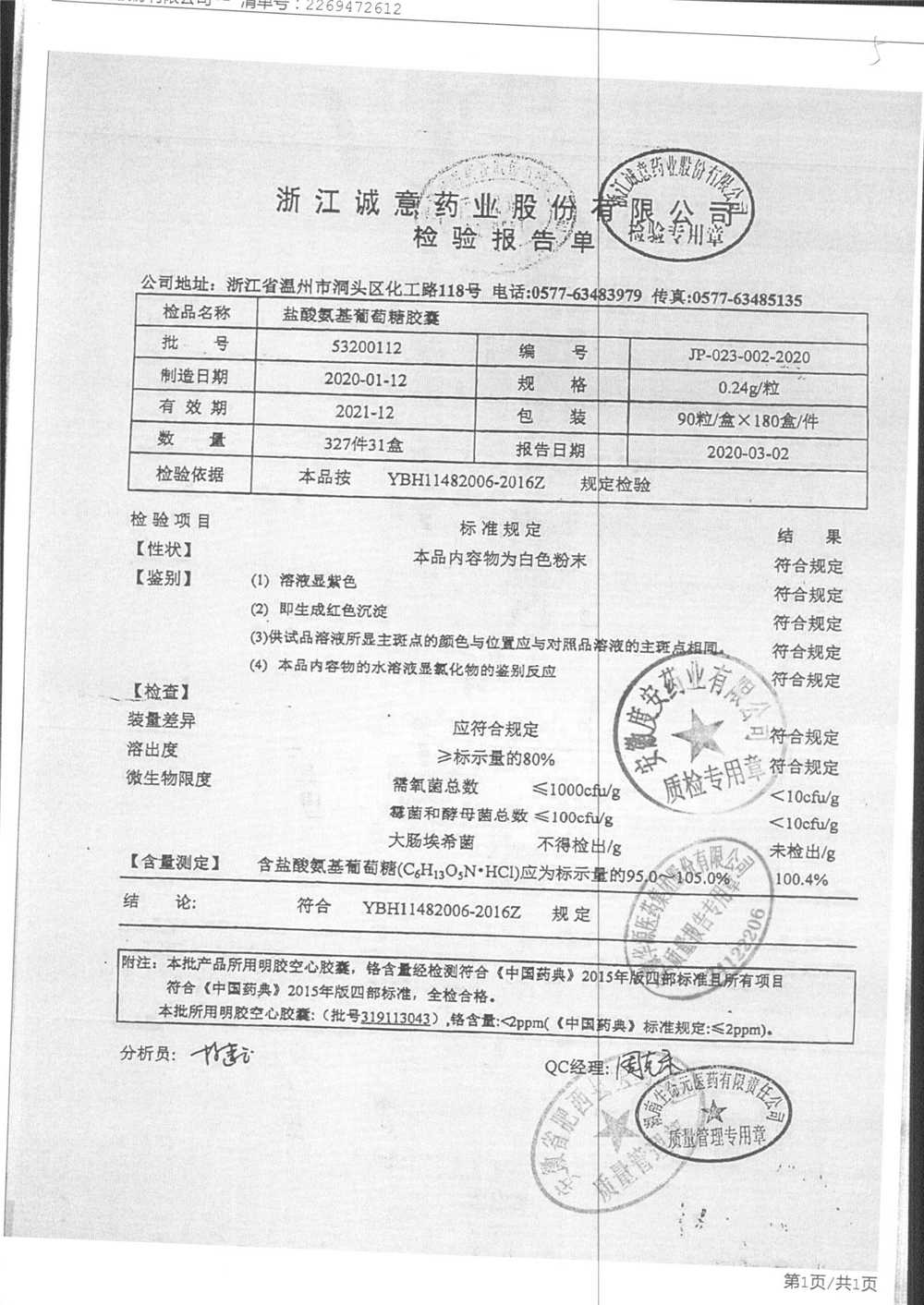 鹽酸氨基葡萄糖膠囊 | 0.24g*90s | 20200331 | 查看詳情 |