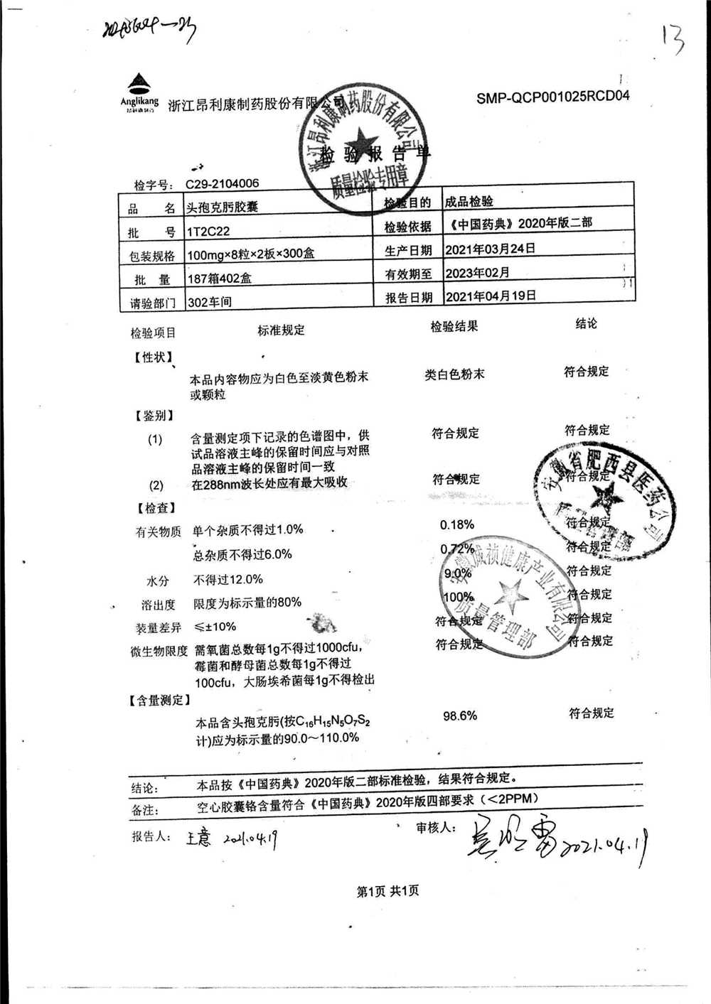 頭孢克肟膠囊 | 100mg*16粒 | 1T2C22 | 查看詳情 |