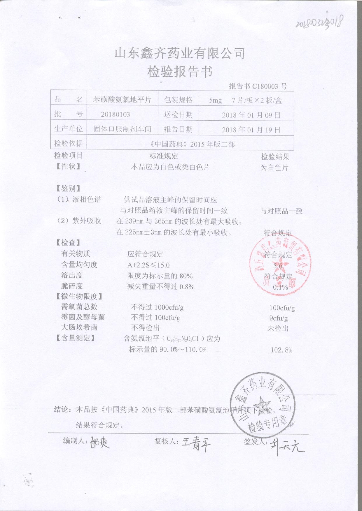苯磺酸氨氯地平片 | 5mg*14s | 20180103 | 查看詳情 |