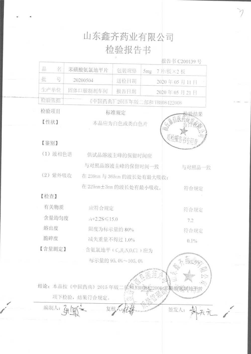 苯磺酸氨氯地平片 | 5mg*14s | 20200504 | 查看詳情 |