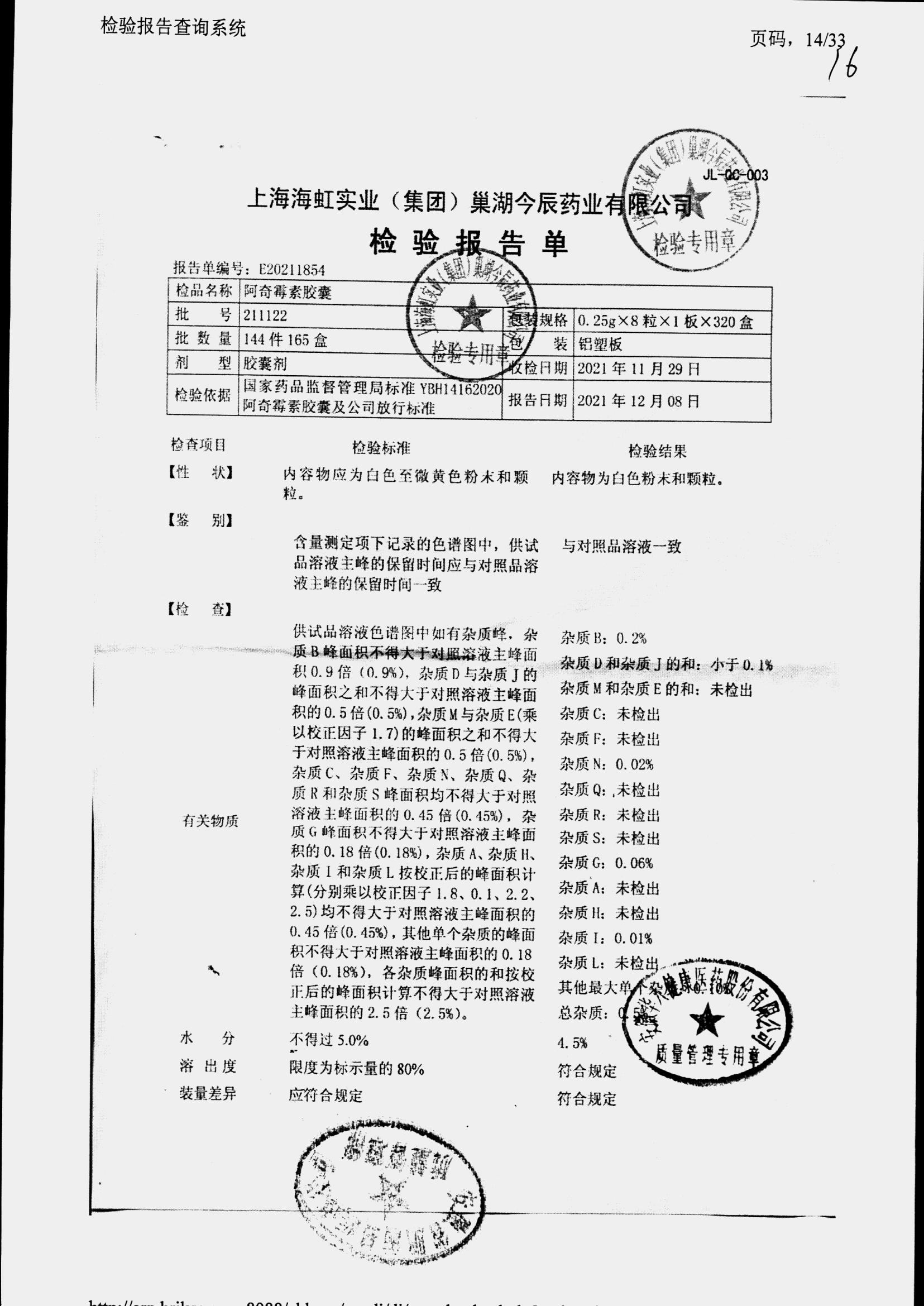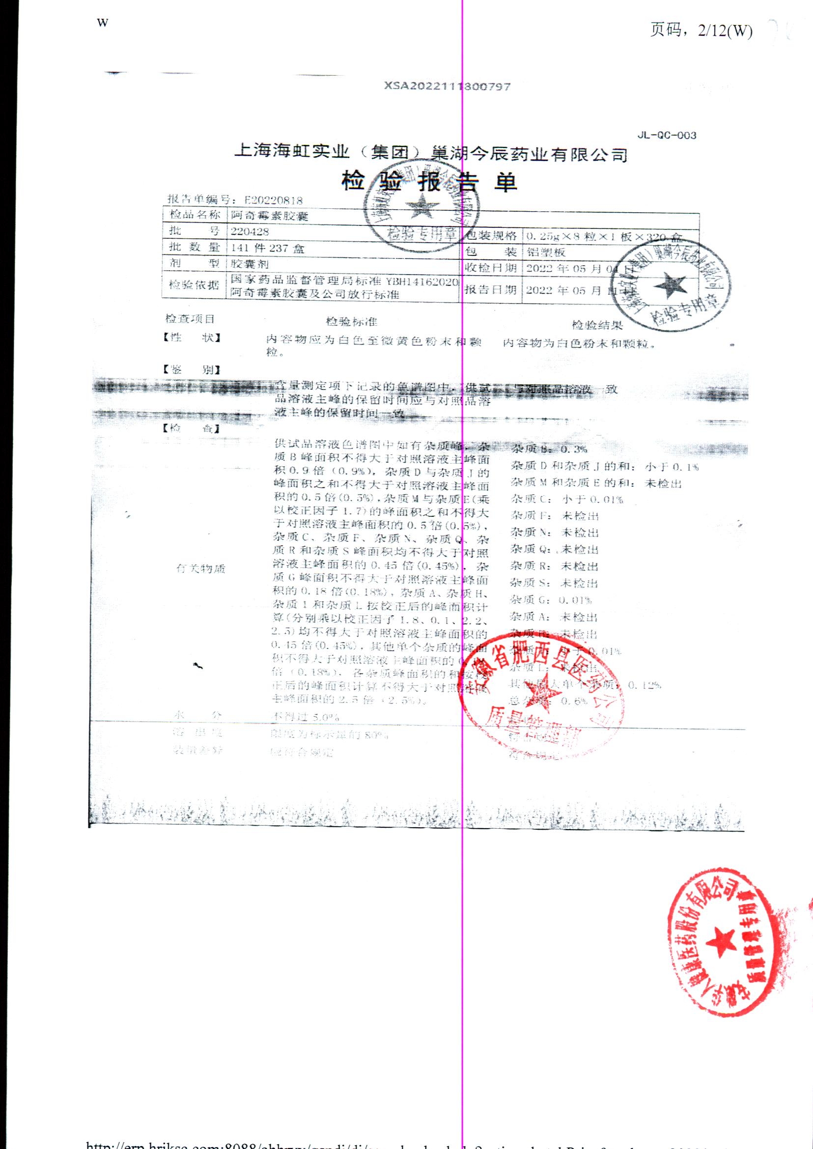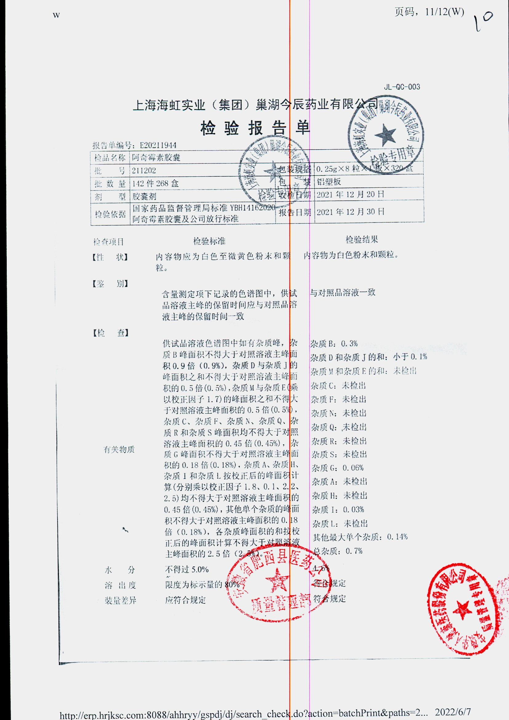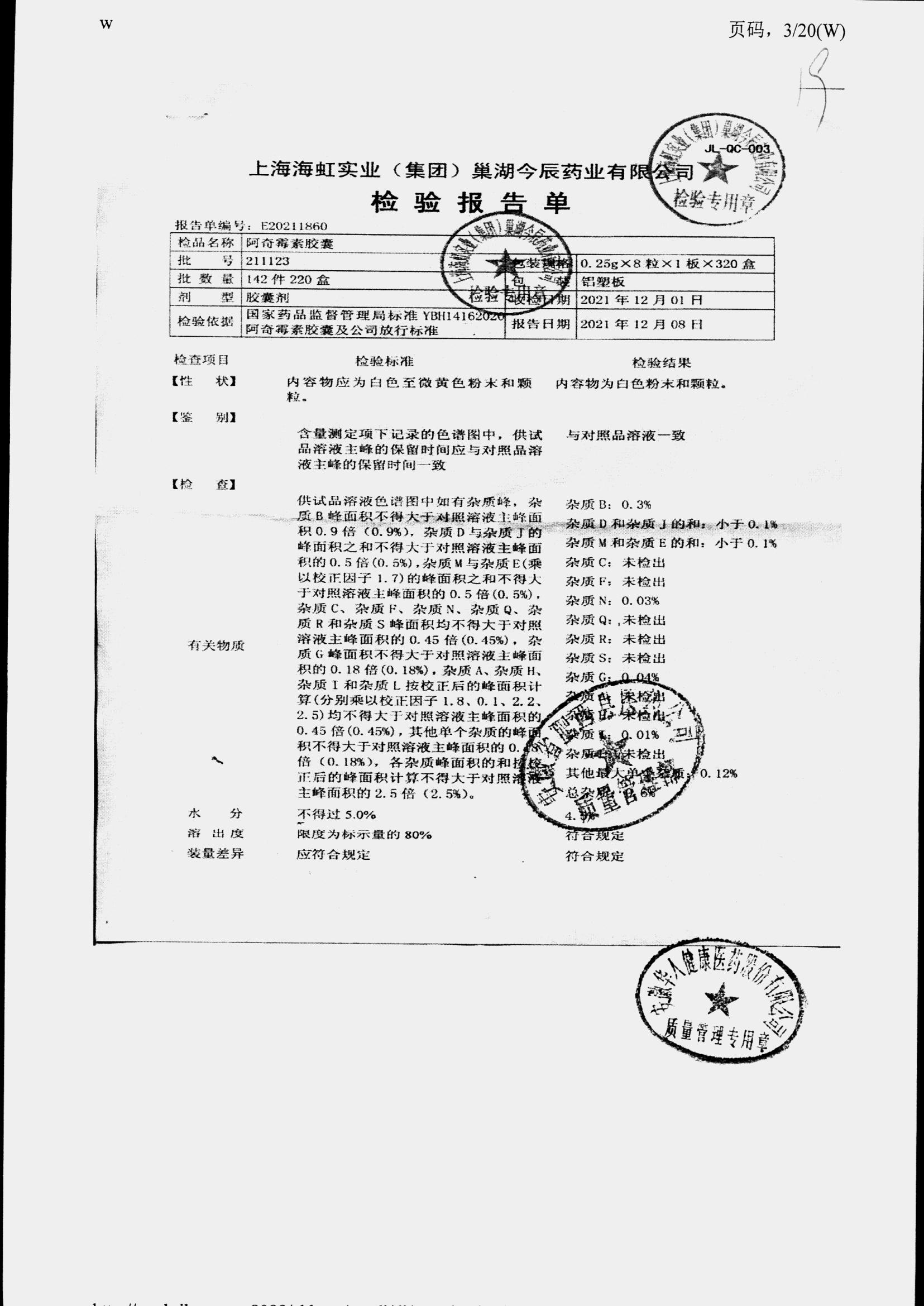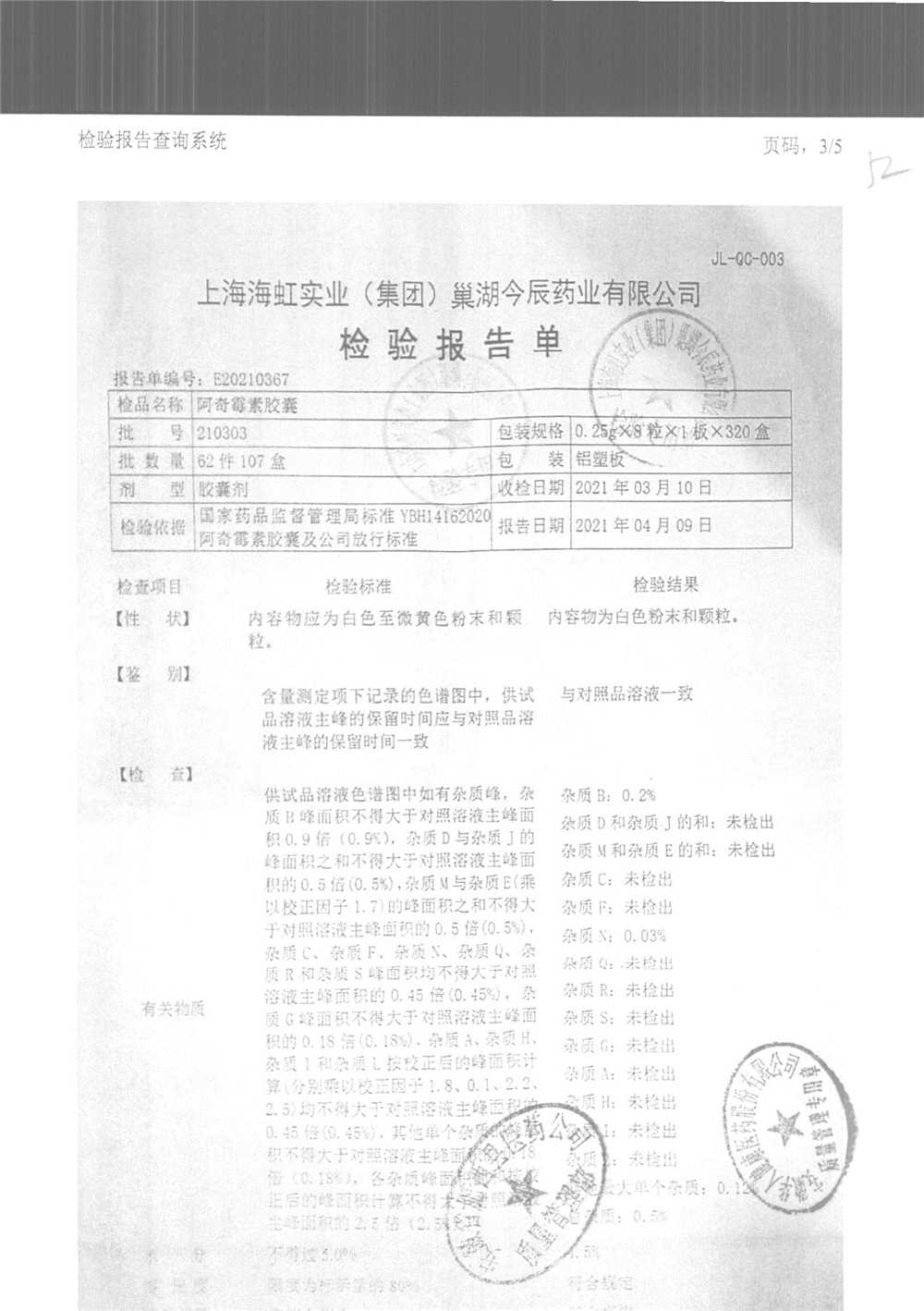 阿奇霉素膠囊 | 0.25g*8s | 210303(1/2) | 查看詳情 |