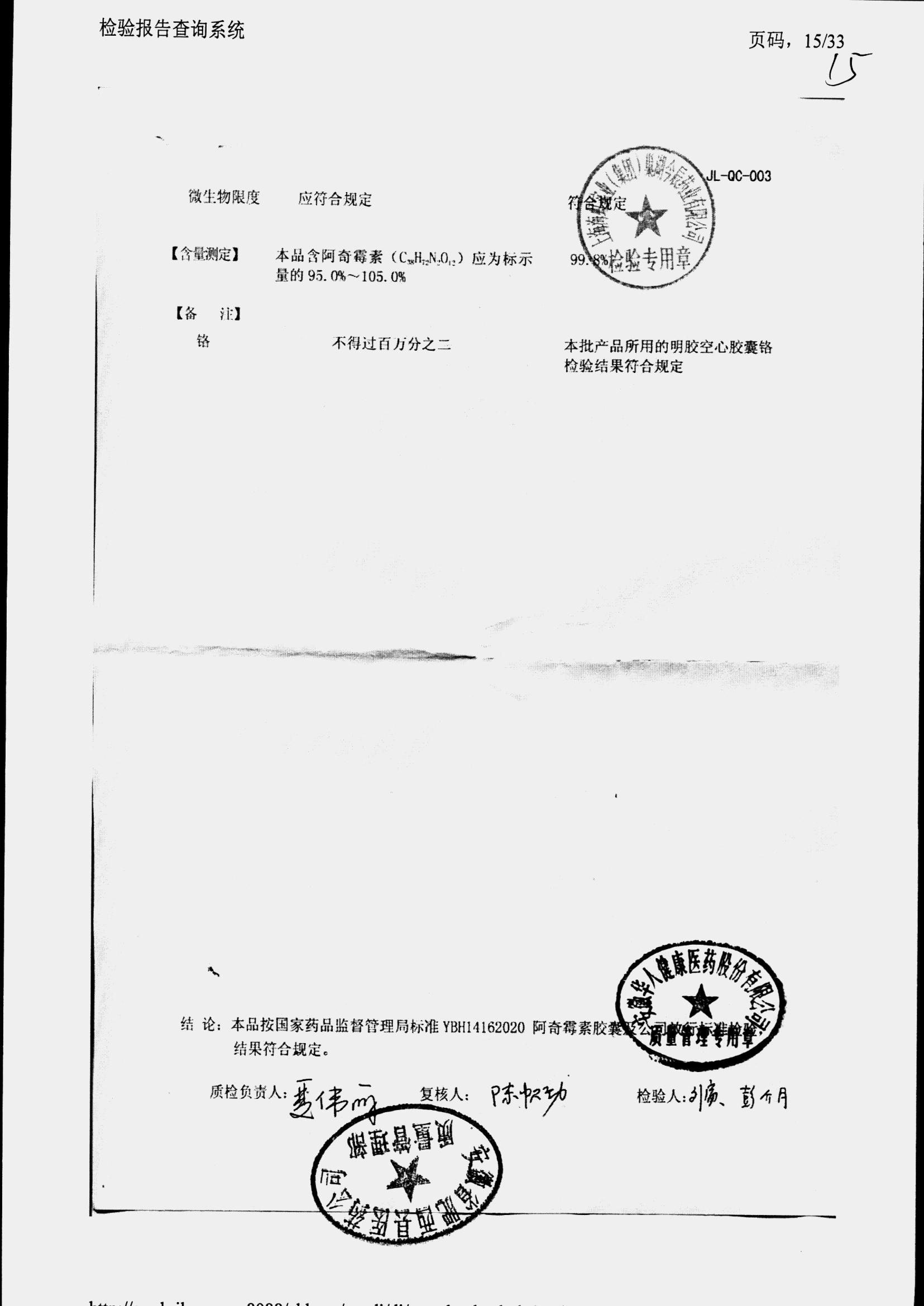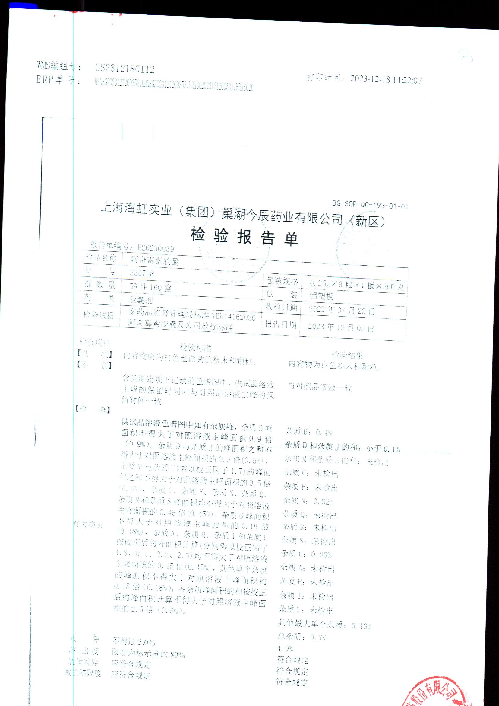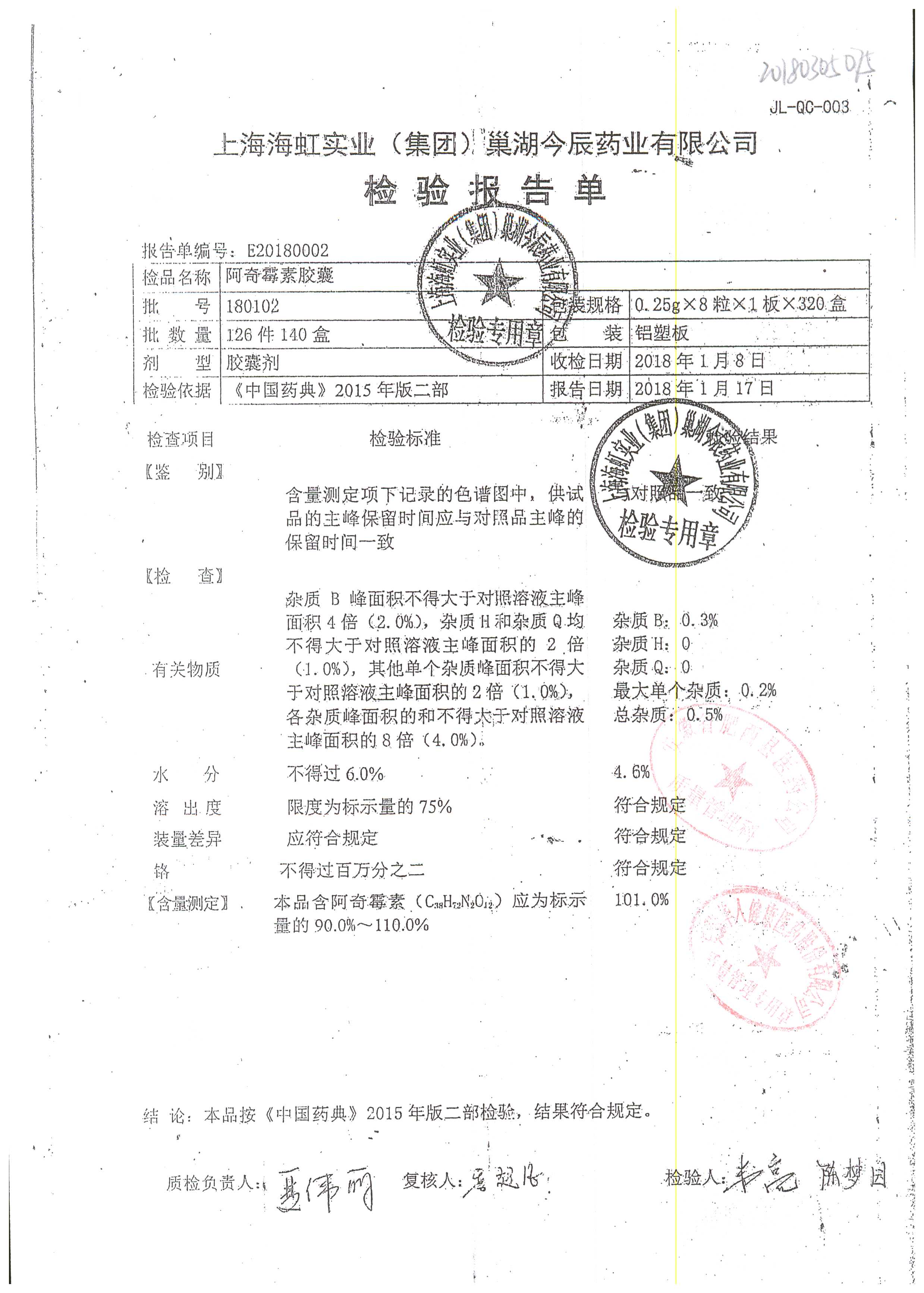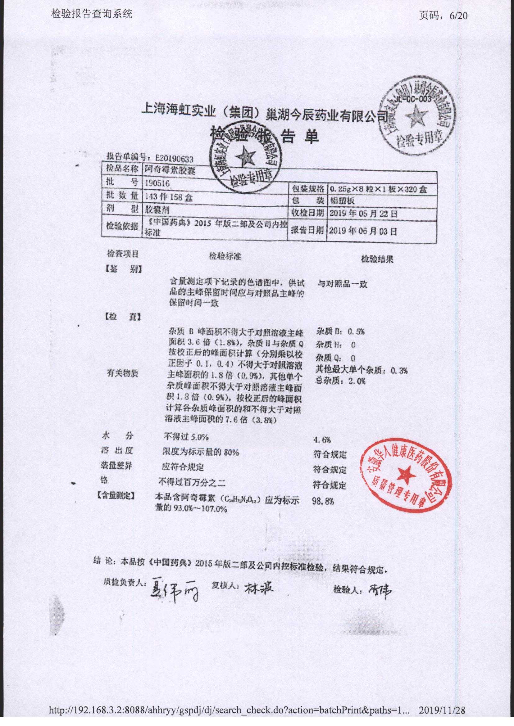 阿奇霉素膠囊 | 0.25g*8s | 210303(1/2) | 查看詳情 |