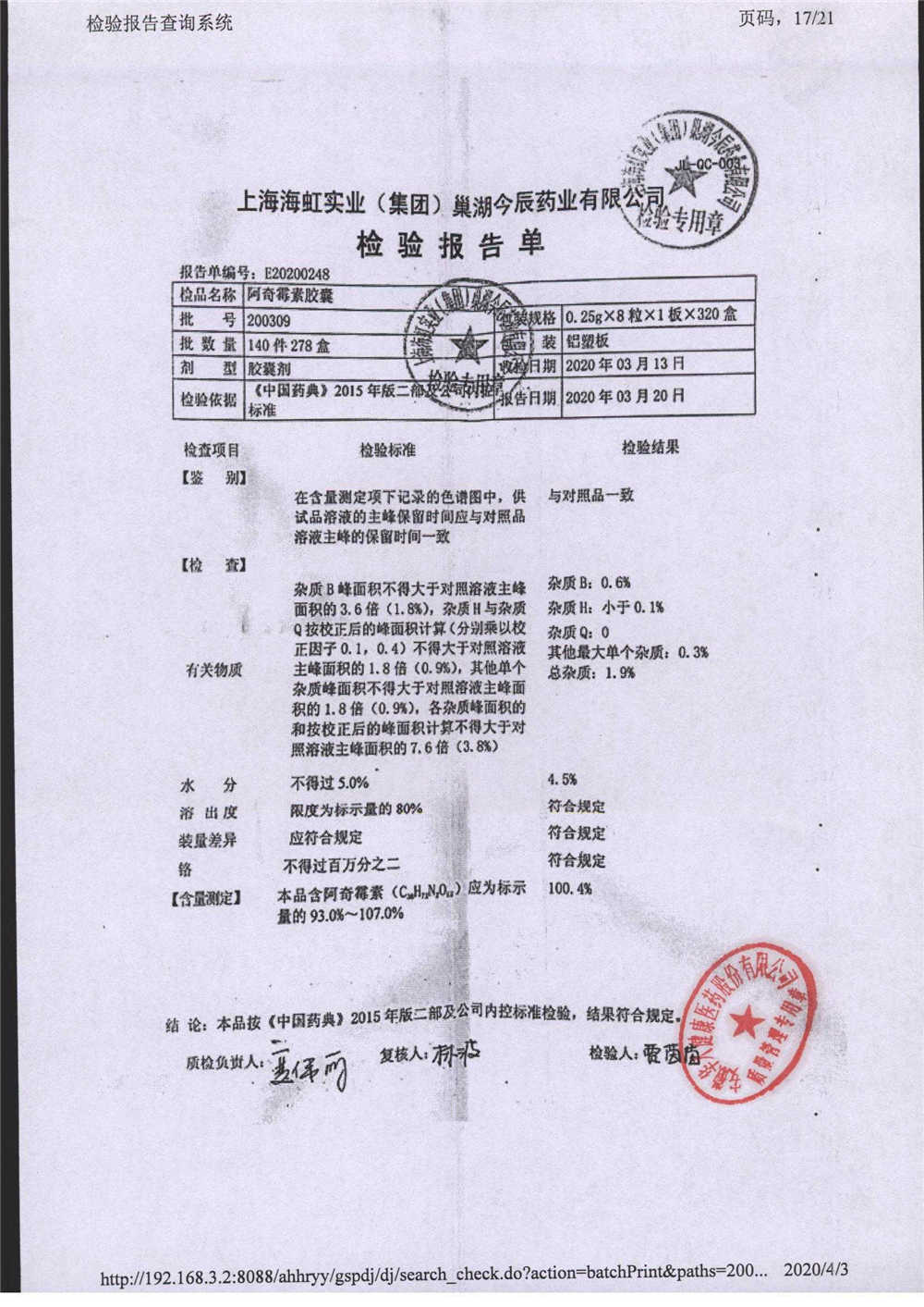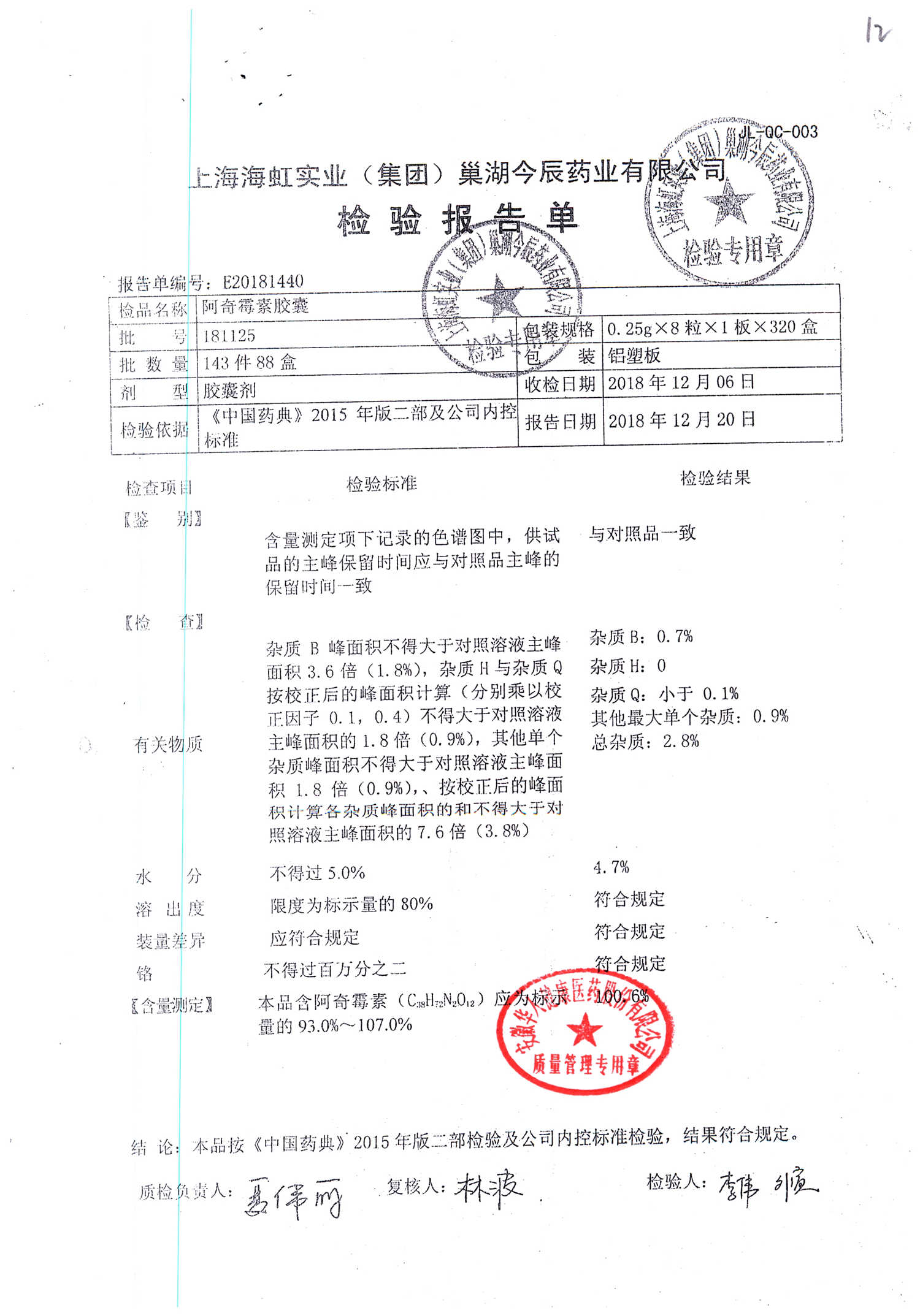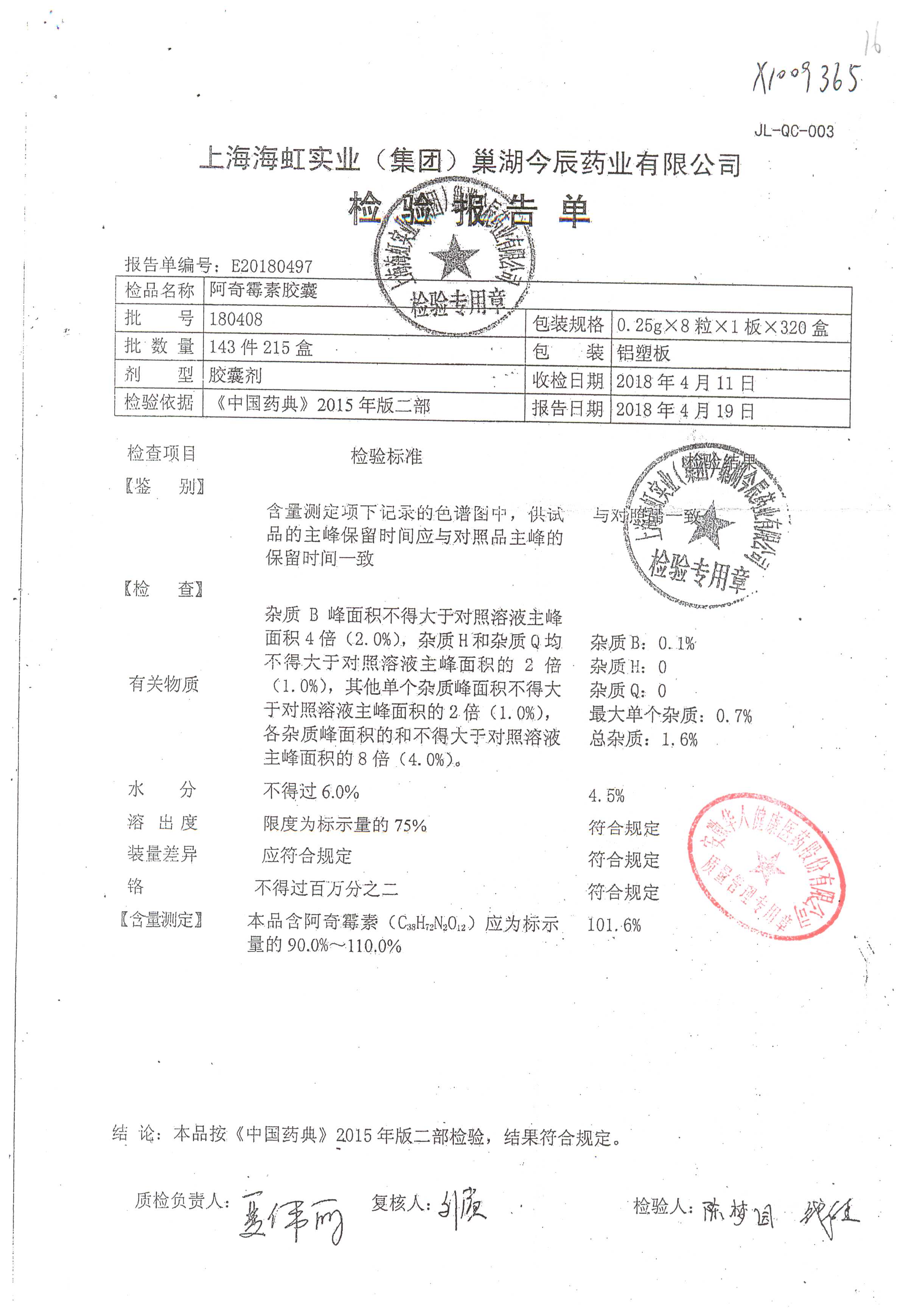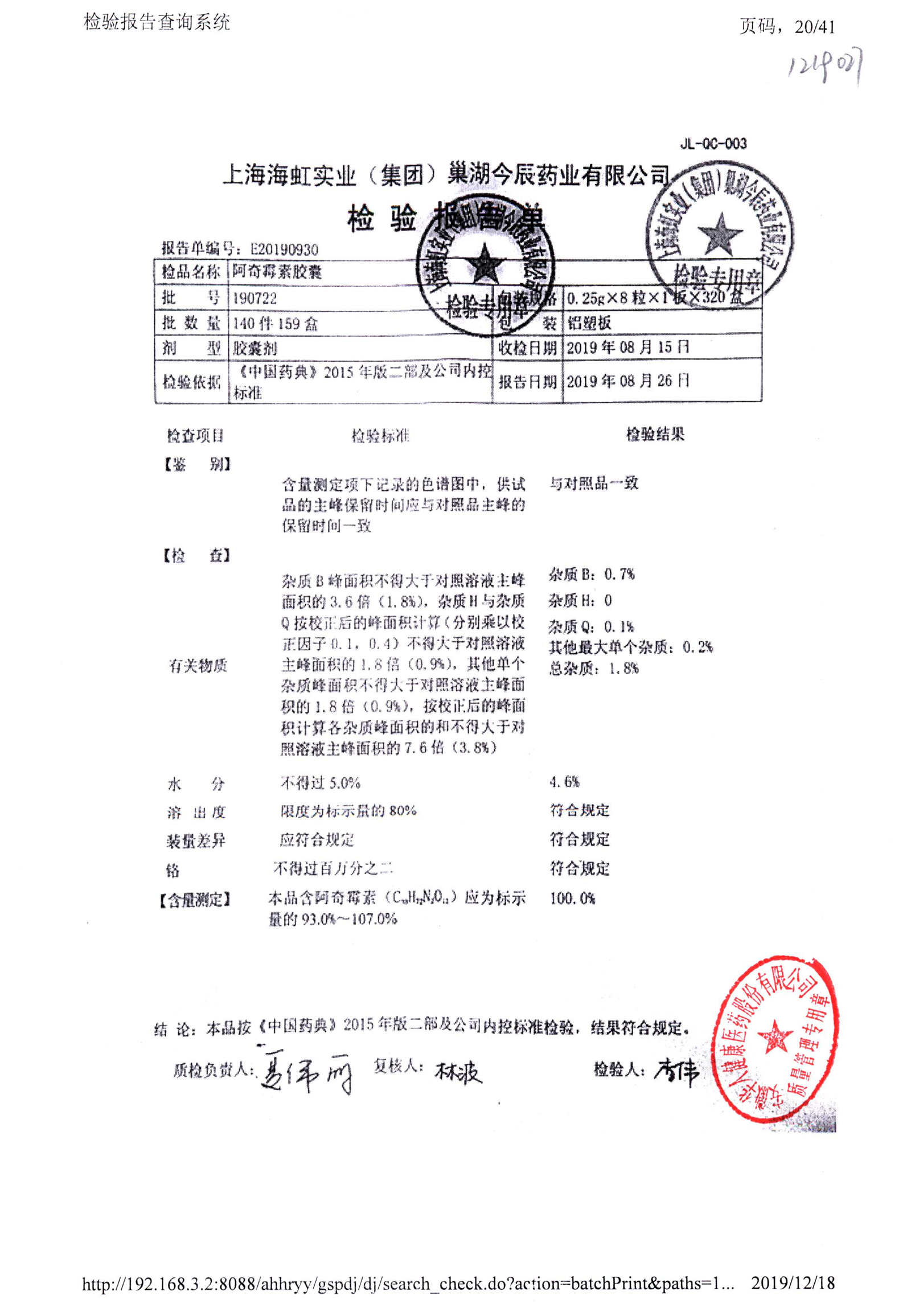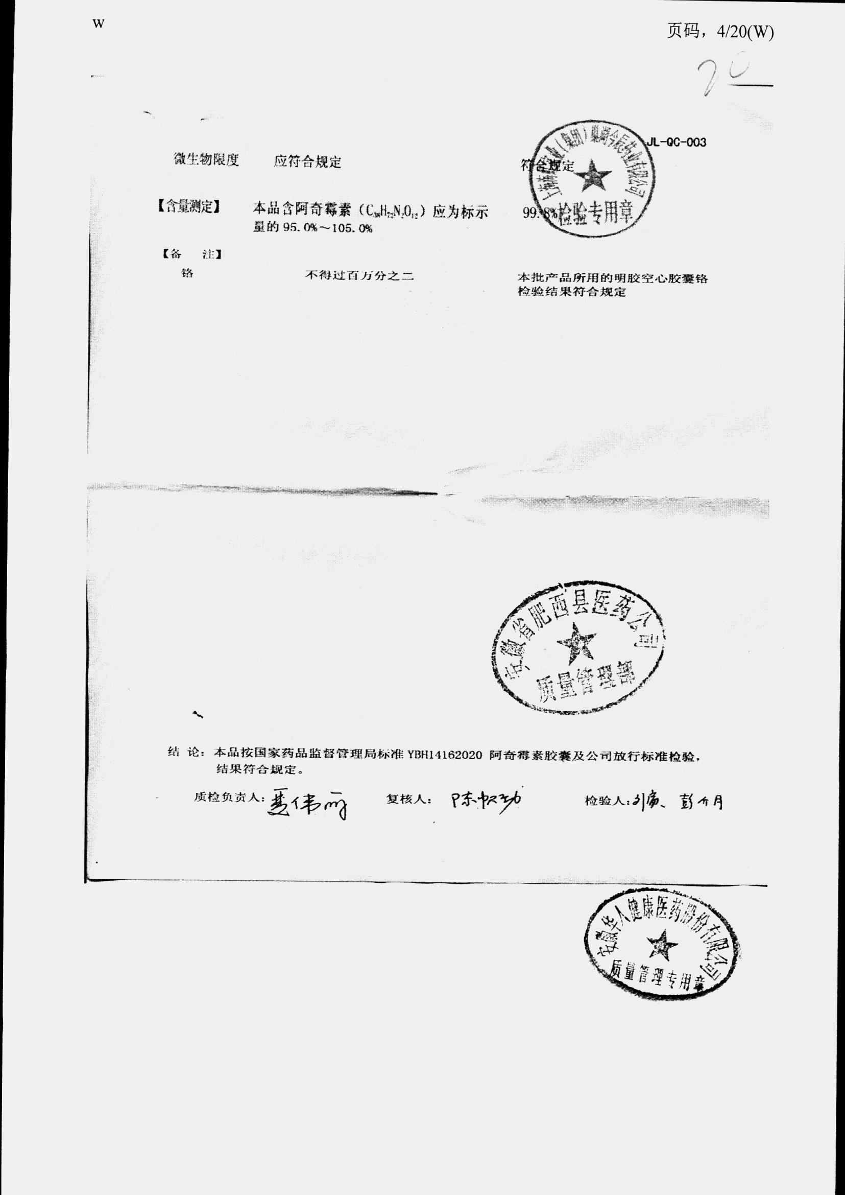 阿奇霉素膠囊 | 0.25g*8s | 210303(1/2) | 查看詳情 |