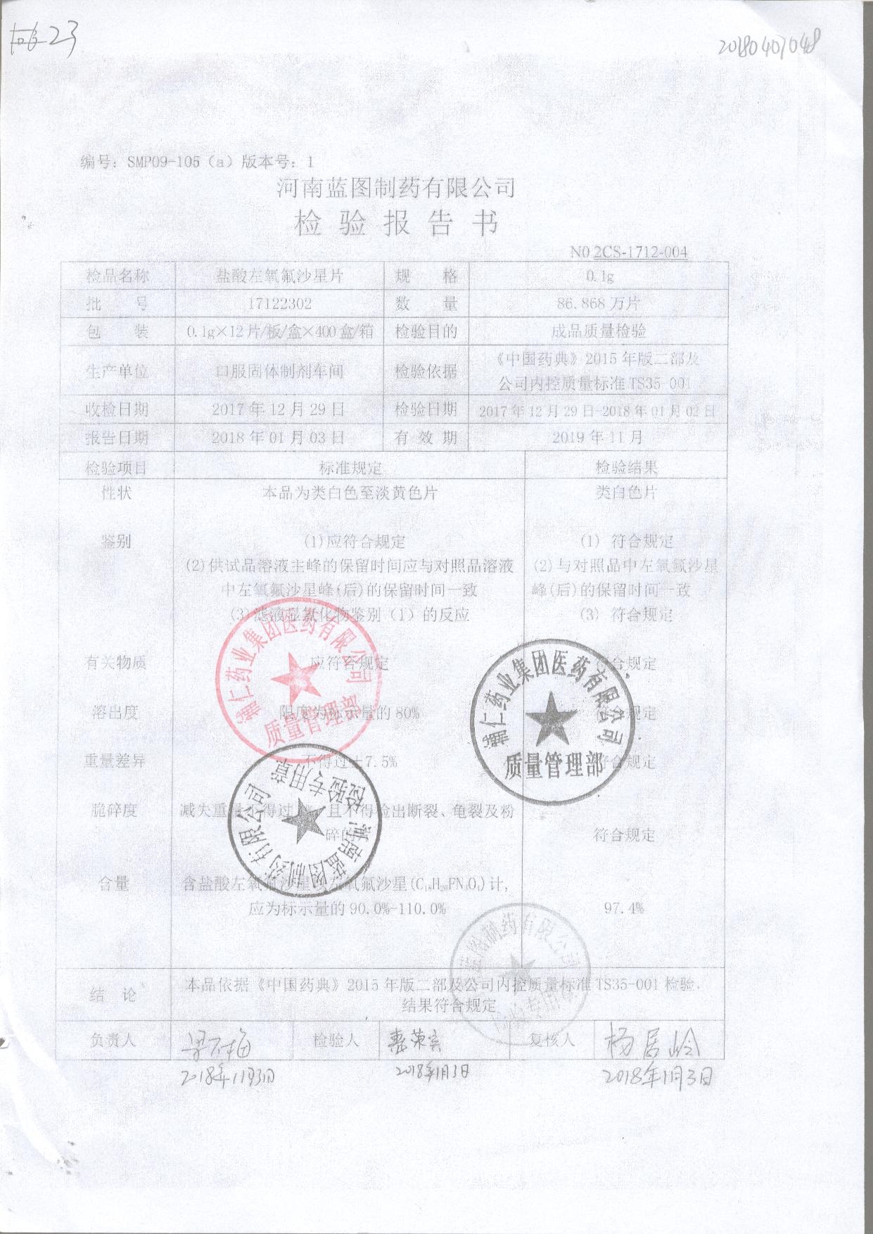鹽酸左氧氟沙星片 0.1g*12片 17122302 查看詳情