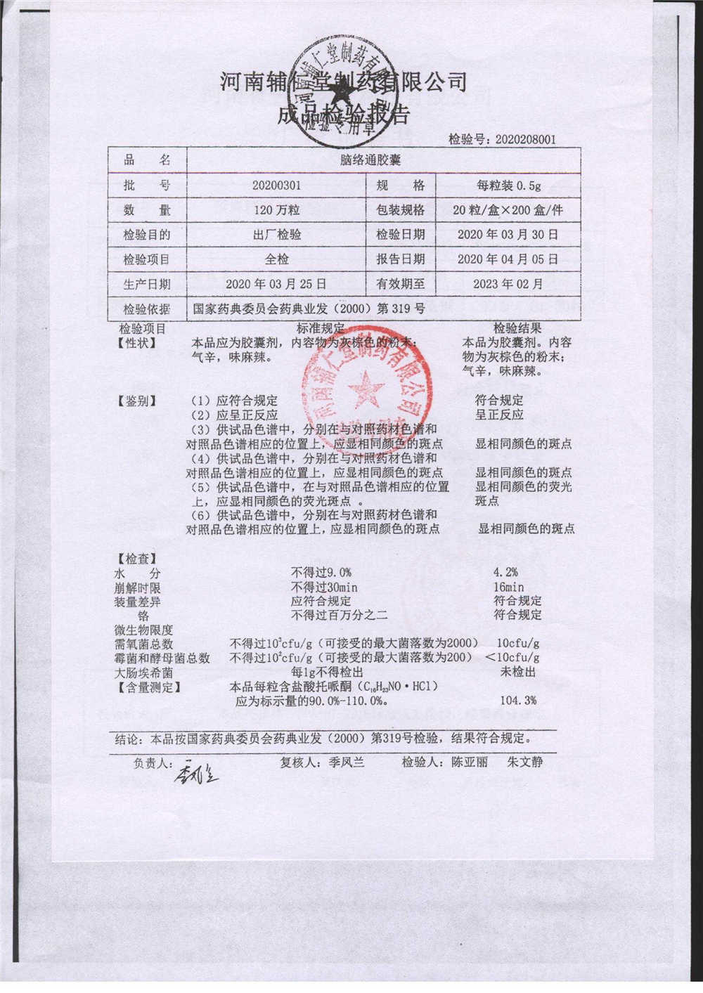 腦絡(luò)通膠囊 | 0.5g | 20200301 | 查看詳情 |